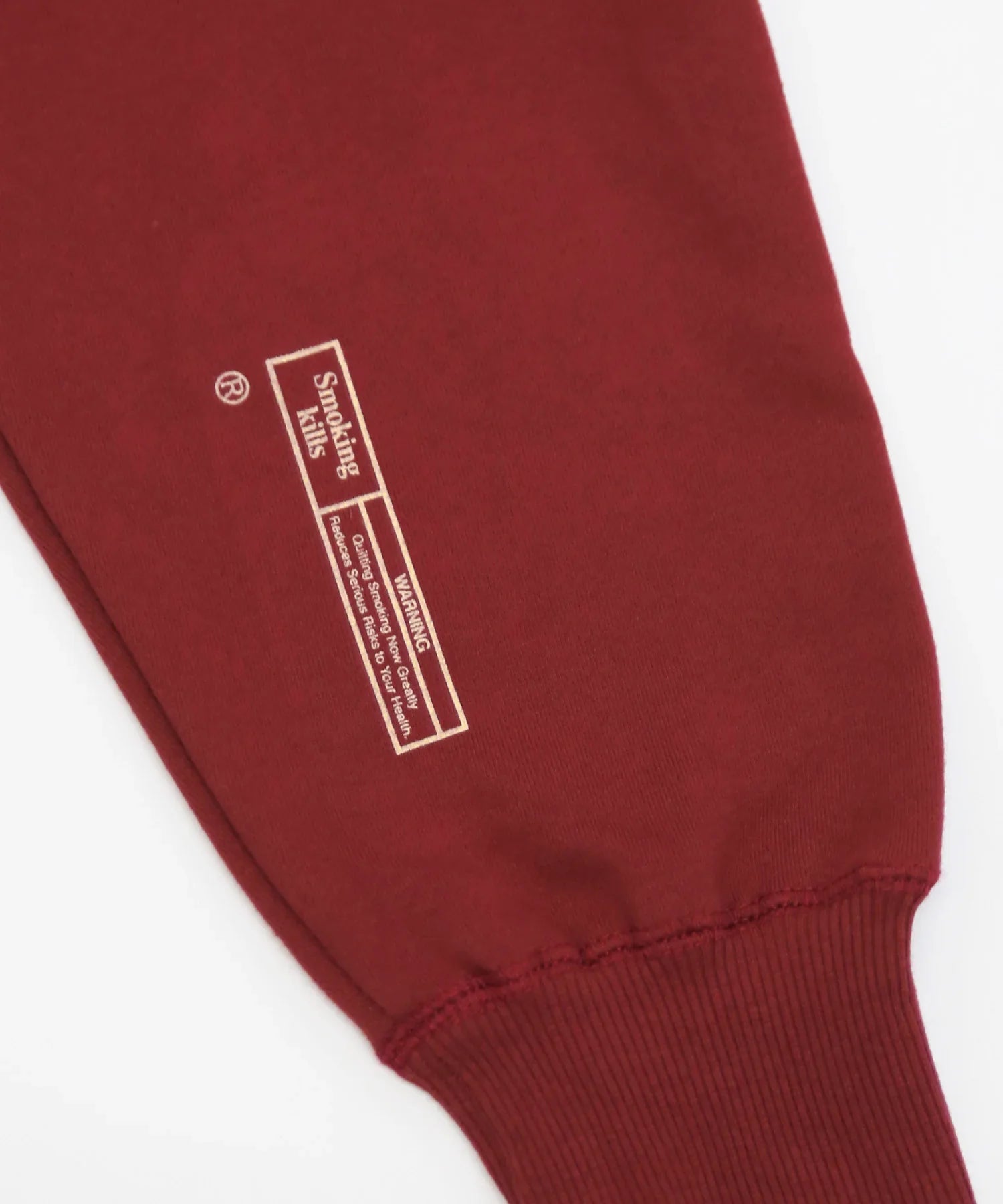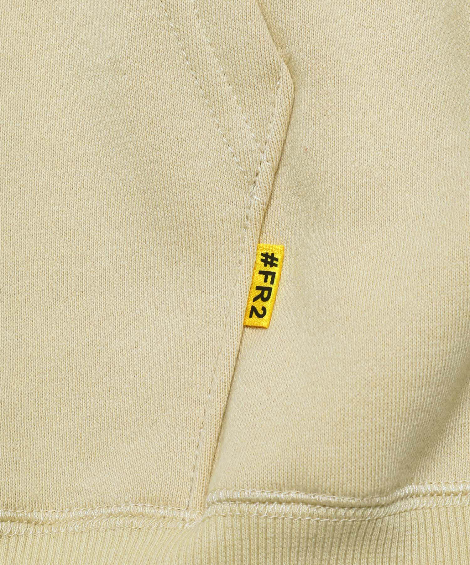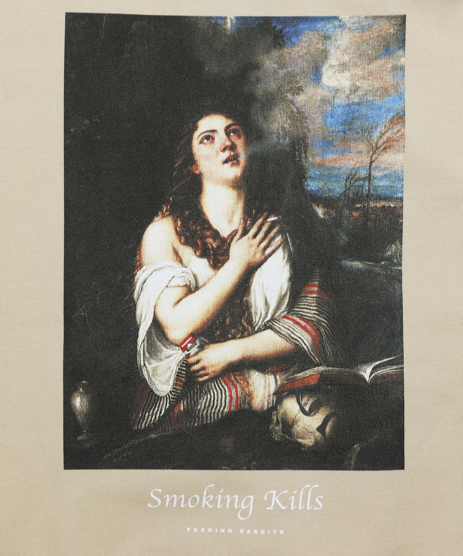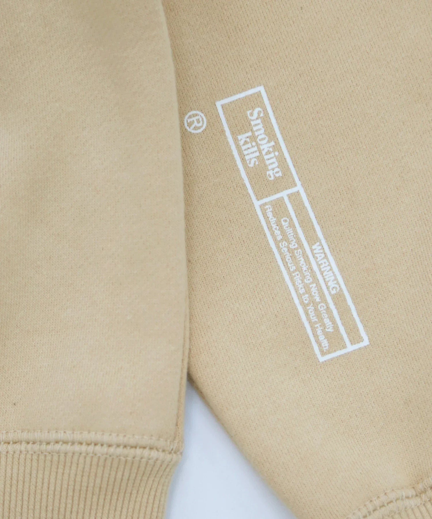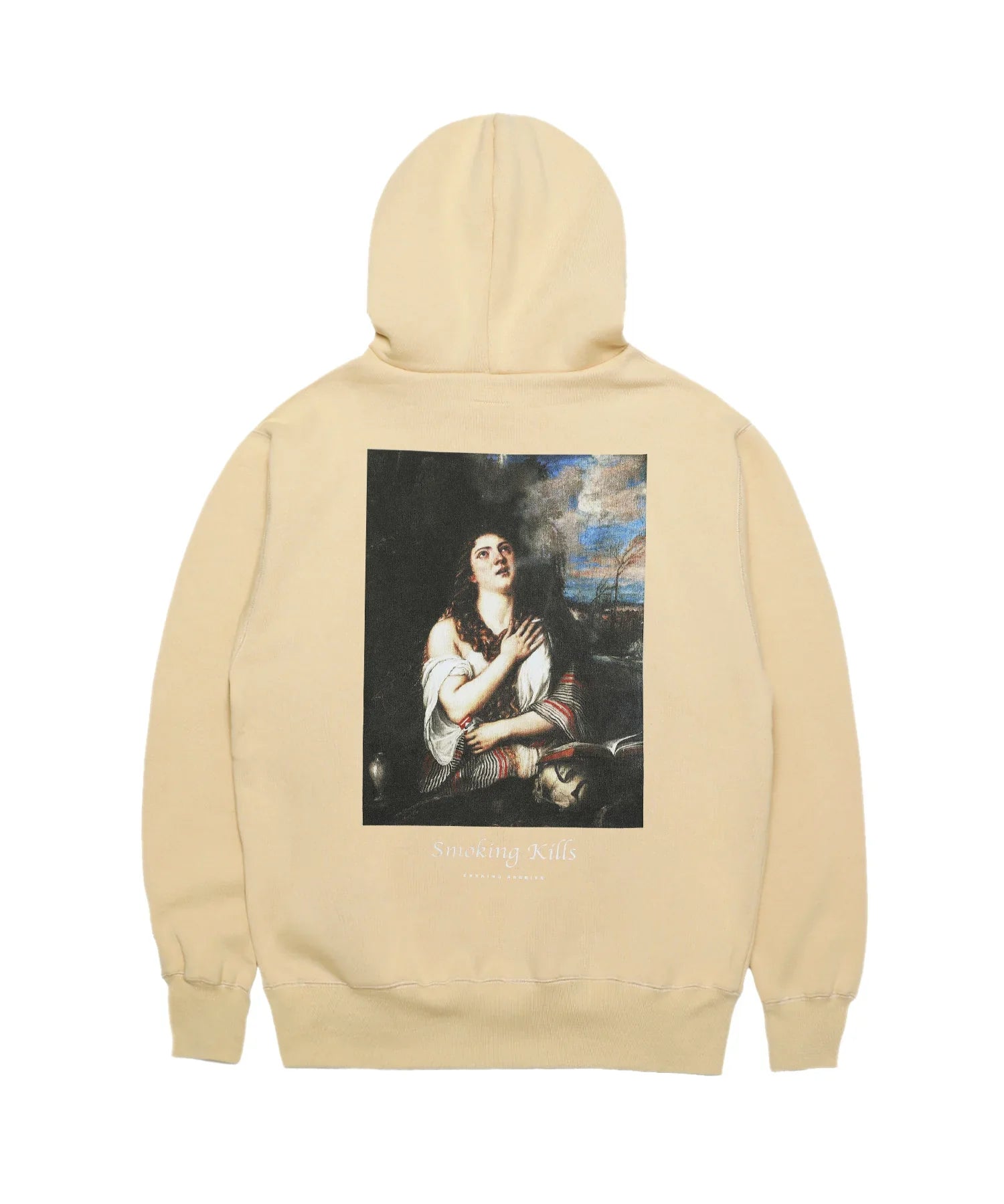 A Hoodie with a large print on the back that looks like a painting. The "Smoking kills" logo is also placed on the front. and it is a piece full of messages like # FR2.
