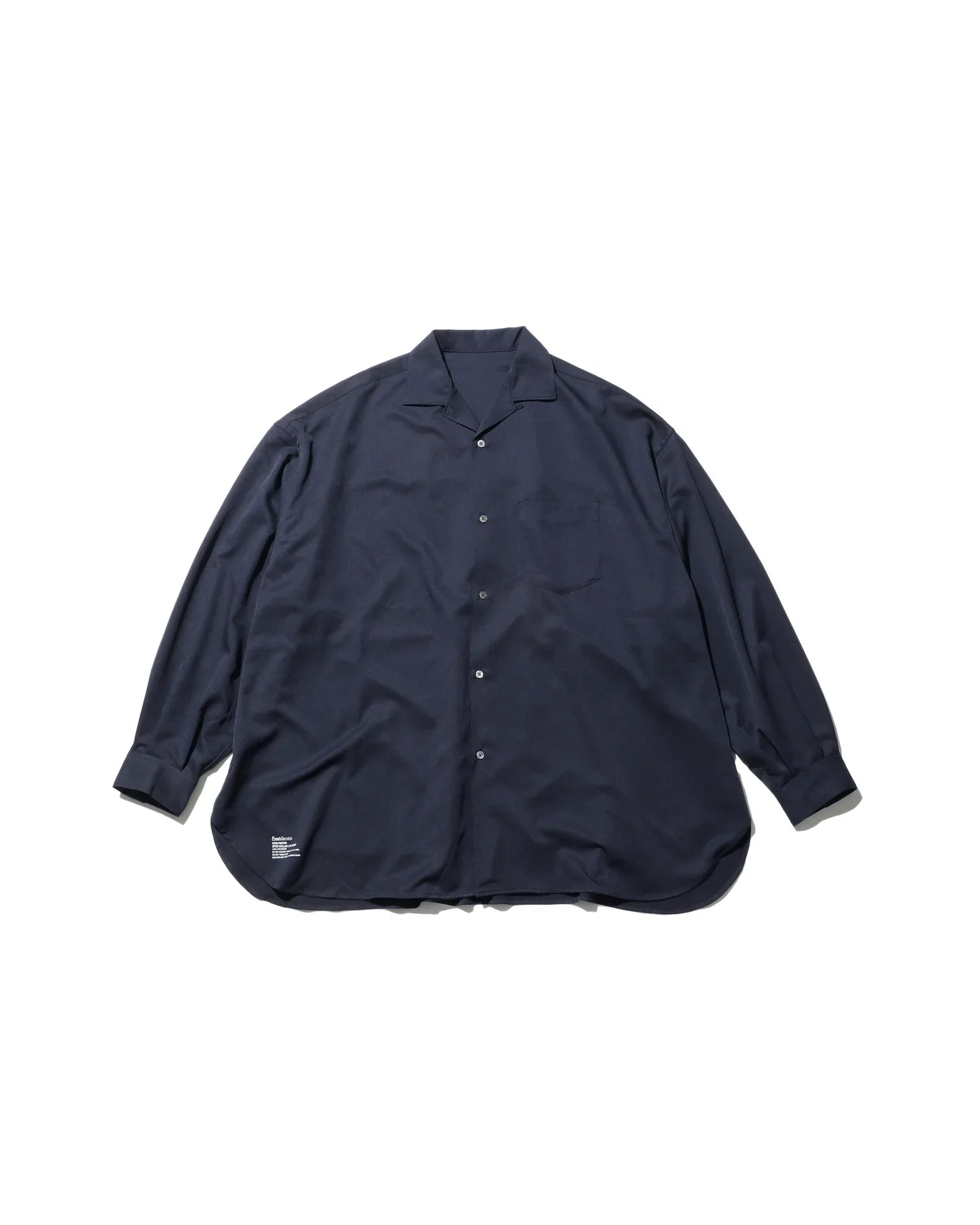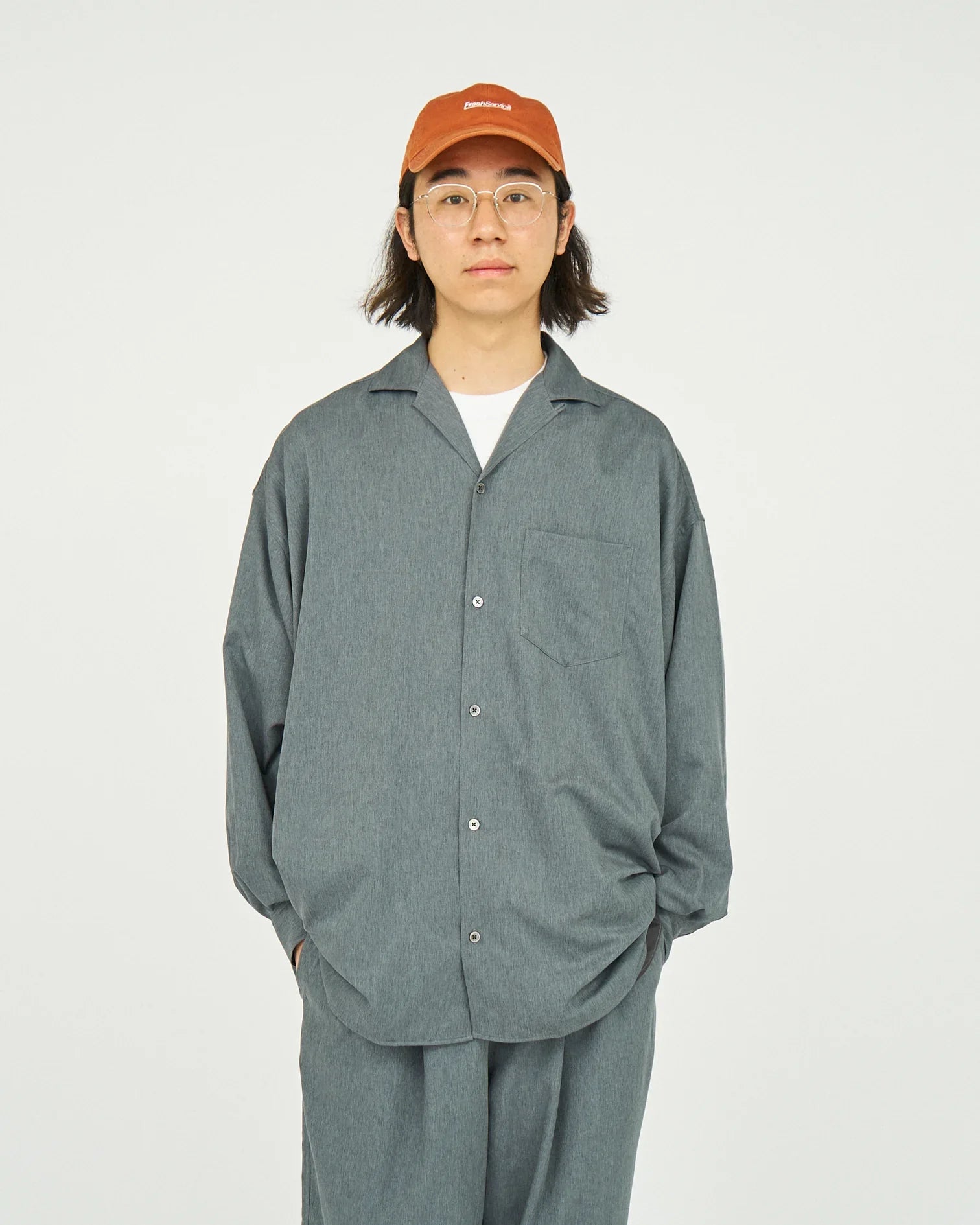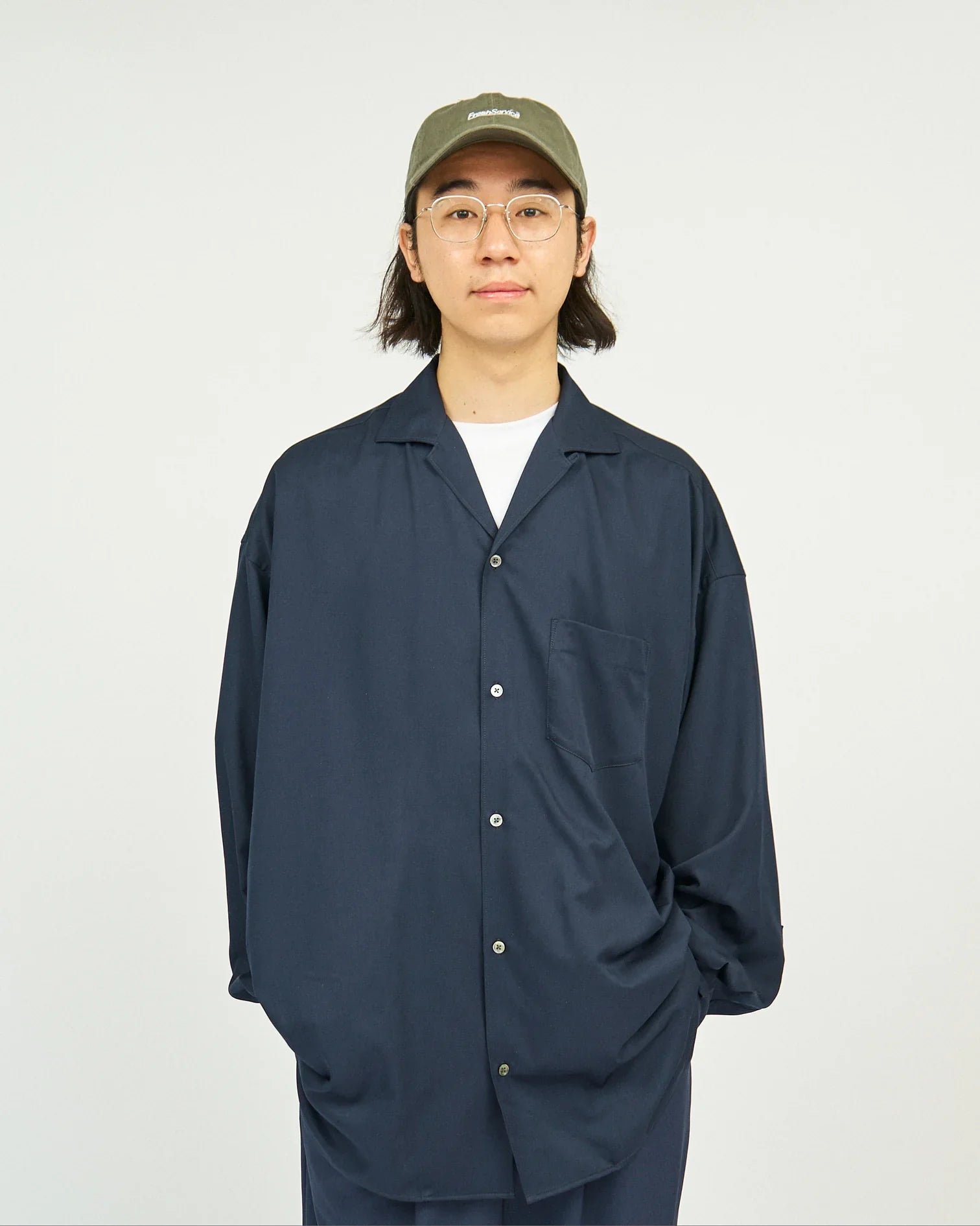 An open collar shirt that is supple and soft to the touch. giving you a relaxed feel. The material is COOLFIBER. which quickly absorbs sweat and releases it to the outside. giving you a cool. dry and comfortable feel every time you touch it. His loose. boxy silhouette has a large pocket hidden in the side seam.