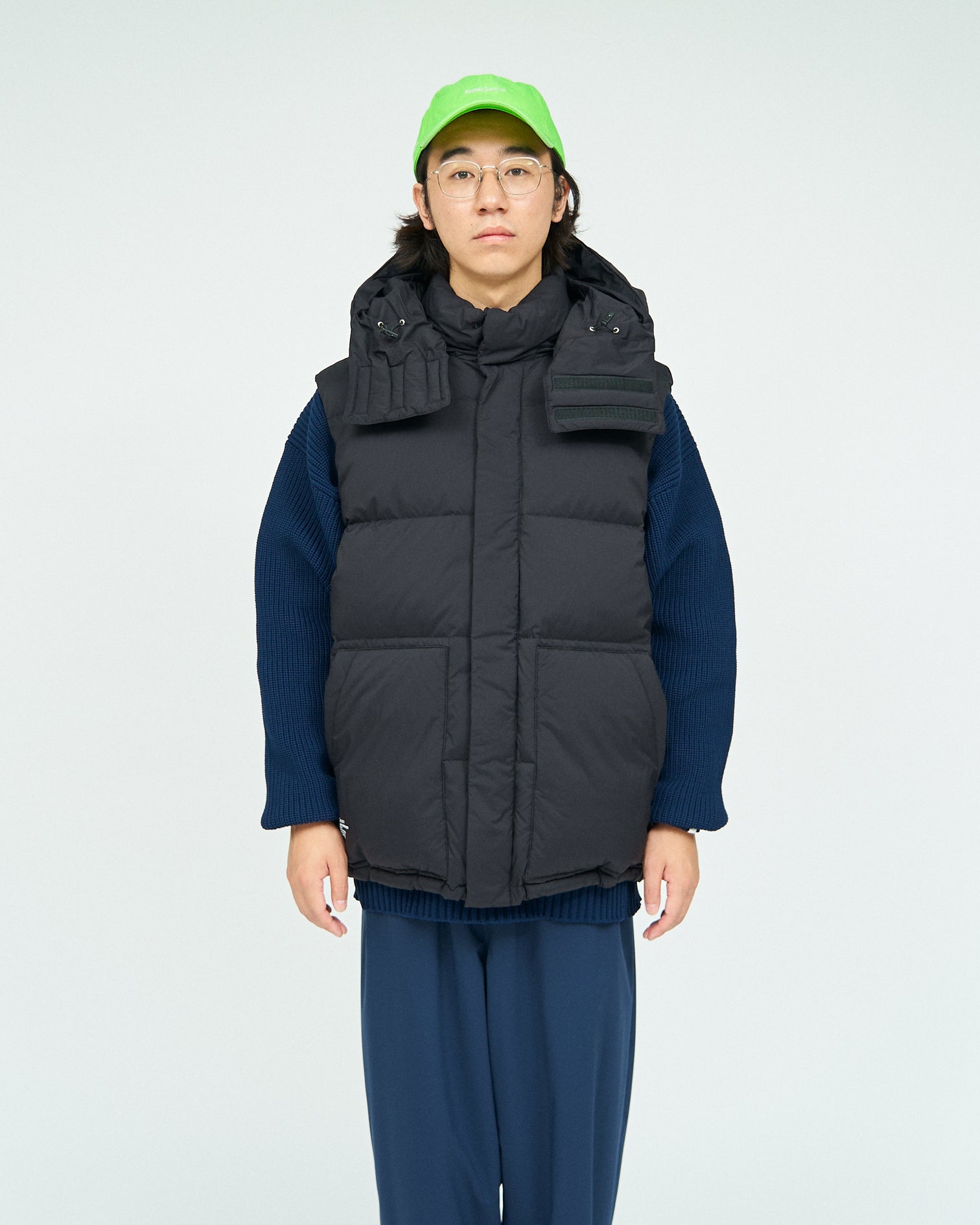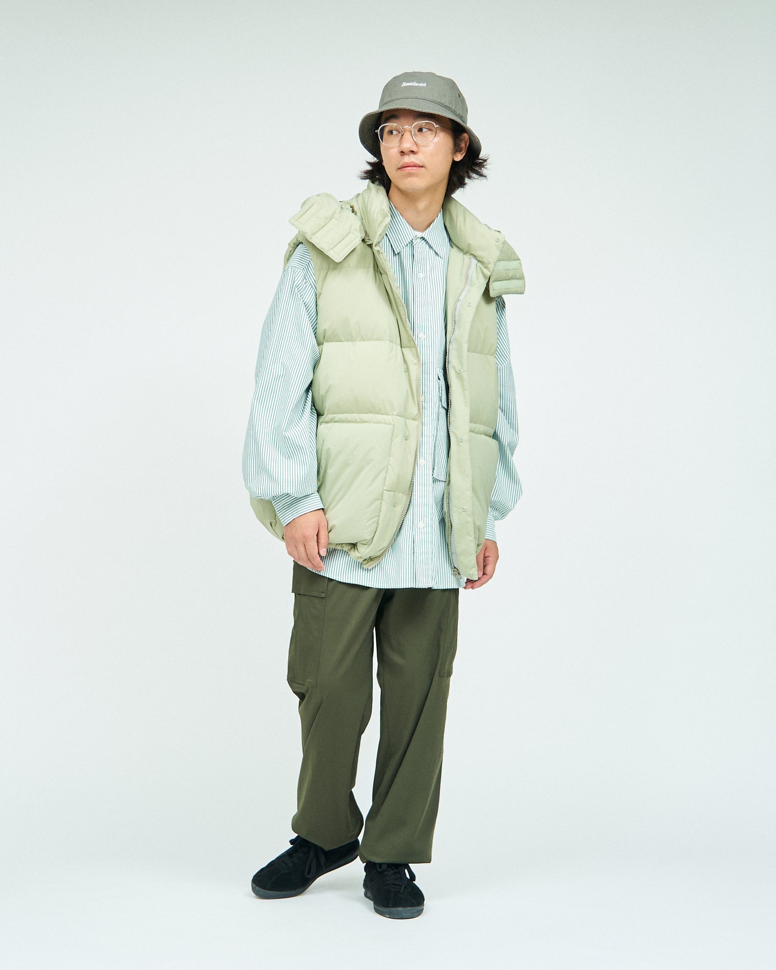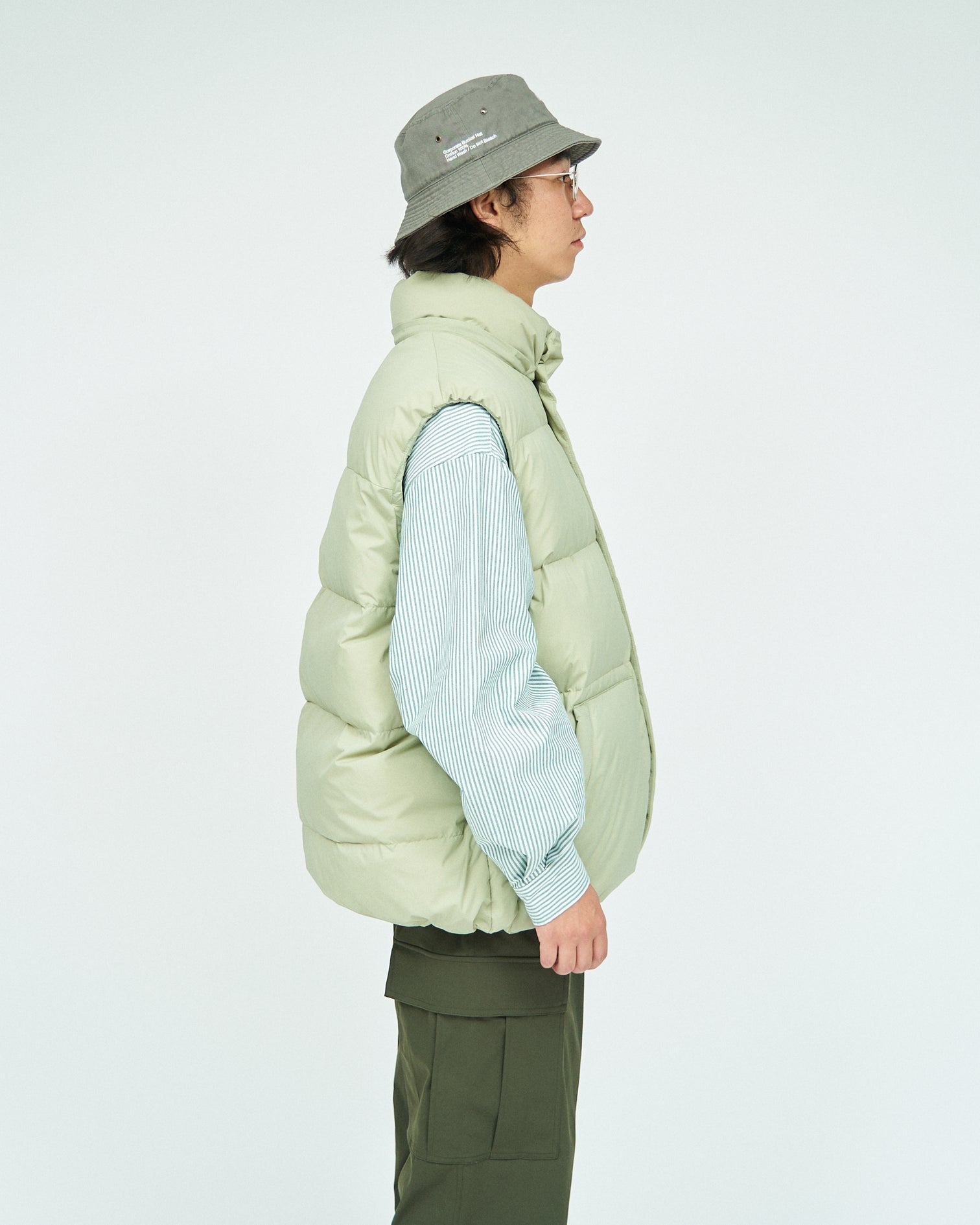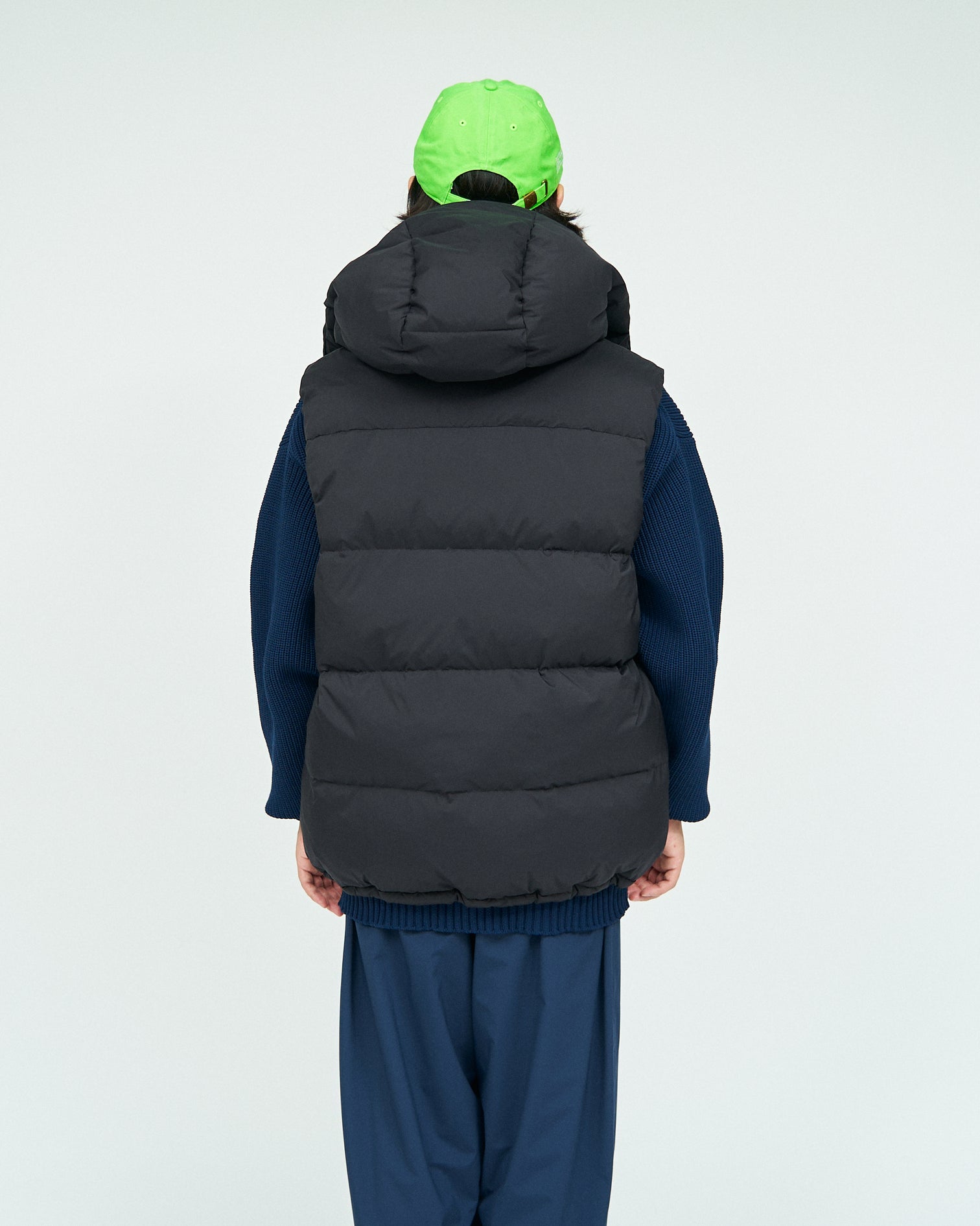 A corporate down vest inspired by the uniform of a fictional delivery company. The body has been updated to micro ripstop nylon 66. which is highly abrasion resistant and smooth to the touch. The outer surface is water repellent. and the inner surface is coated with a water-resistant and breathable coating. making it comfortable to wear in both urban and light outdoor situations. While it has a voluminous form typical of FreshService. the drawstring at the hem allows you to adjust the silhouette. and it is also attractive for its stress-free lightness. In addition to a detachable hood. you can find a style that suits your taste with a wide range of colors.