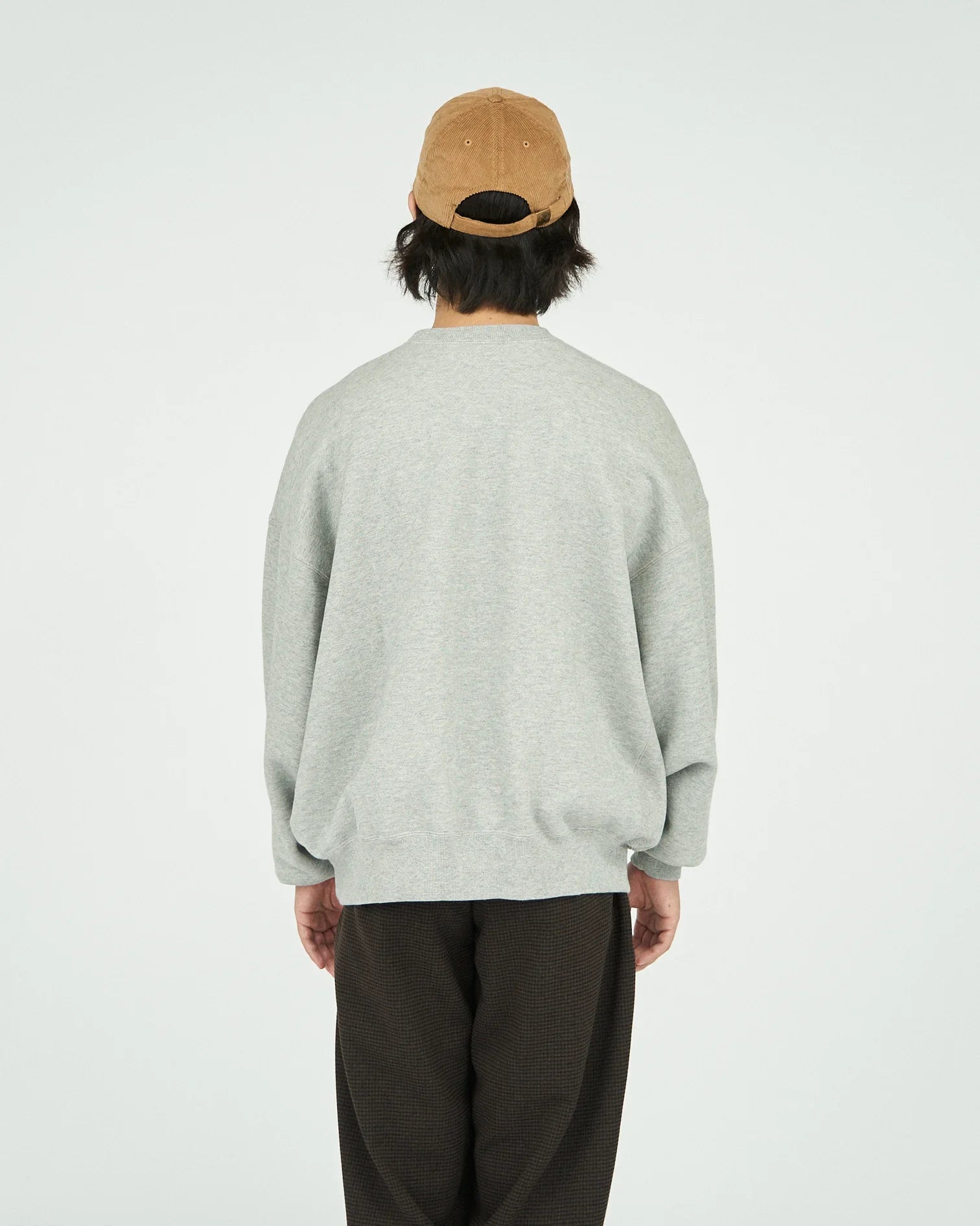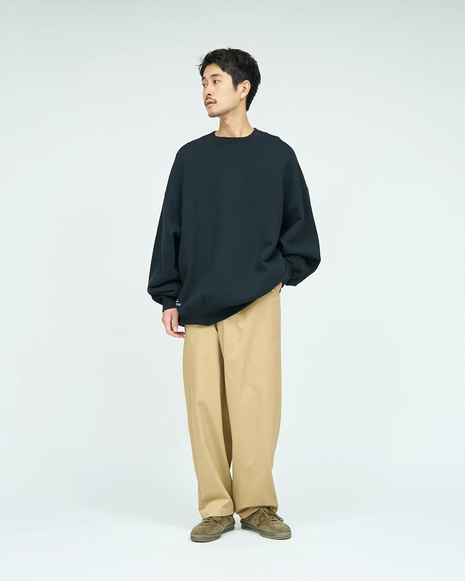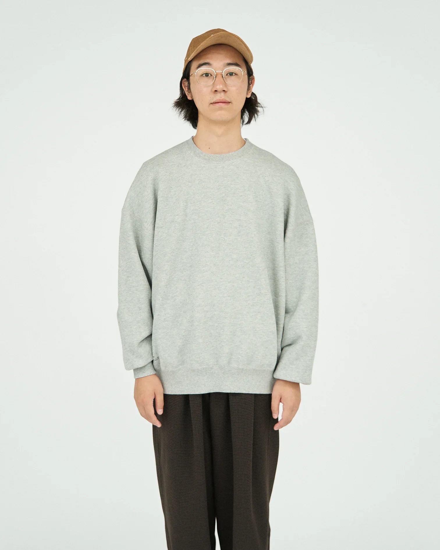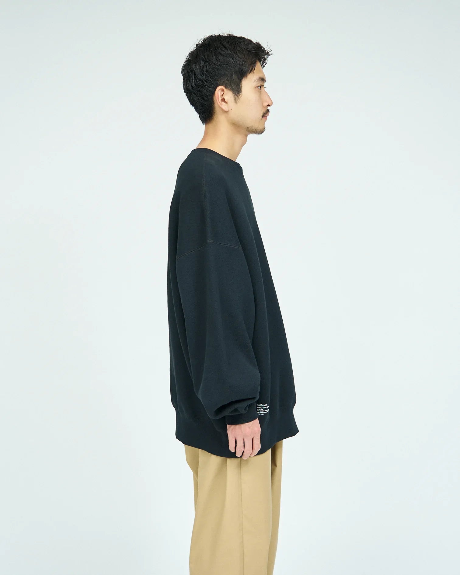 A crew neck sweatshirt with a firm and tough texture. The body is made of thick fleece material that has a clean look but is tightly woven. This top has a loose fit from the width of the body to the arms. typical of FreshServe. and can be worn on its own.