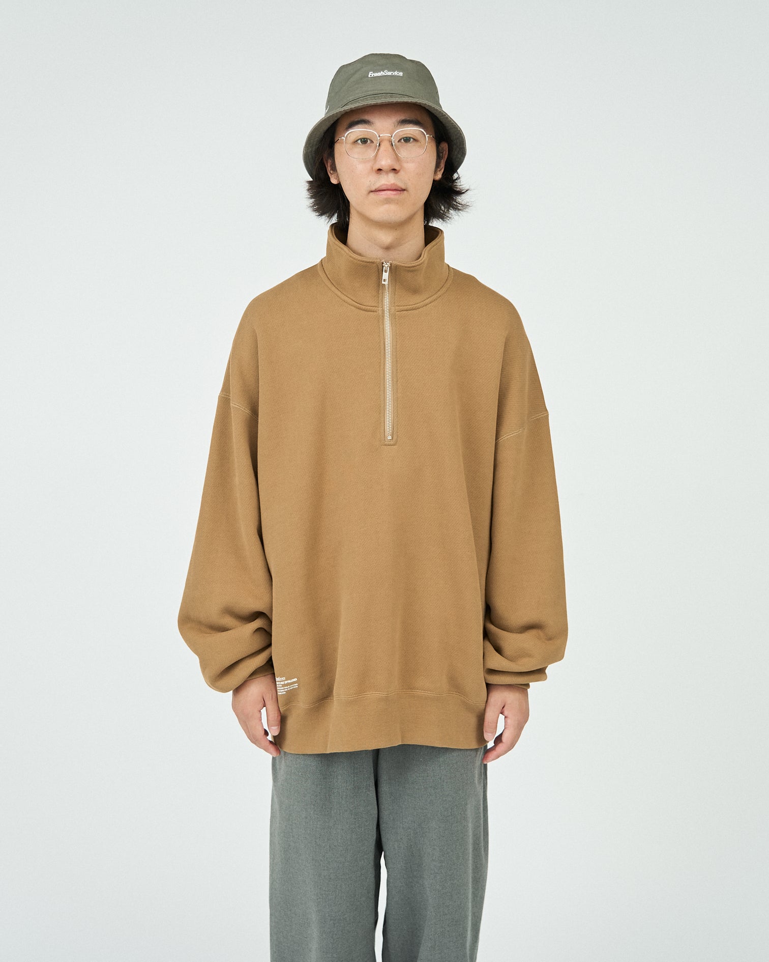 A stand-up collar half-zip pullover with a sturdy. tough feel. Inspired by 90s street casual. this half-zip pullover has a loose fit from the body to the arms. The surface has a clean look. but is made of a thick. dense fabric.