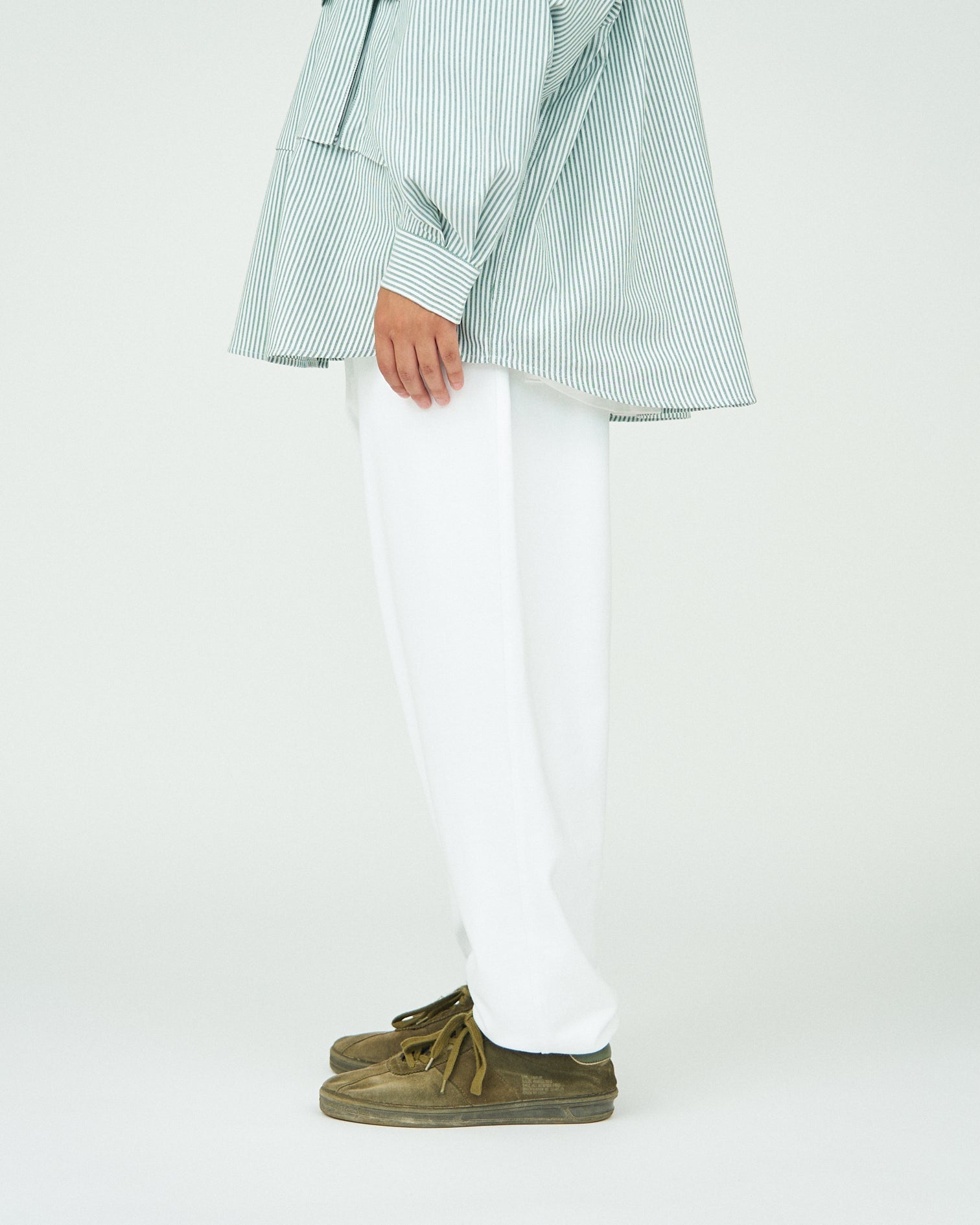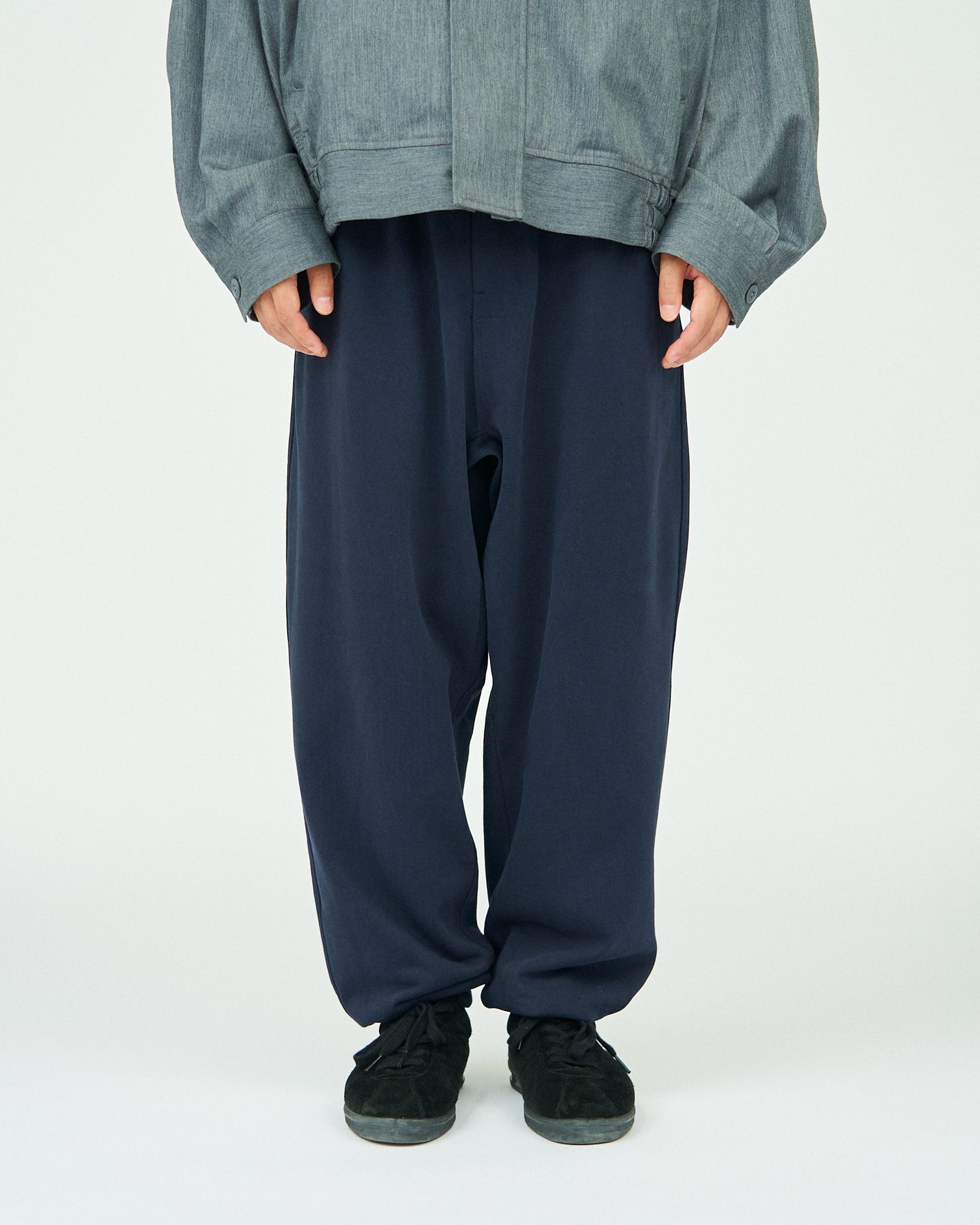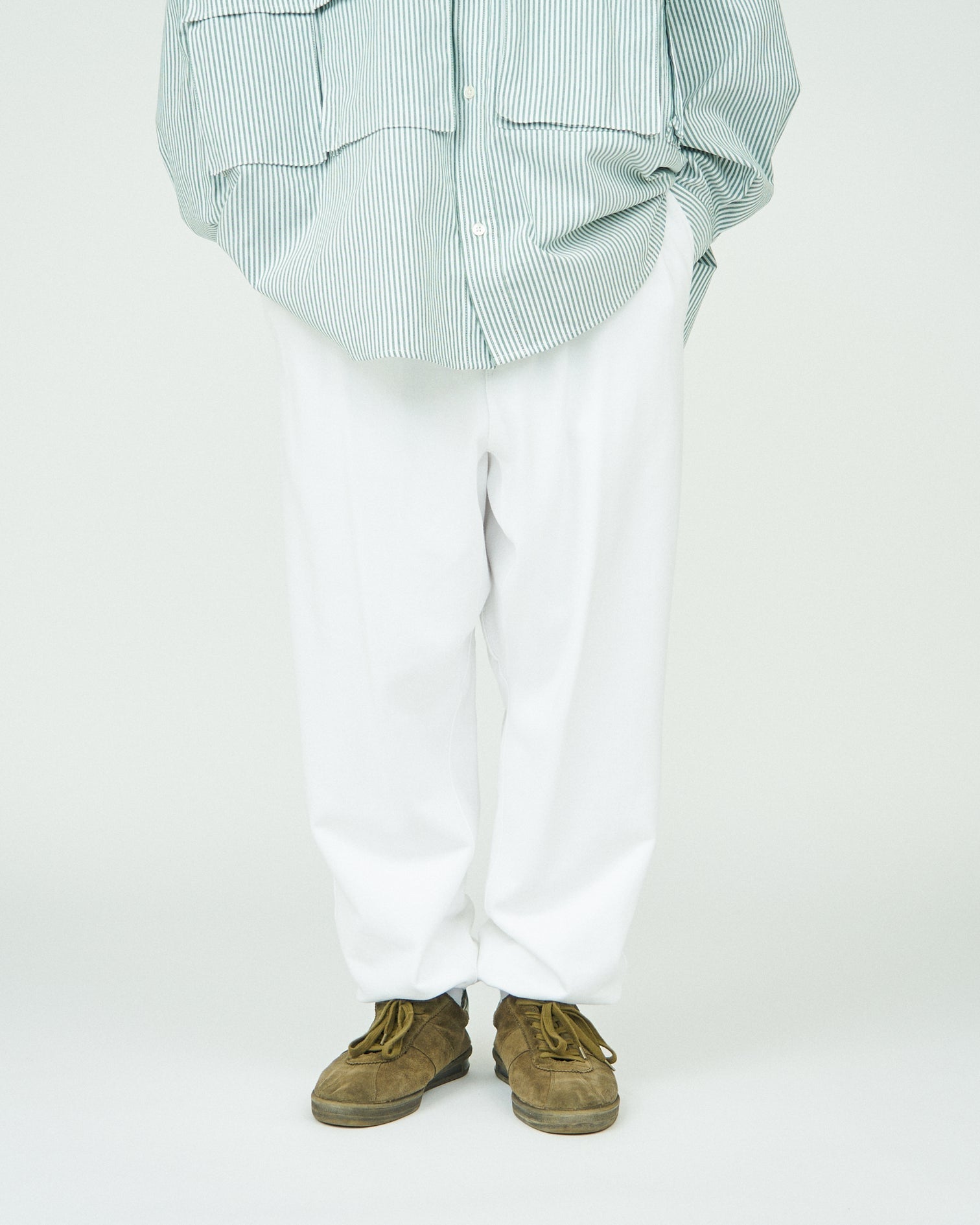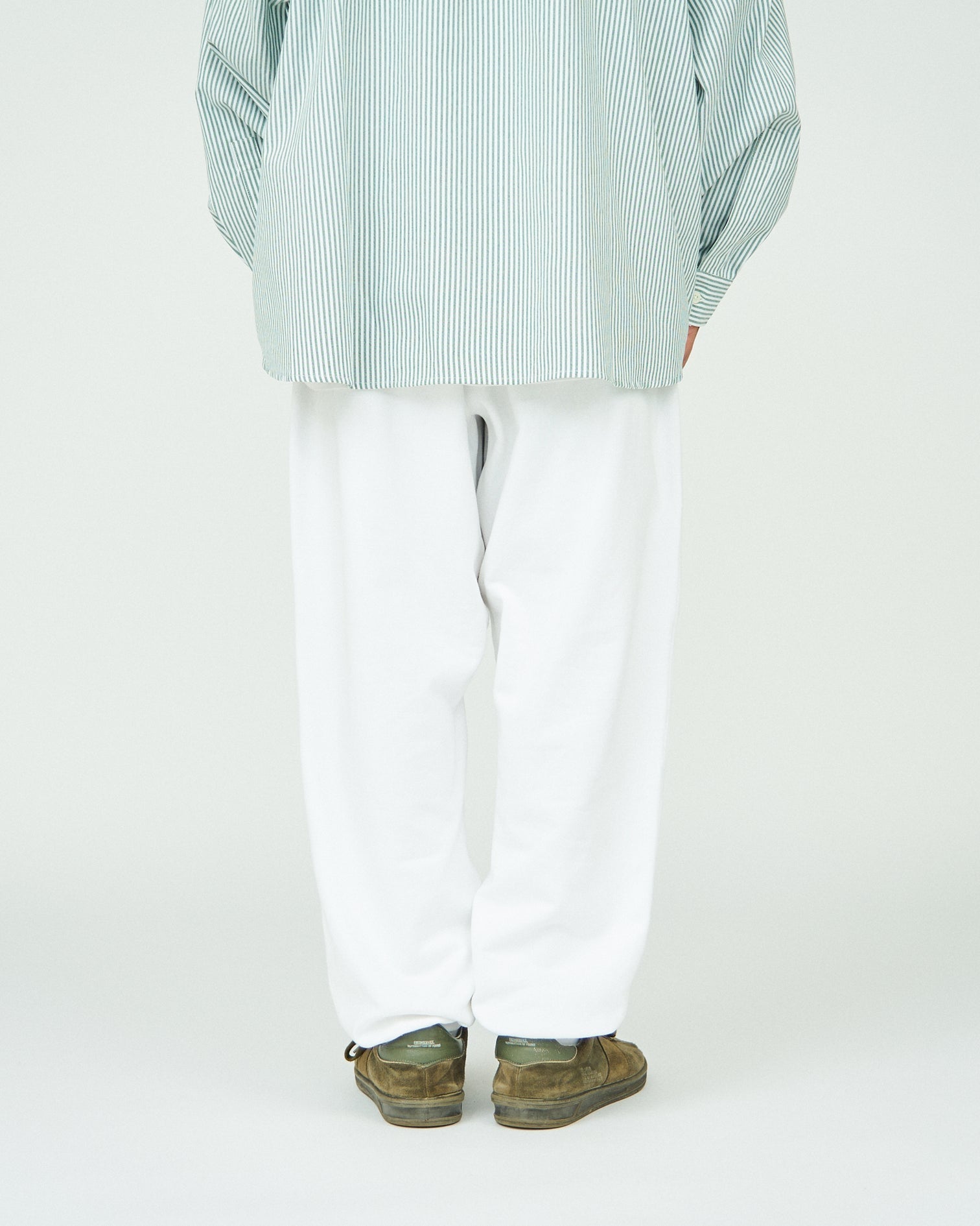 Sweatpants of just the right thickness for use throughout the long seasons. from early spring to autumn and winter. The air-spun yarn has a dry surface. while the loosely twisted loop surface is soft to the touch. A gusset is provided under the crotch to increase leg opening. and the ribbed hem makes this a sporty pair of joggers.