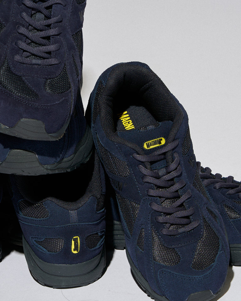 The upper is made of luxurious. fine-grained genuine suede in a dark-toned navy for a chic finish. while the emblem and bright yellow on the insole accentuate the coordinated look.