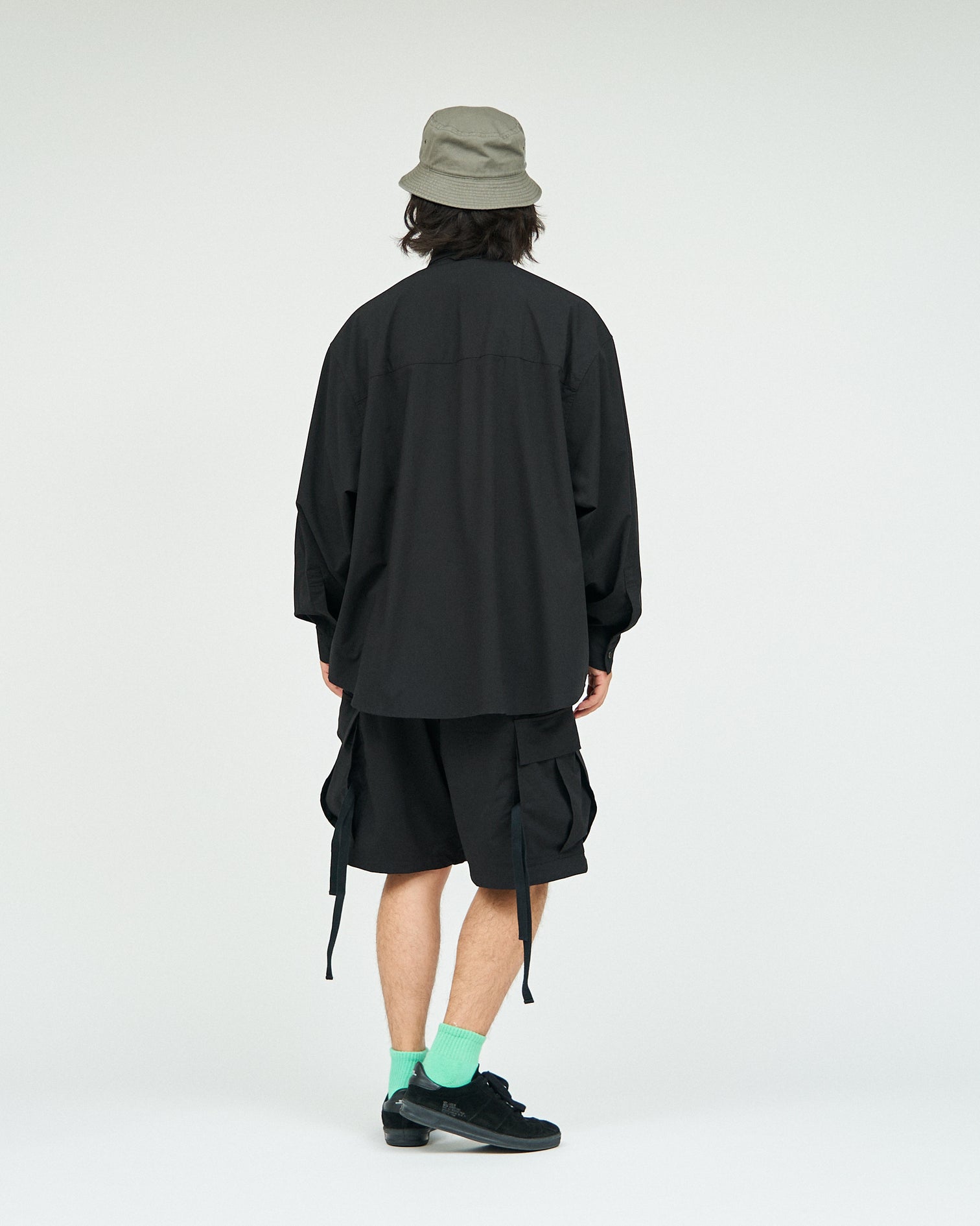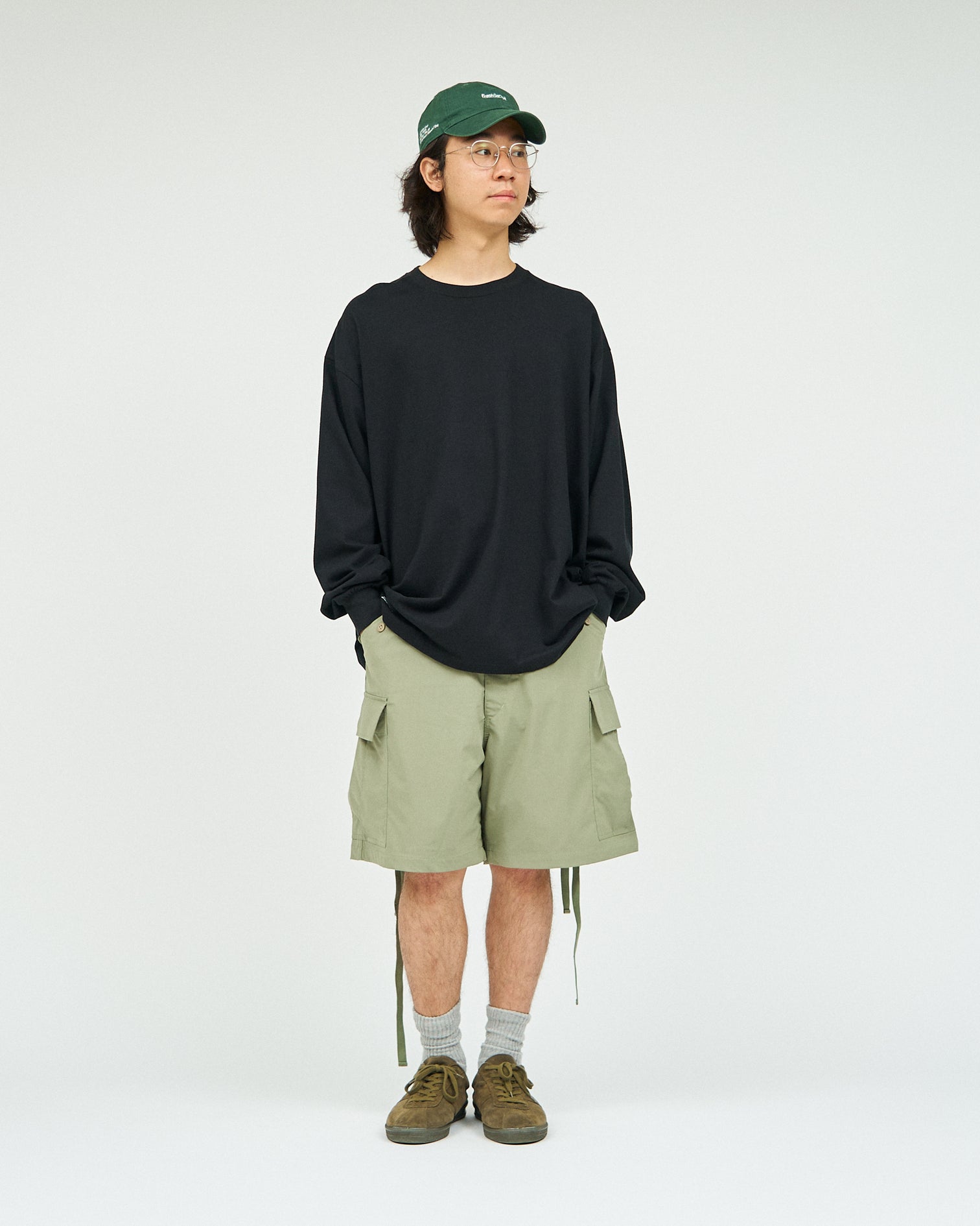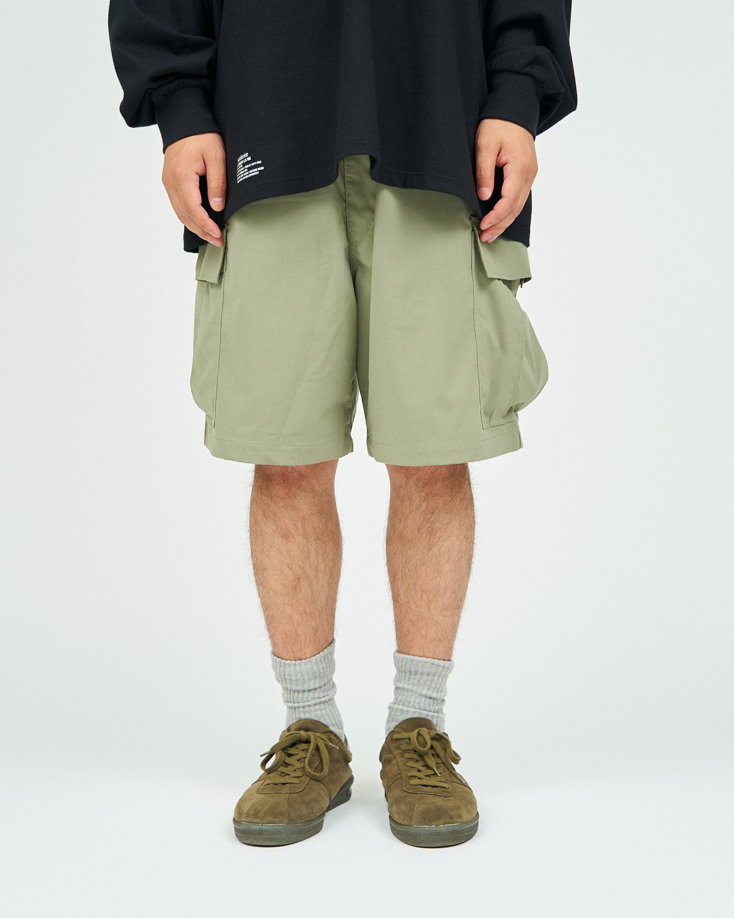 Cargo pants made of typewriter material woven with high density polyester and rayon. The M65 field pants. which are full of distinctive details such as tape in the details. have been updated to a shorts style in the FreshServie style. The tourniquet tape attached to the cargo pocket can be enjoyed as an accent to your style. In addition to the moderate firmness and stiffness. and supple texture. it is also easy to care for and does not wrinkle easily.