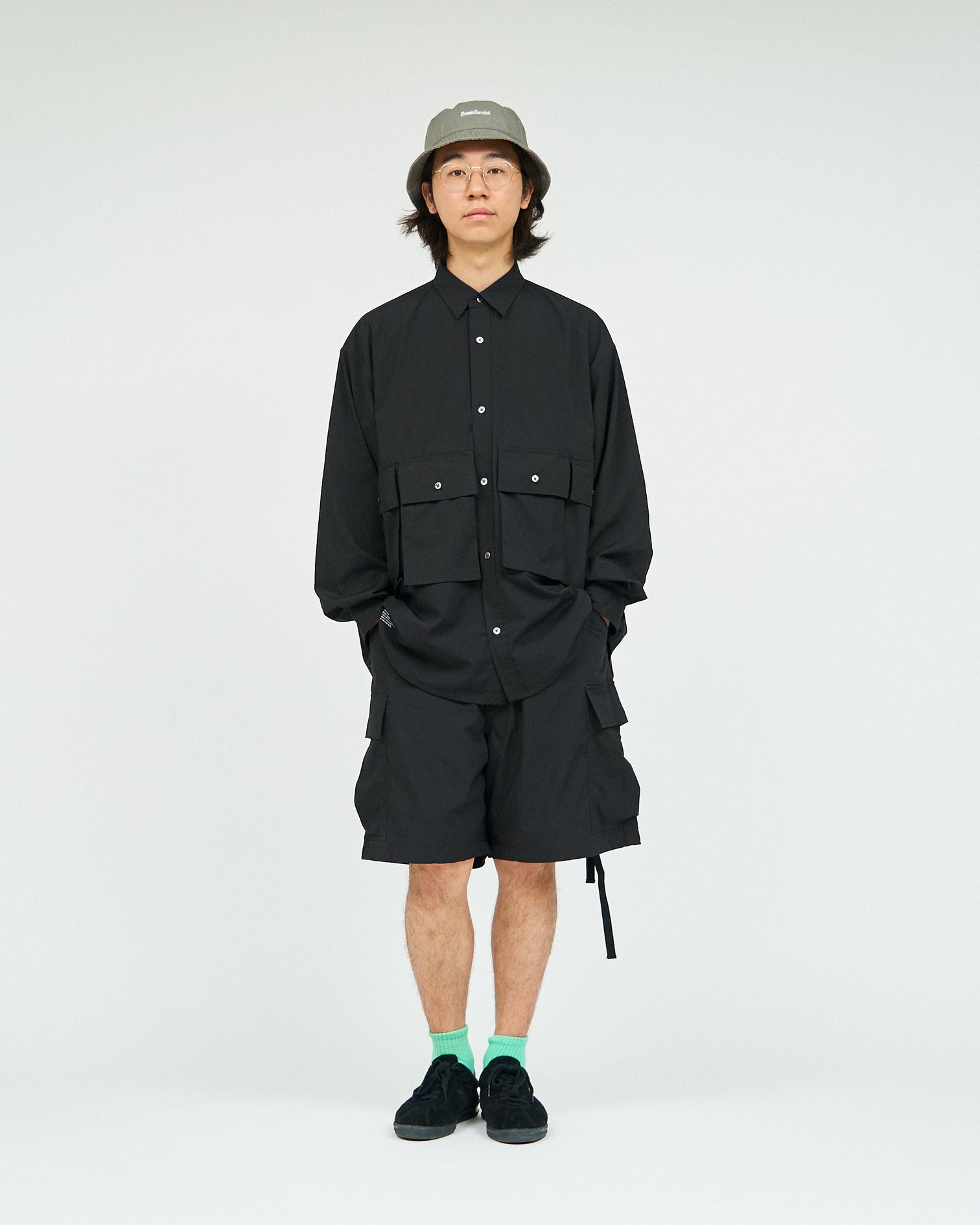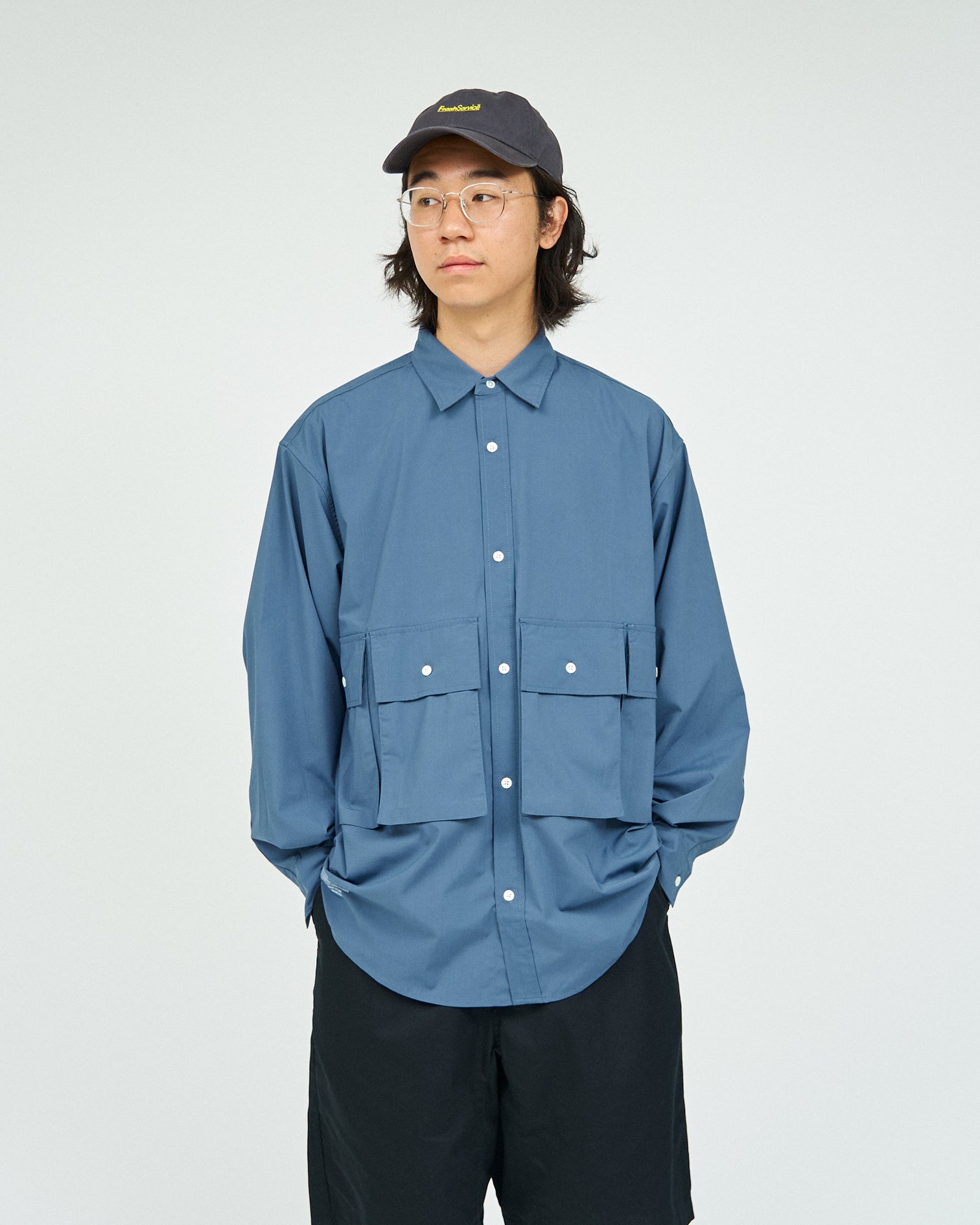 This flap pocket shirt is made of typewriter material. a high-density woven polyester and rayon fabric. It has just the right amount of firmness and elasticity. a supple texture. and is easy to care for. as it does not wrinkle easily. This shirt features four flap pockets on the front. making it perfect for storing everyday items such as wallets and smartphones. and is a representative FreshService shirt style with an eye-catching design. The voluminous sizing. with its wide body width. arms. and dropped shoulders. makes it suitable for wearing as a jacket.