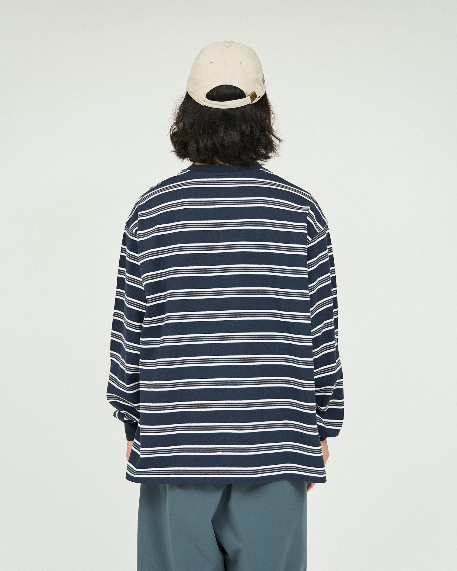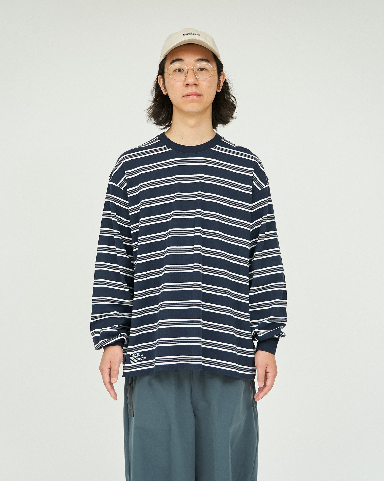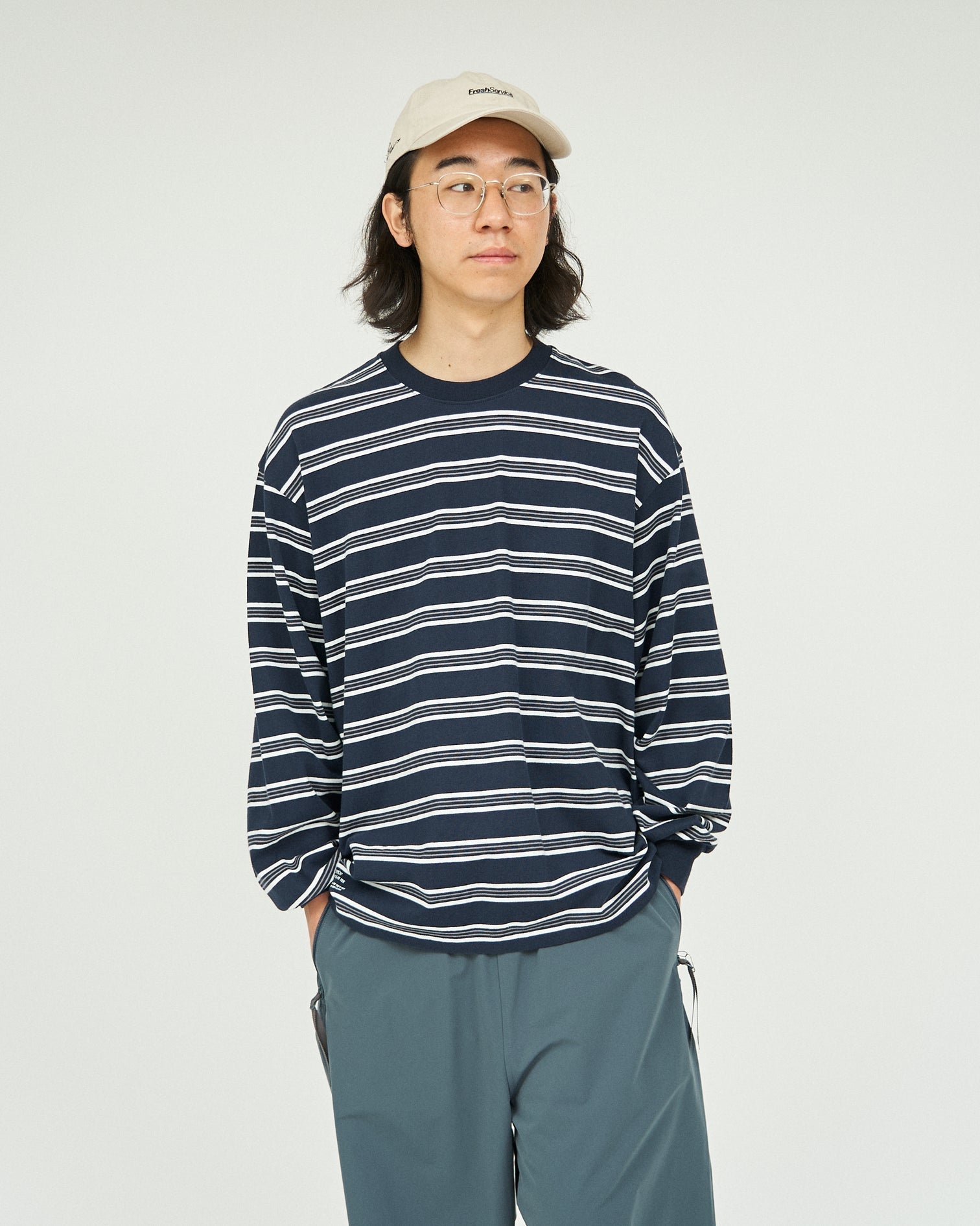 A long-sleeved T-shirt with a striped pattern that is released in a new pattern every season. This season. the striped pattern has three colors with different pitch widths. expressing a skate taste reminiscent of the 90s style. The body is made of thick cotton fabric that becomes softer with each wash. and is made with a relaxed silhouette that is typical of FreshService. This piece will be the main focus of your early spring outfit.
