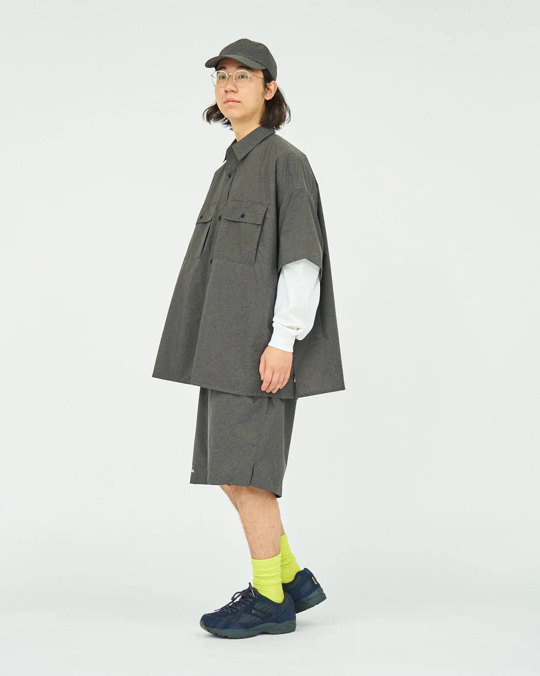 Easy shorts made from extremely thin and lightweight PERTEX® EQUILIBRIUM in heathered BLACK. In addition to its outstanding quick-drying and moisture permeability. the water-repellent material also has the effect of reducing stickiness to the skin. maintaining a comfortable environment inside the garment even in hot and humid environments. A drawcord is placed at the waist to fit people of various body types. making it an item that can be used not only in urban life but also in outdoor situations.