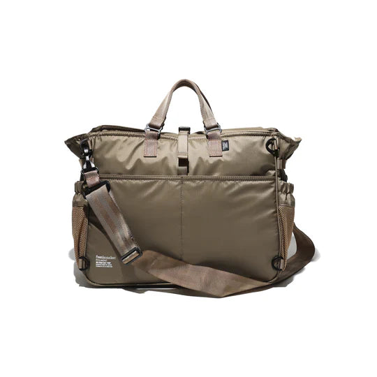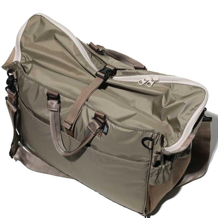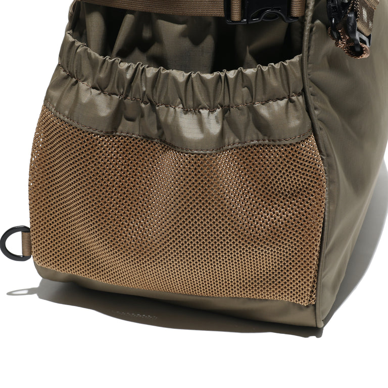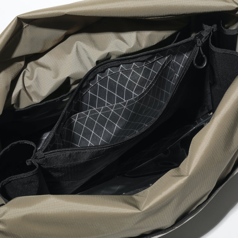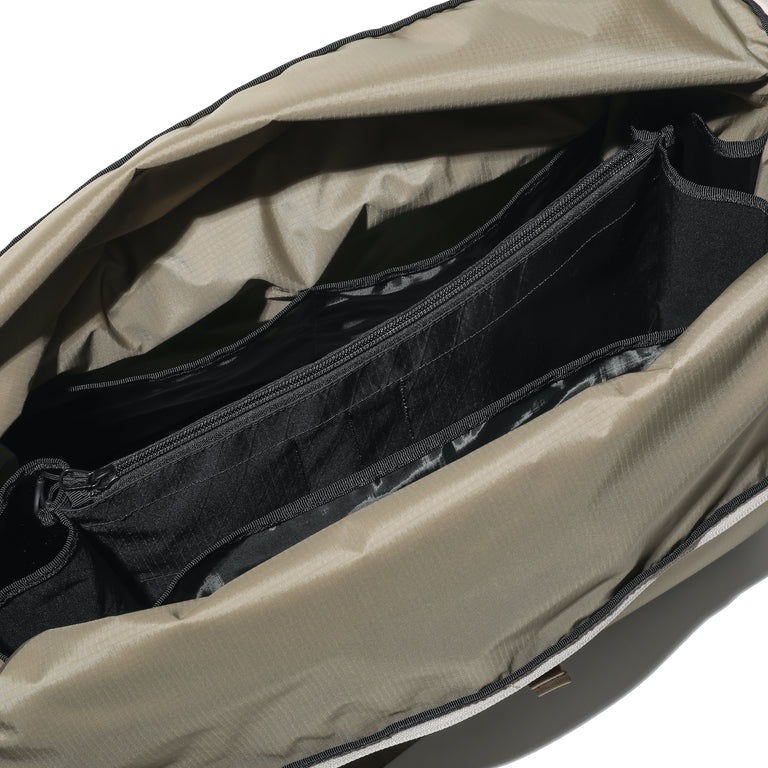 A shoulder bag made of breathable and waterproof 3-layer ripstop nylon that is perfect for day trips. A set of tools necessary for a round can be stored. and the opening and closing of the round makes it easy to put in and take out luggage. A pouch placed in the center as a divider makes it easy to separate items.