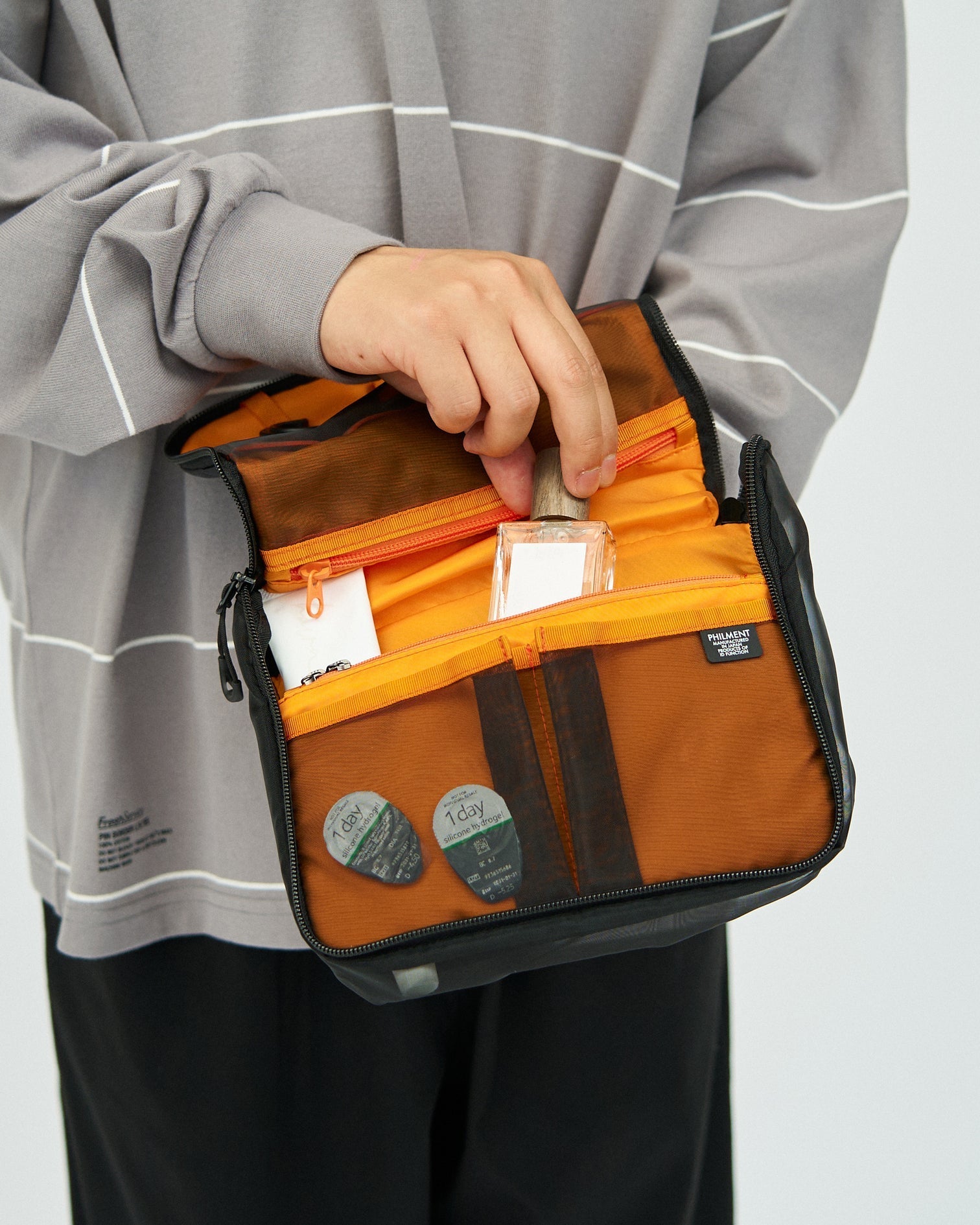 A collaboration with bag brand PHILMENT. which proposes a new way of thinking about business bags. A travel pouch with a velcro fastening. made of flight nylon with a high density. elegant luster and excellent abrasion resistance. A convenient item that helps you organize small items you need not only for travel but also for everyday use. It comes with a retractable rubber bottle holder that can be hung with a retractable hook.