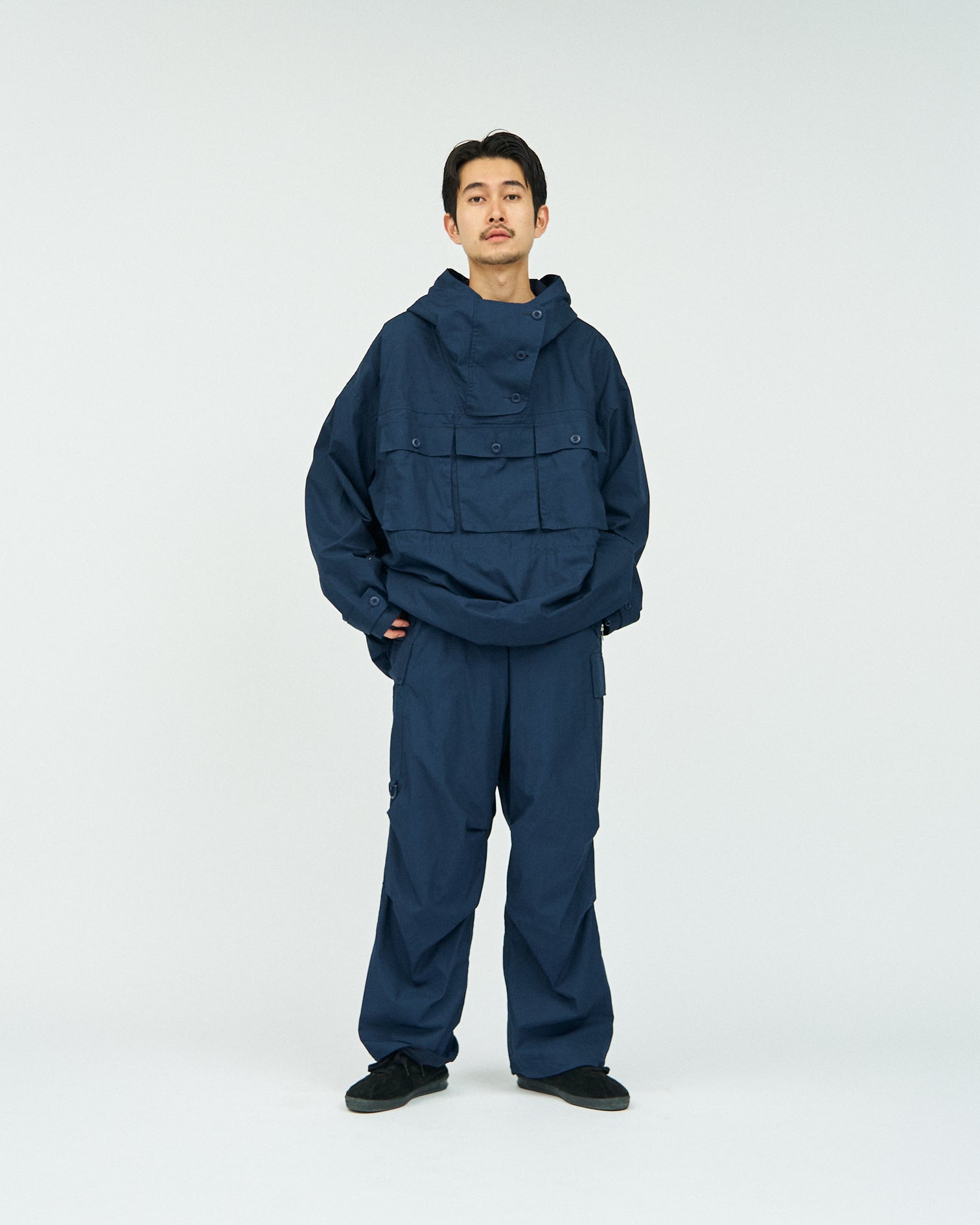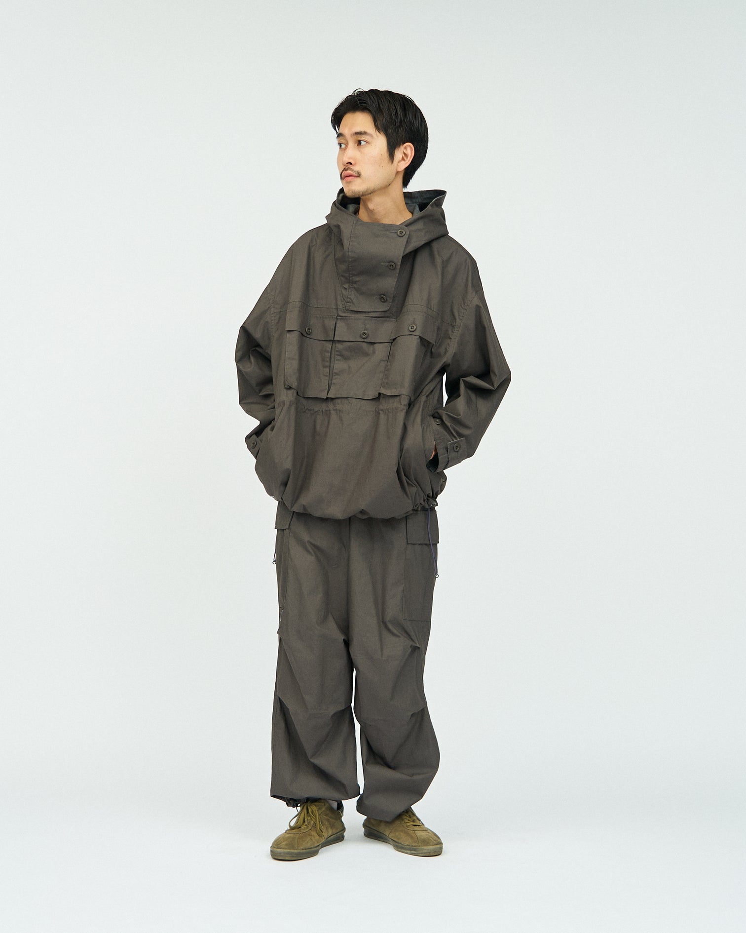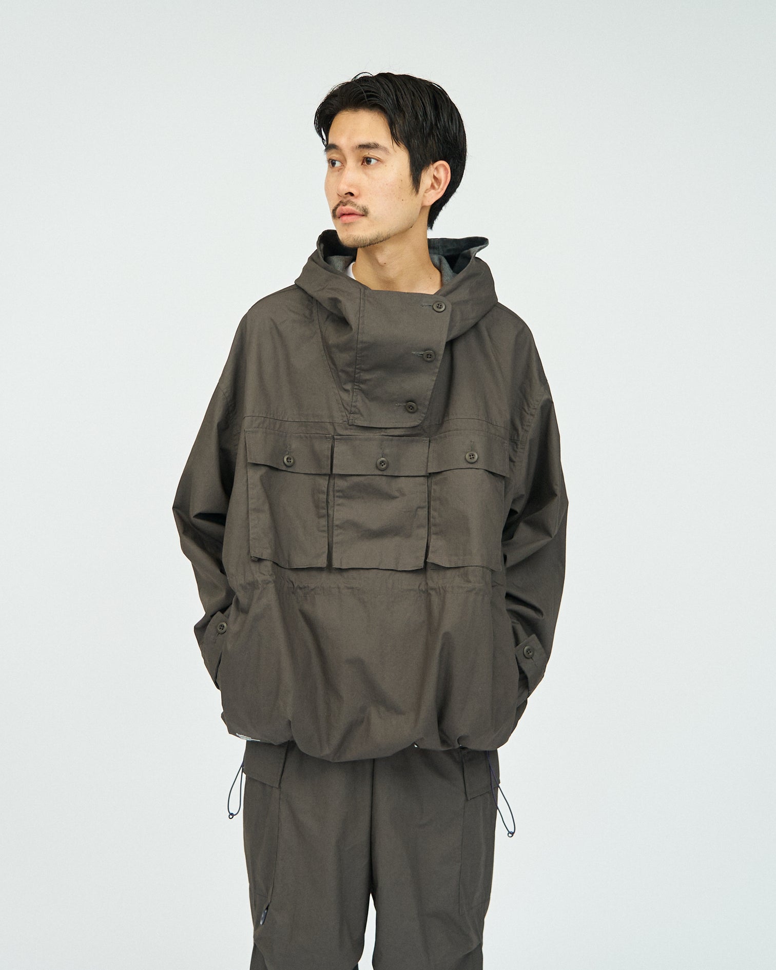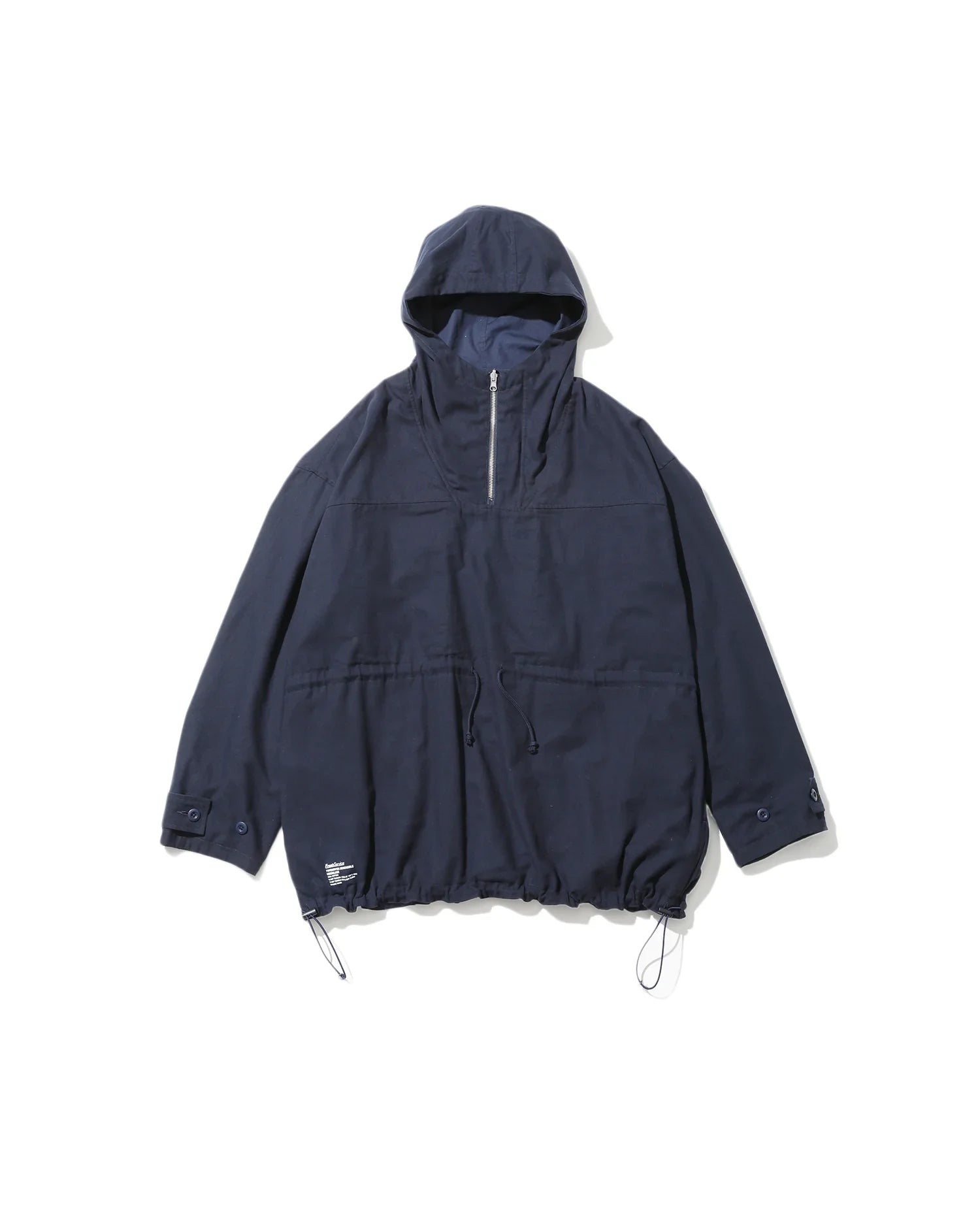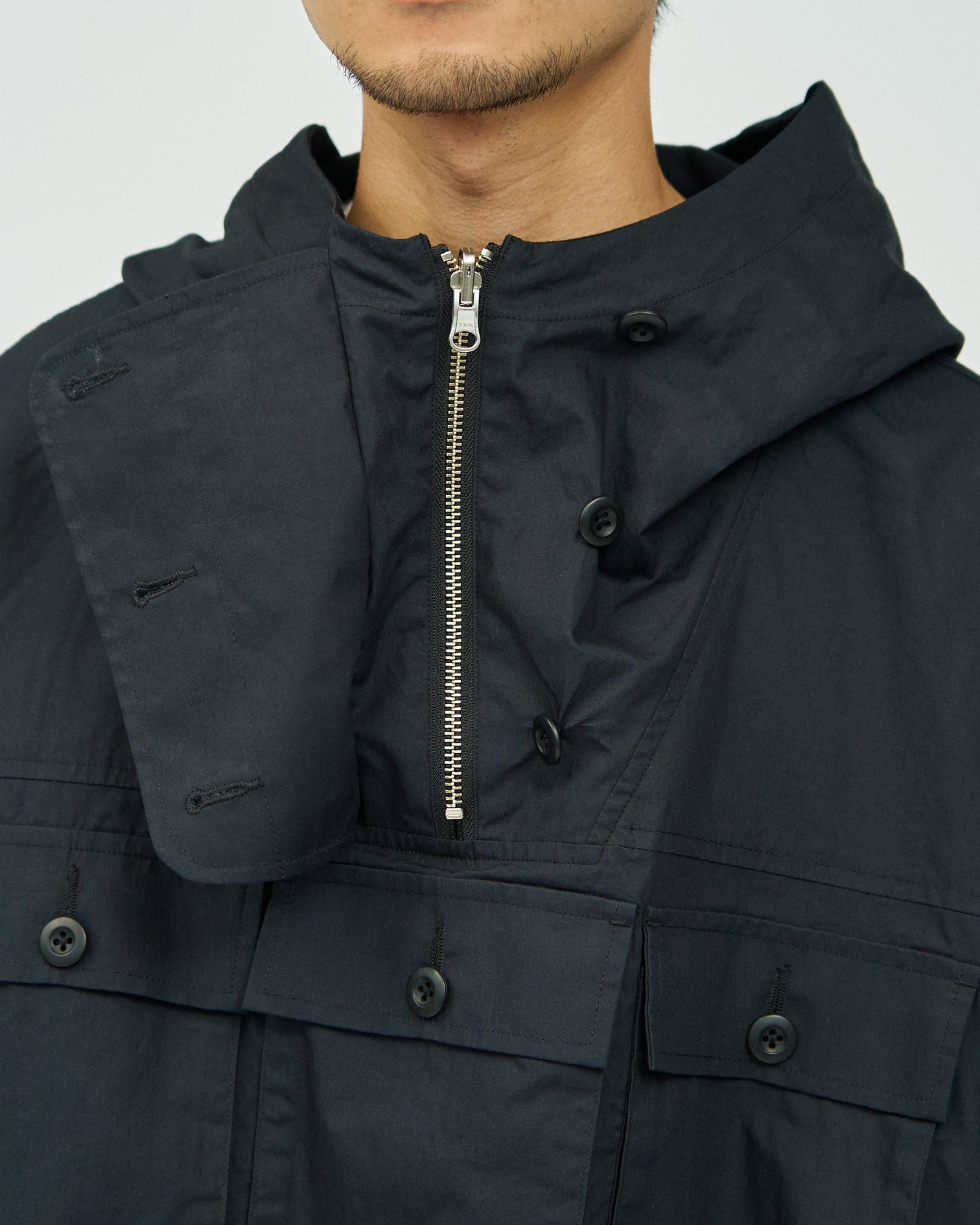 This oversized anorak parka is based on the "Windbruse" worn by the German mountain troops in the 1940s. It is reversible. with a crisp typewriter fabric on the front and warm brushed cotton flannel on the back. The pockets lined up on the chest. the flap that covers the chin. and the drawstring at the waist are all faithfully reproduced. This model has a new stretch cord at the hem. which expands the range of styles and makes it a more modern piece for urban life.