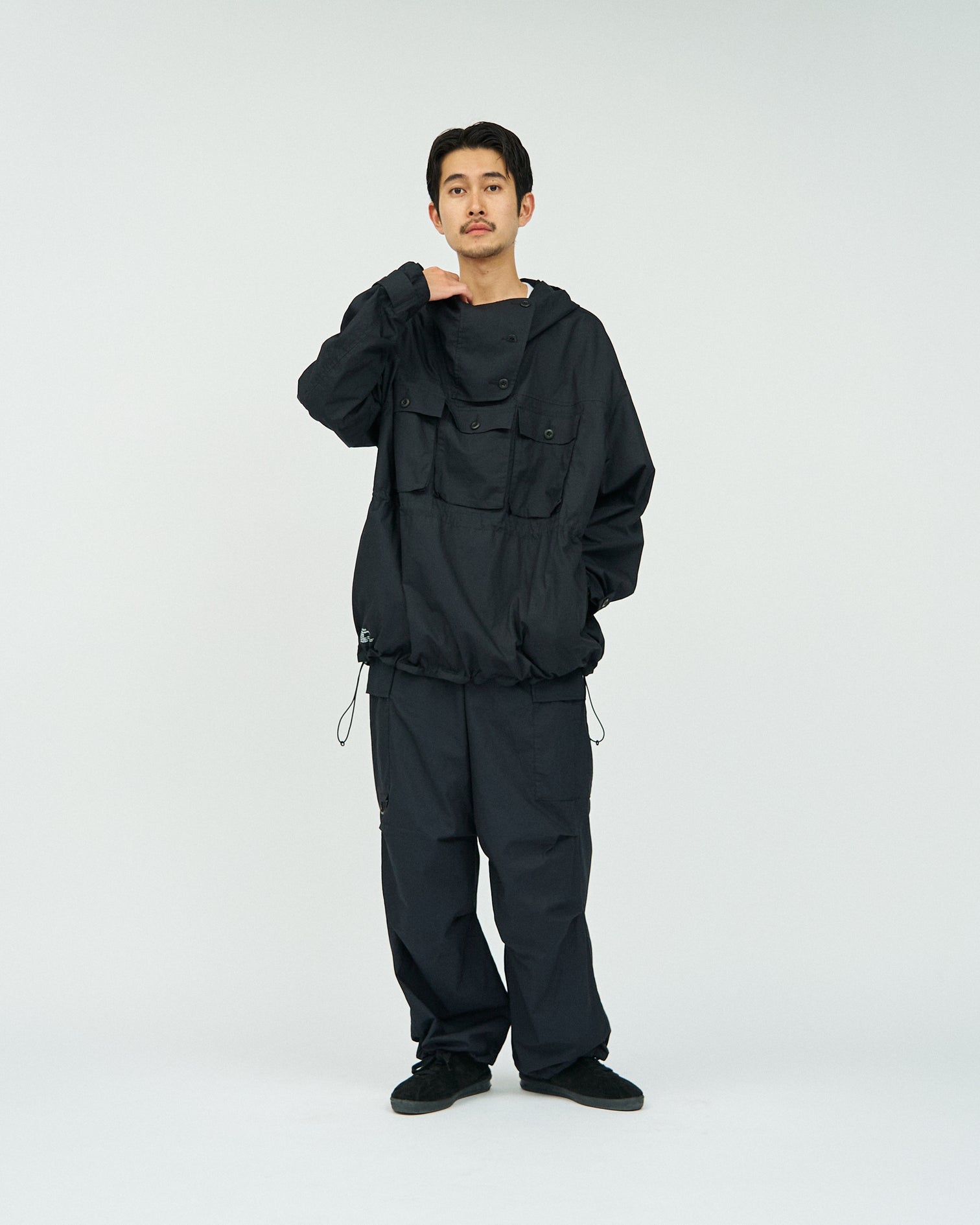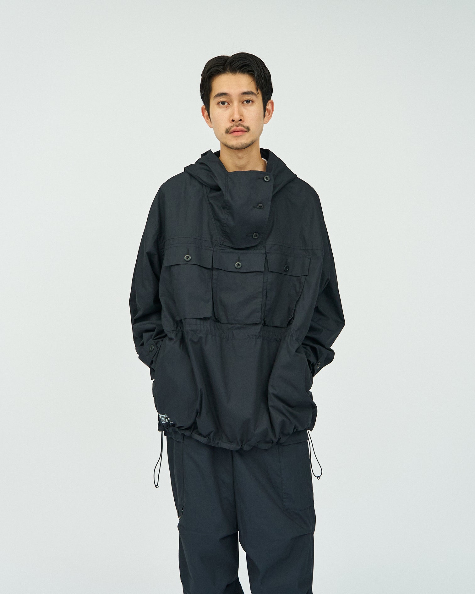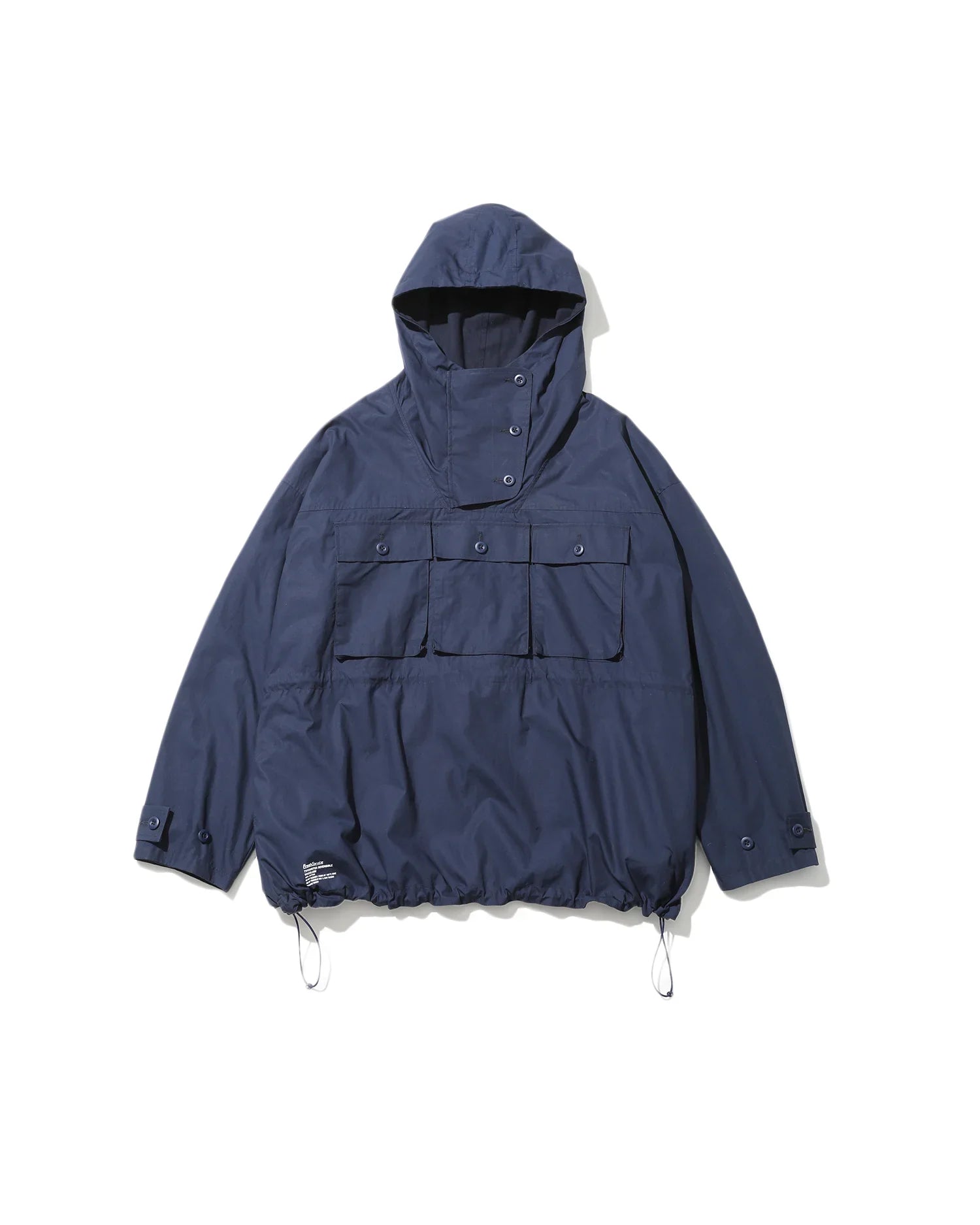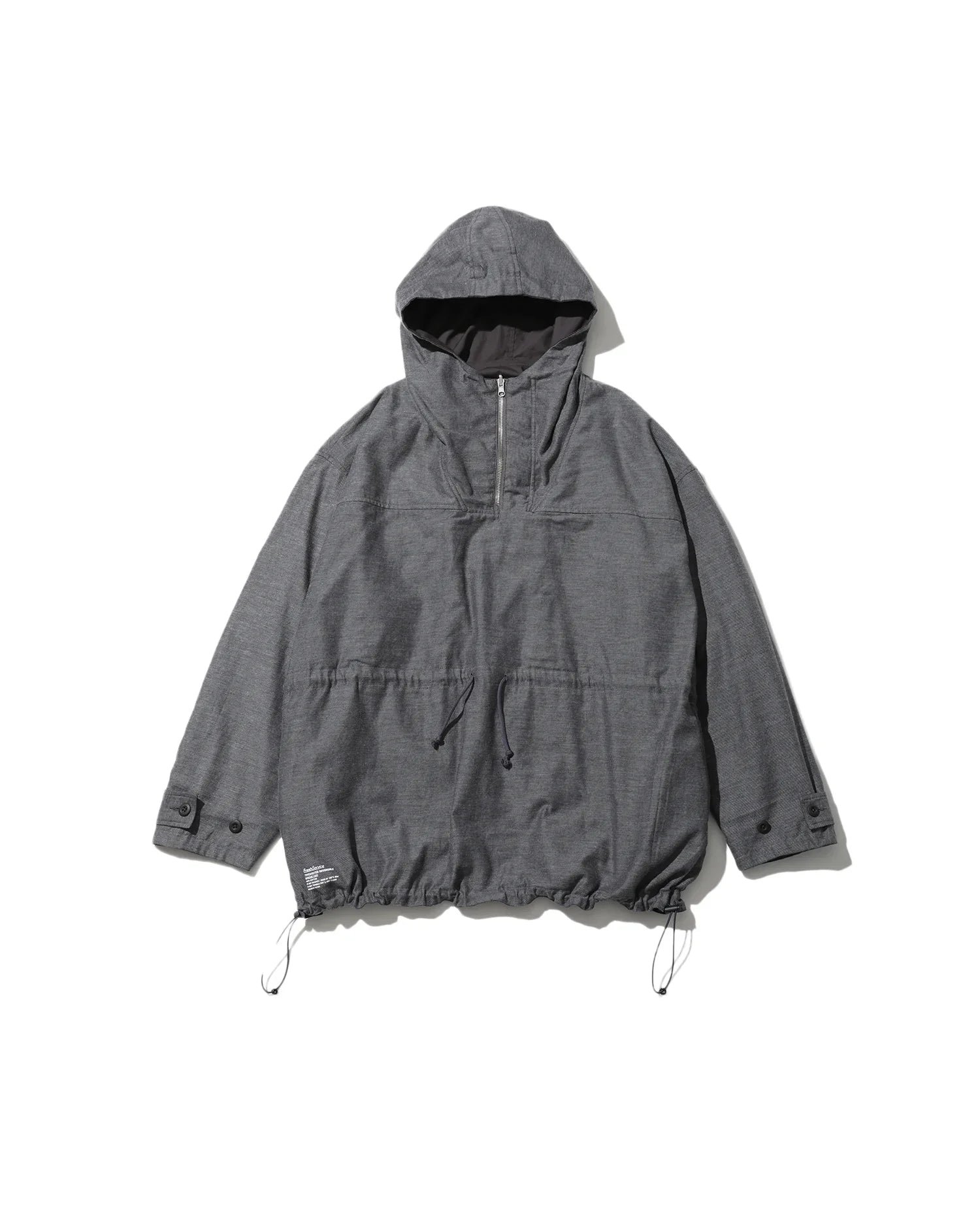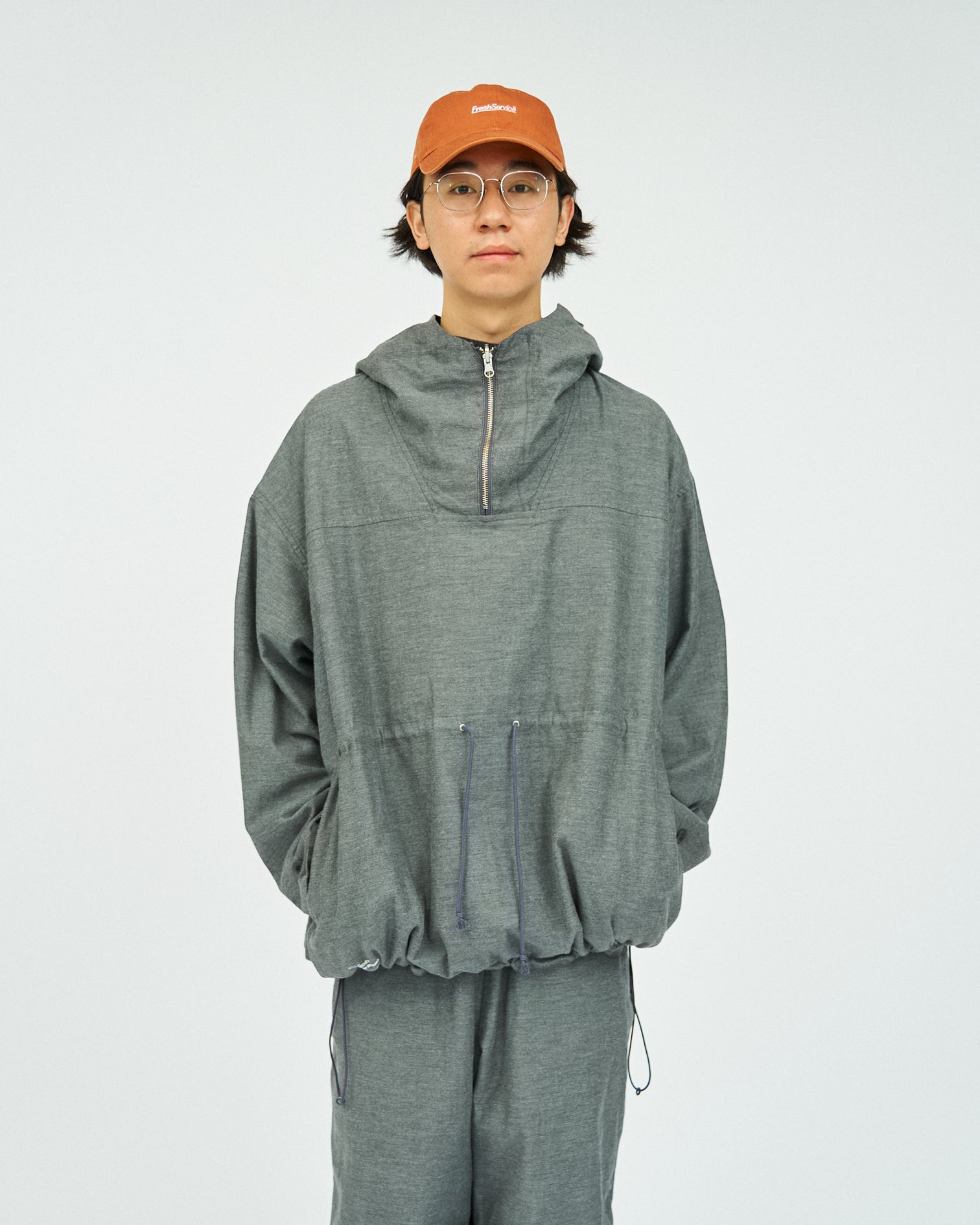 This oversized anorak parka is based on the "Windbruse" worn by the German mountain troops in the 1940s. It is reversible. with a crisp typewriter fabric on the front and warm brushed cotton flannel on the back. The pockets lined up on the chest. the flap that covers the chin. and the drawstring at the waist are all faithfully reproduced. This model has a new stretch cord at the hem. which expands the range of styles and makes it a more modern piece for urban life.