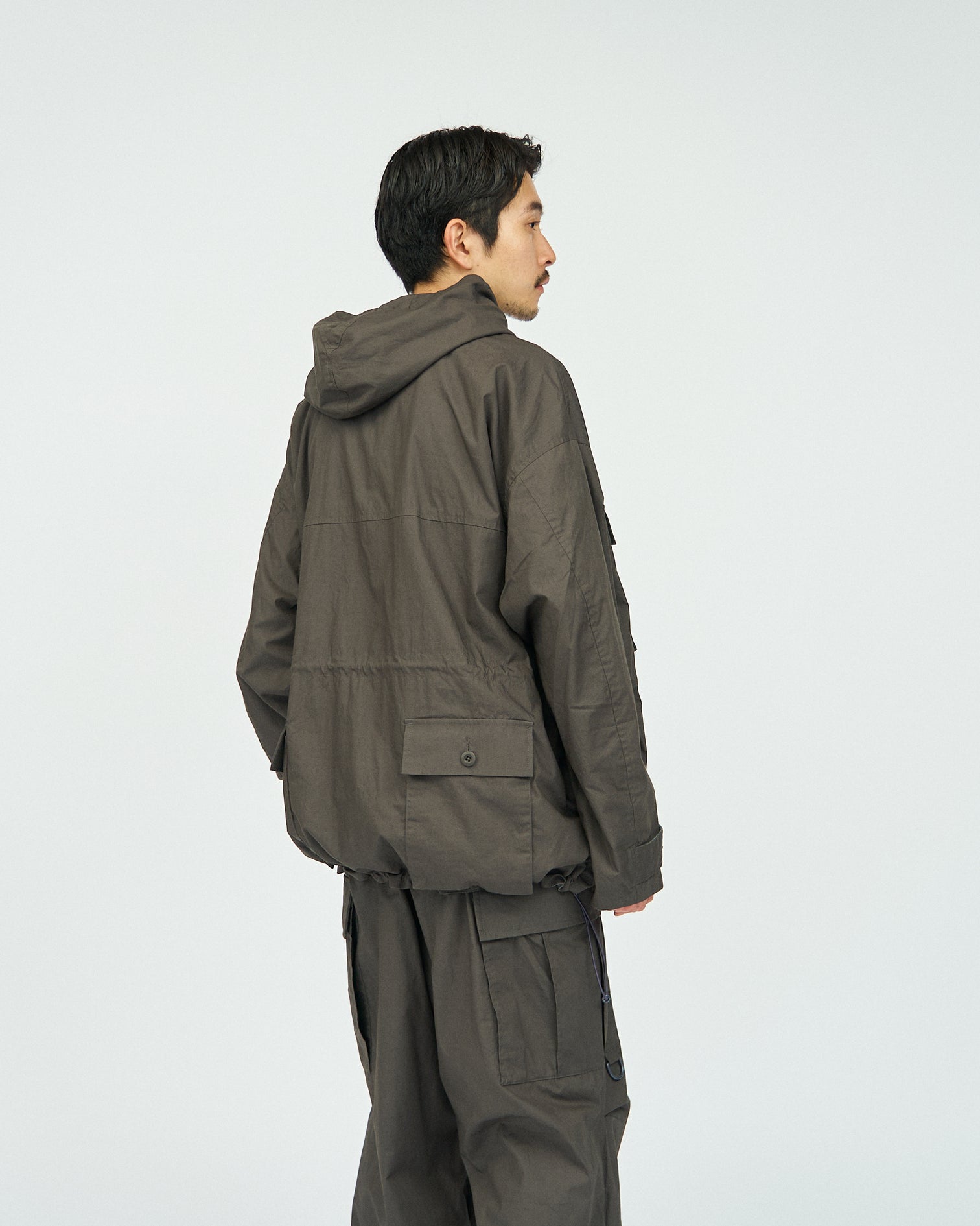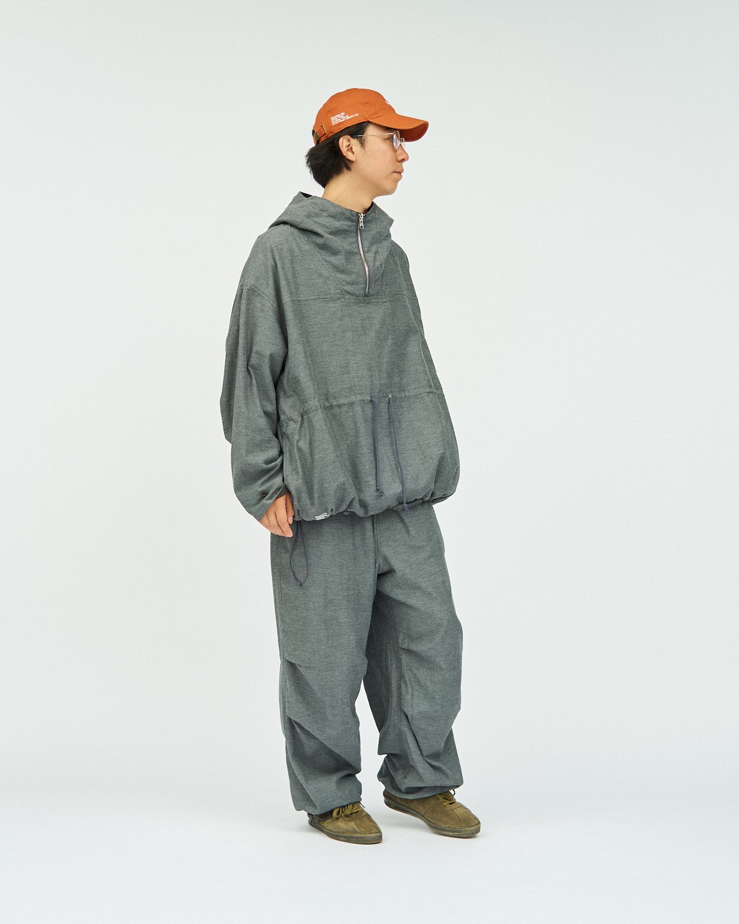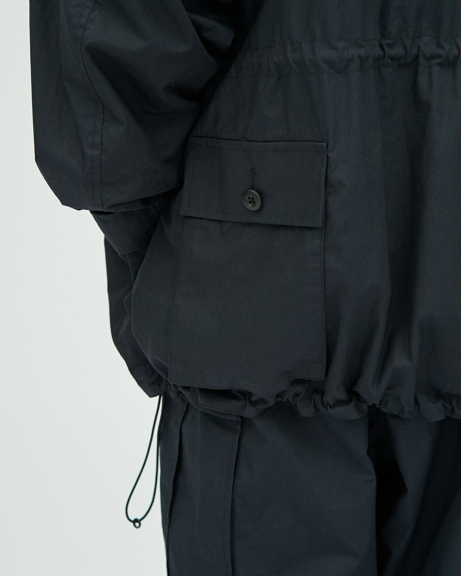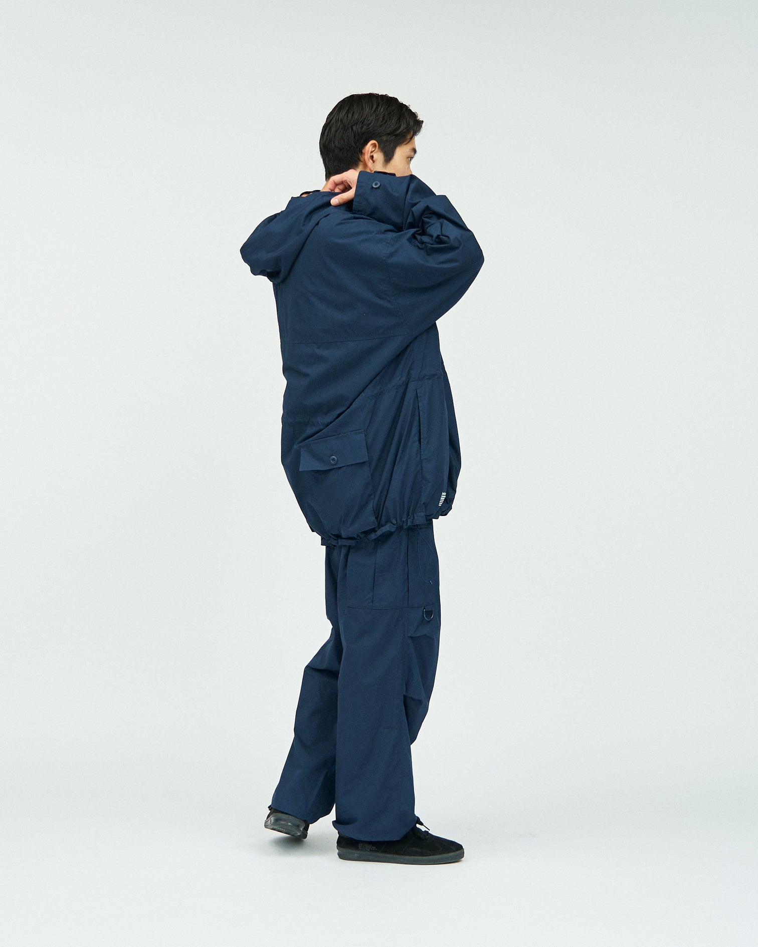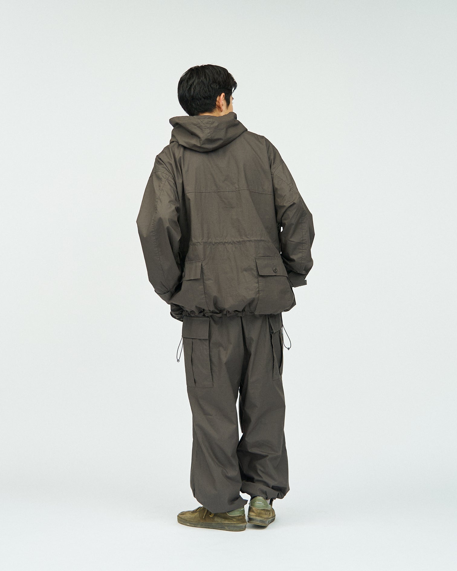 This oversized anorak parka is based on the "Windbruse" worn by the German mountain troops in the 1940s. It is reversible. with a crisp typewriter fabric on the front and warm brushed cotton flannel on the back. The pockets lined up on the chest. the flap that covers the chin. and the drawstring at the waist are all faithfully reproduced. This model has a new stretch cord at the hem. which expands the range of styles and makes it a more modern piece for urban life.