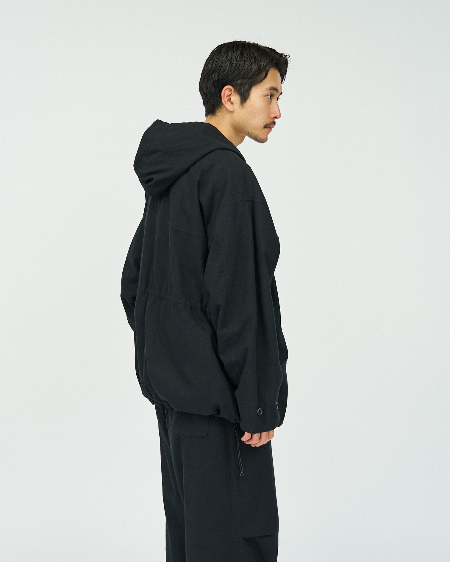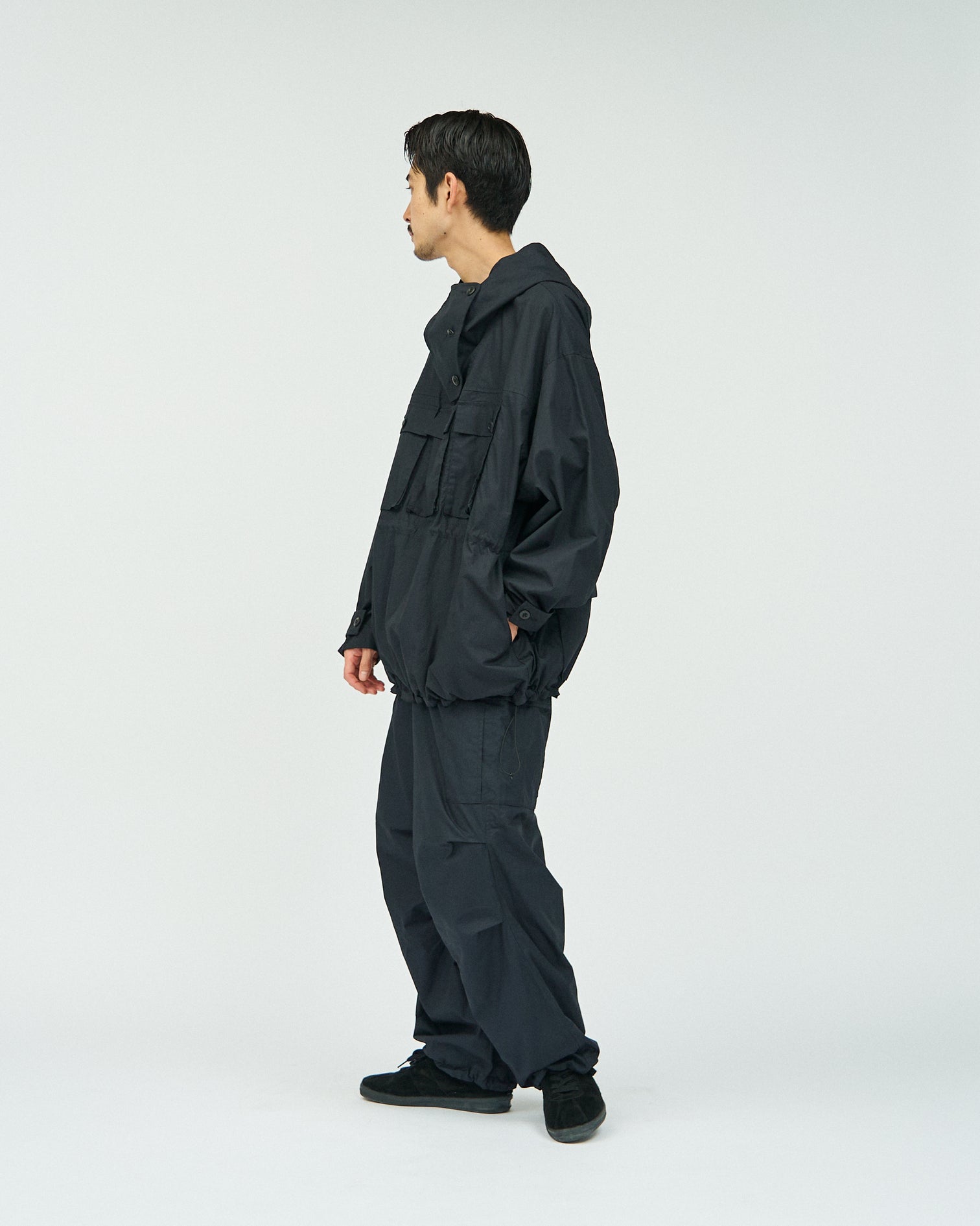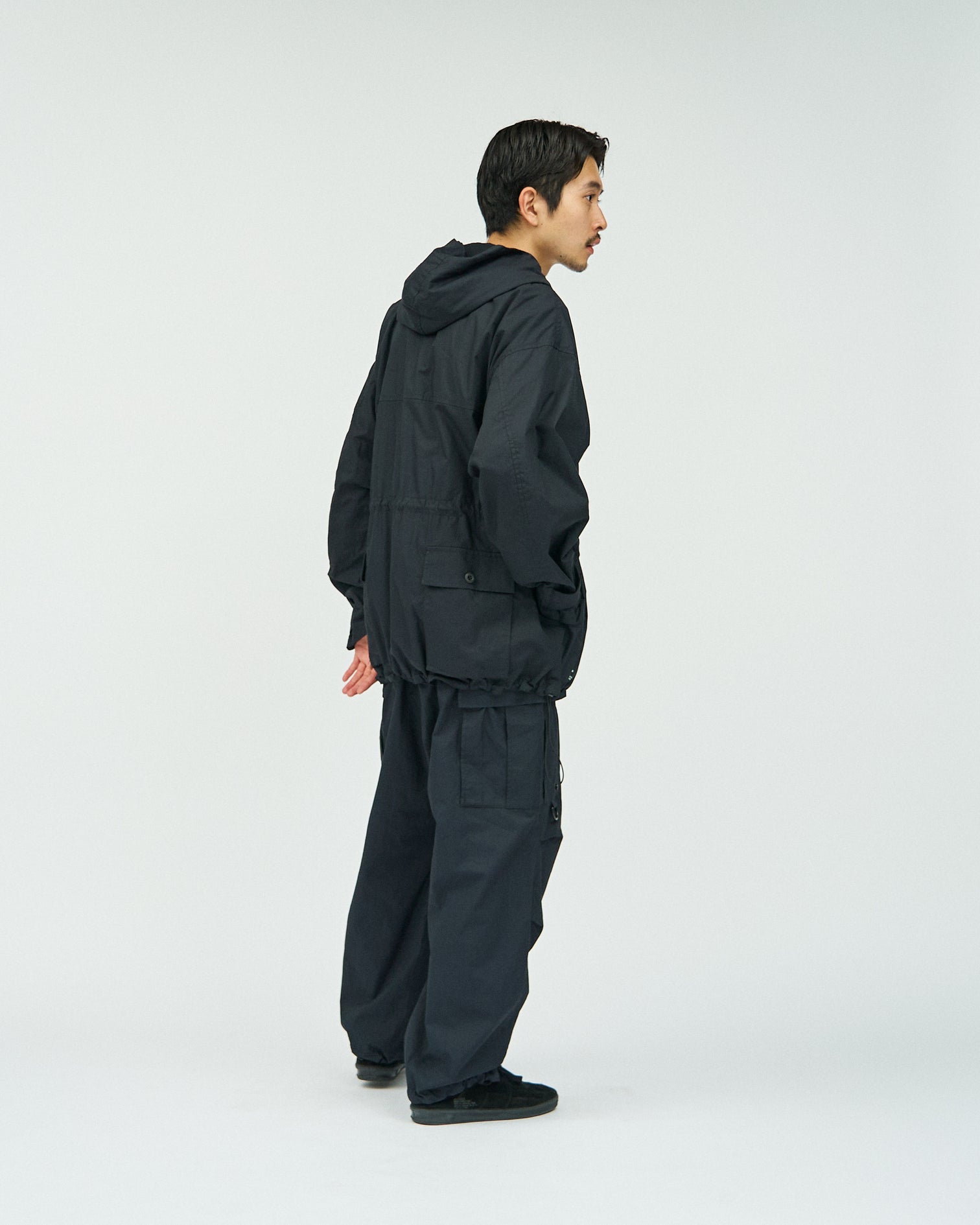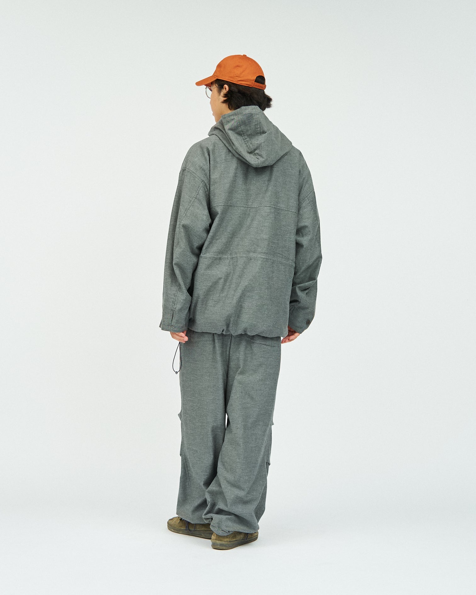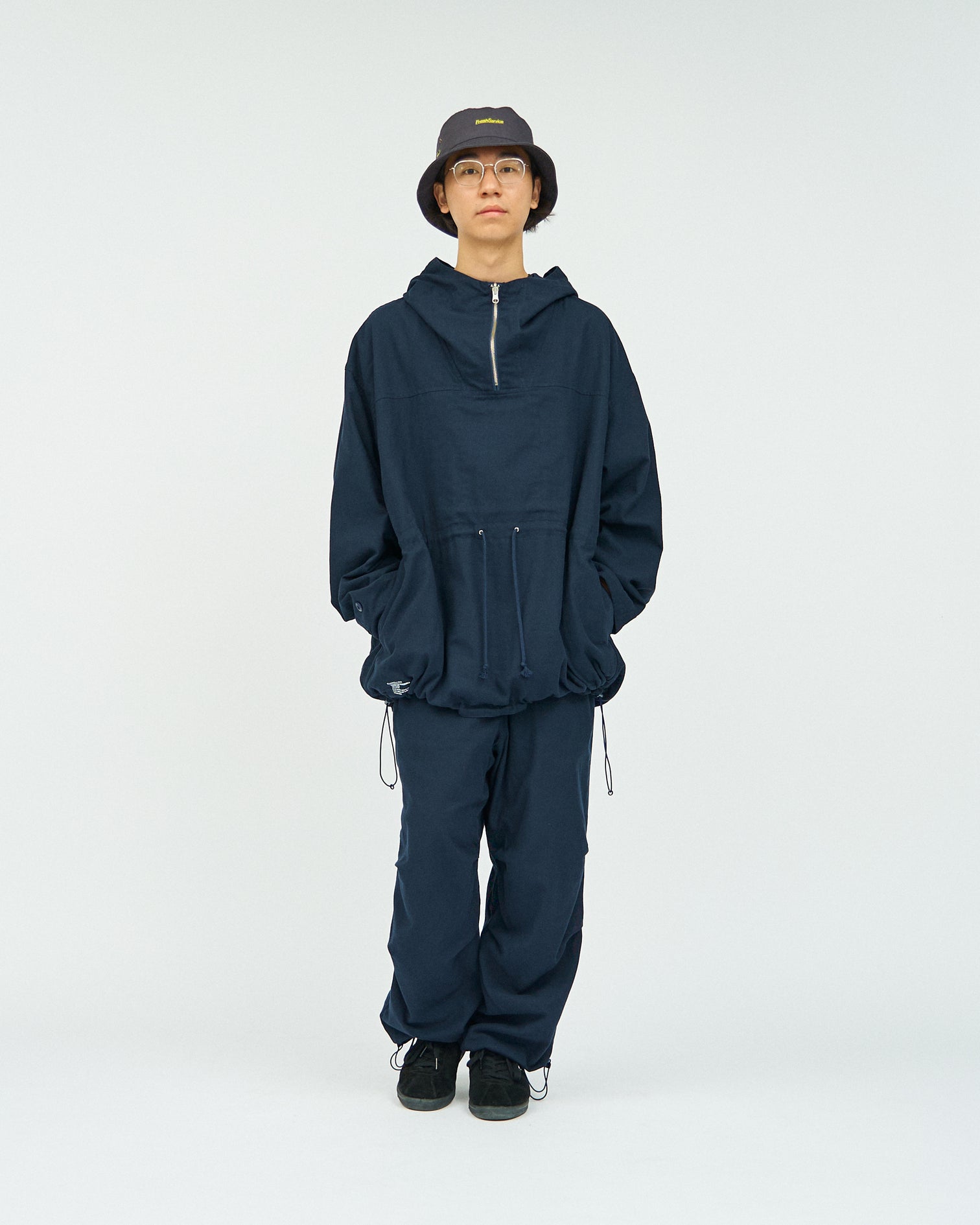 This oversized anorak parka is based on the "Windbruse" worn by the German mountain troops in the 1940s. It is reversible. with a crisp typewriter fabric on the front and warm brushed cotton flannel on the back. The pockets lined up on the chest. the flap that covers the chin. and the drawstring at the waist are all faithfully reproduced. This model has a new stretch cord at the hem. which expands the range of styles and makes it a more modern piece for urban life.