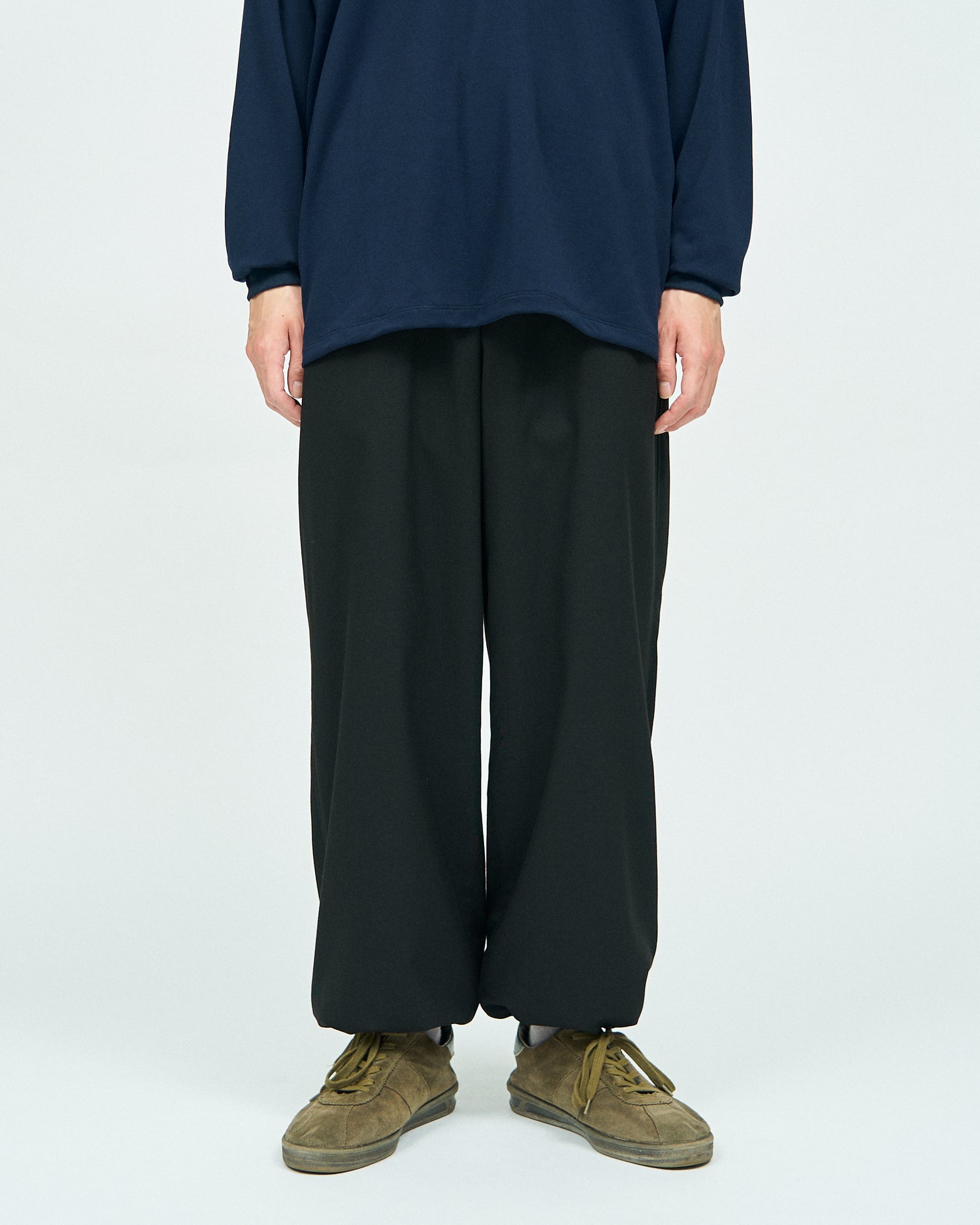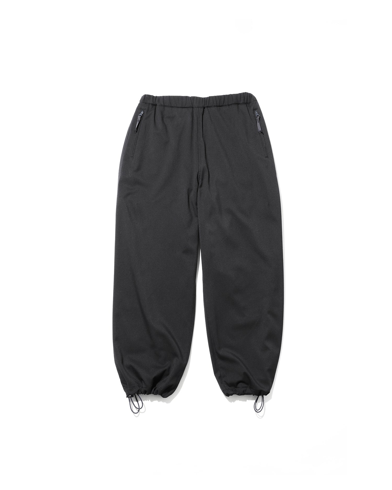 Overpants-style track pants. The outer fabric is a wool-like functional fabric that is highly stretchable. resistant to pilling. and can be washed at home. It features a warm. fleshy feel and a supple texture. The lining is made of the functional material "Octa_" developed by TEIJIN. It combines various functions such as sweat absorption. quick drying. lightweight. heat insulation. and insulation. quickly absorbs sweat. does not get sticky. does not accumulate excess heat. and always creates a comfortable clothing space. The silhouette is voluminous from the waist to the hem. and the silhouette can be adjusted by the drawstring at the hem.