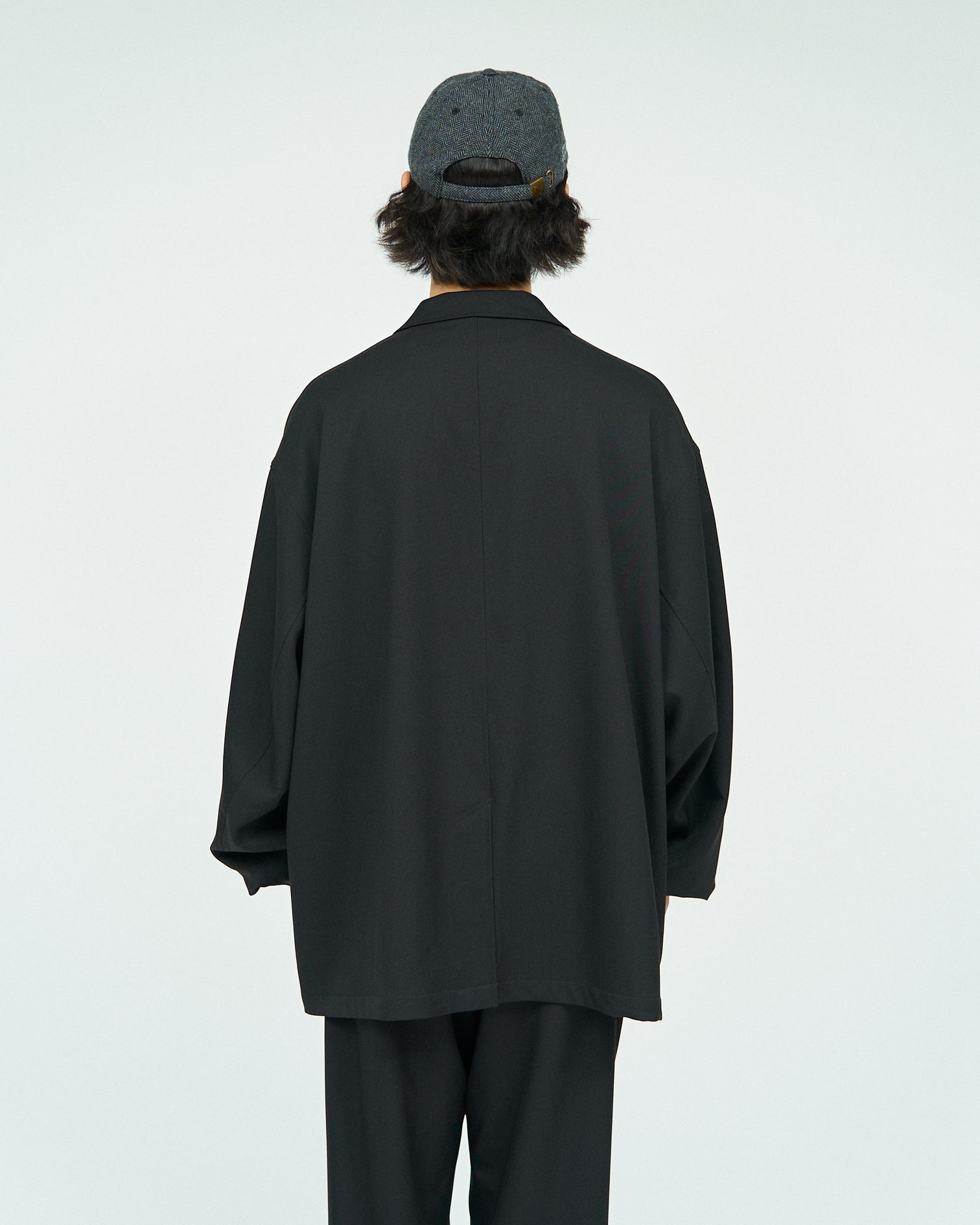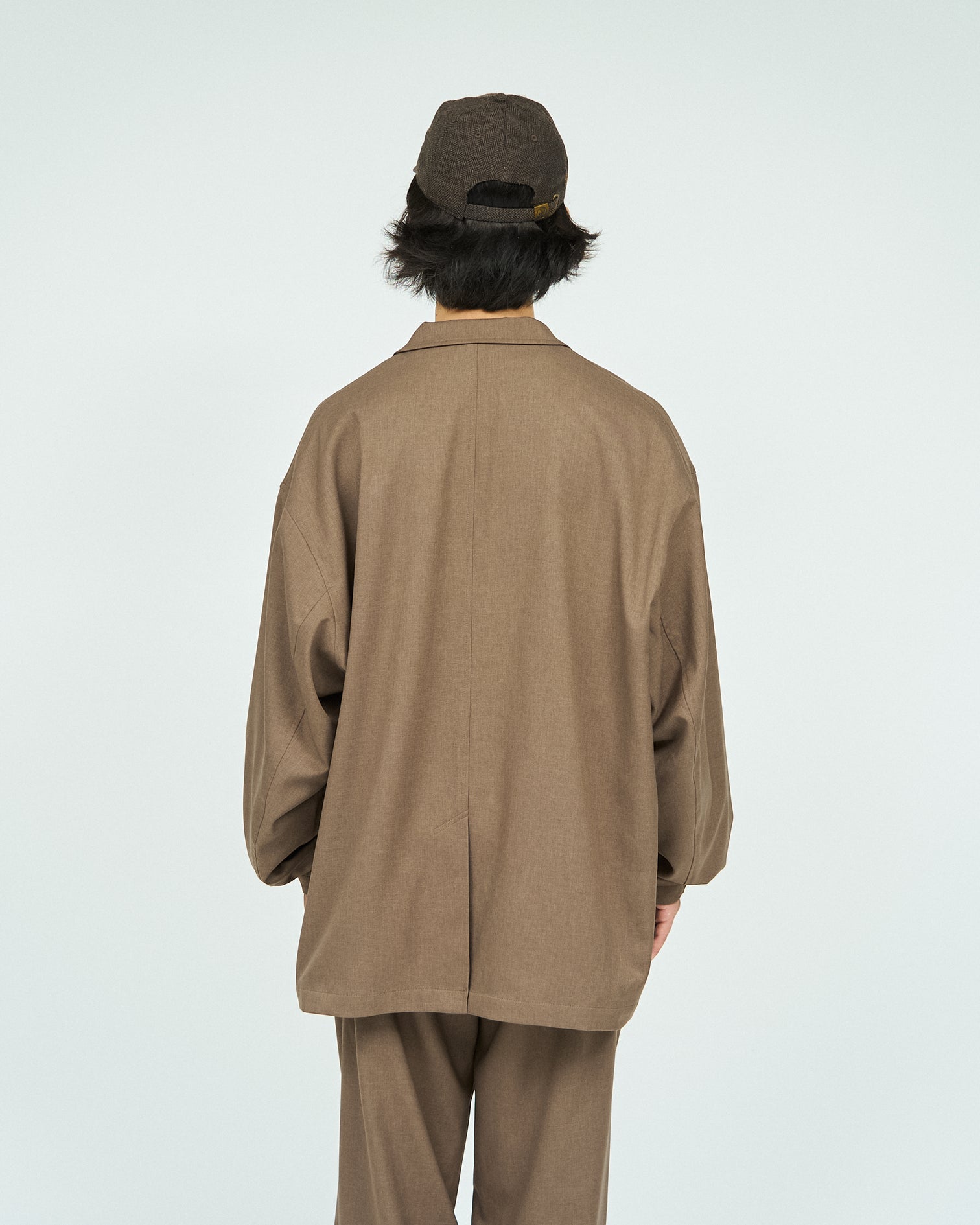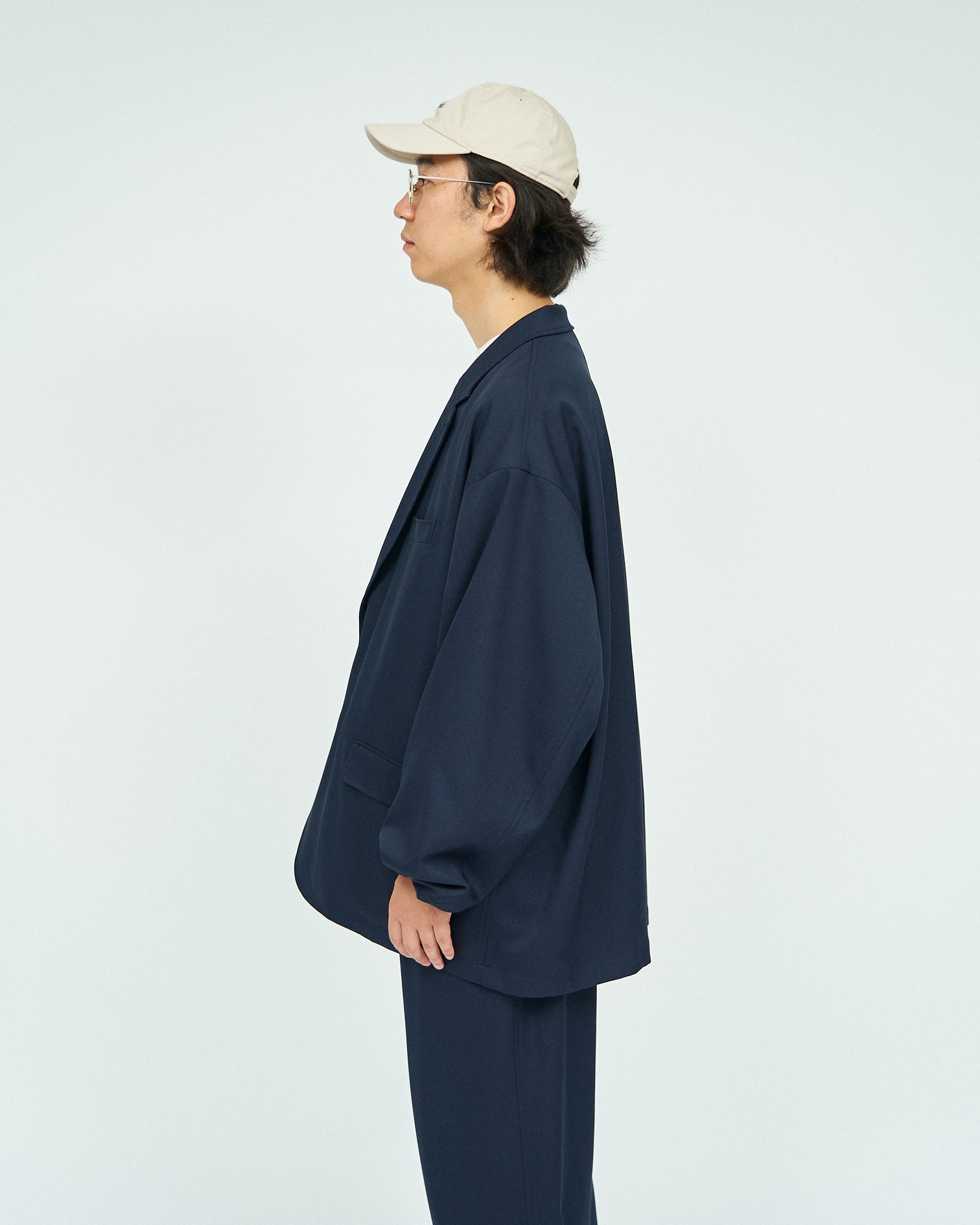 A tailored jacket with a smooth texture and an elegant sheen. It has a wool-like feel. but is made of functional material that is stretchy. pill-resistant. and can be washed at home. It can be used as a casual set-up for both work and leisure. It has a voluminous silhouette typical of FreshService. and the sleeve length can be adjusted with the snaps on the cuffs.