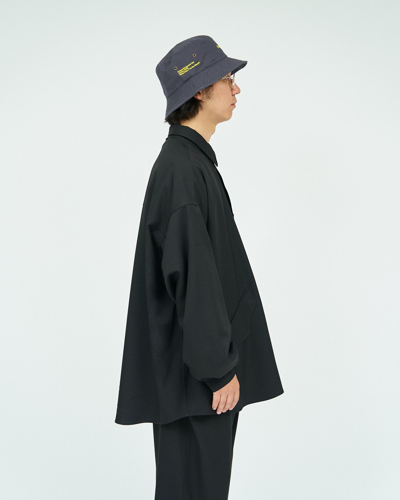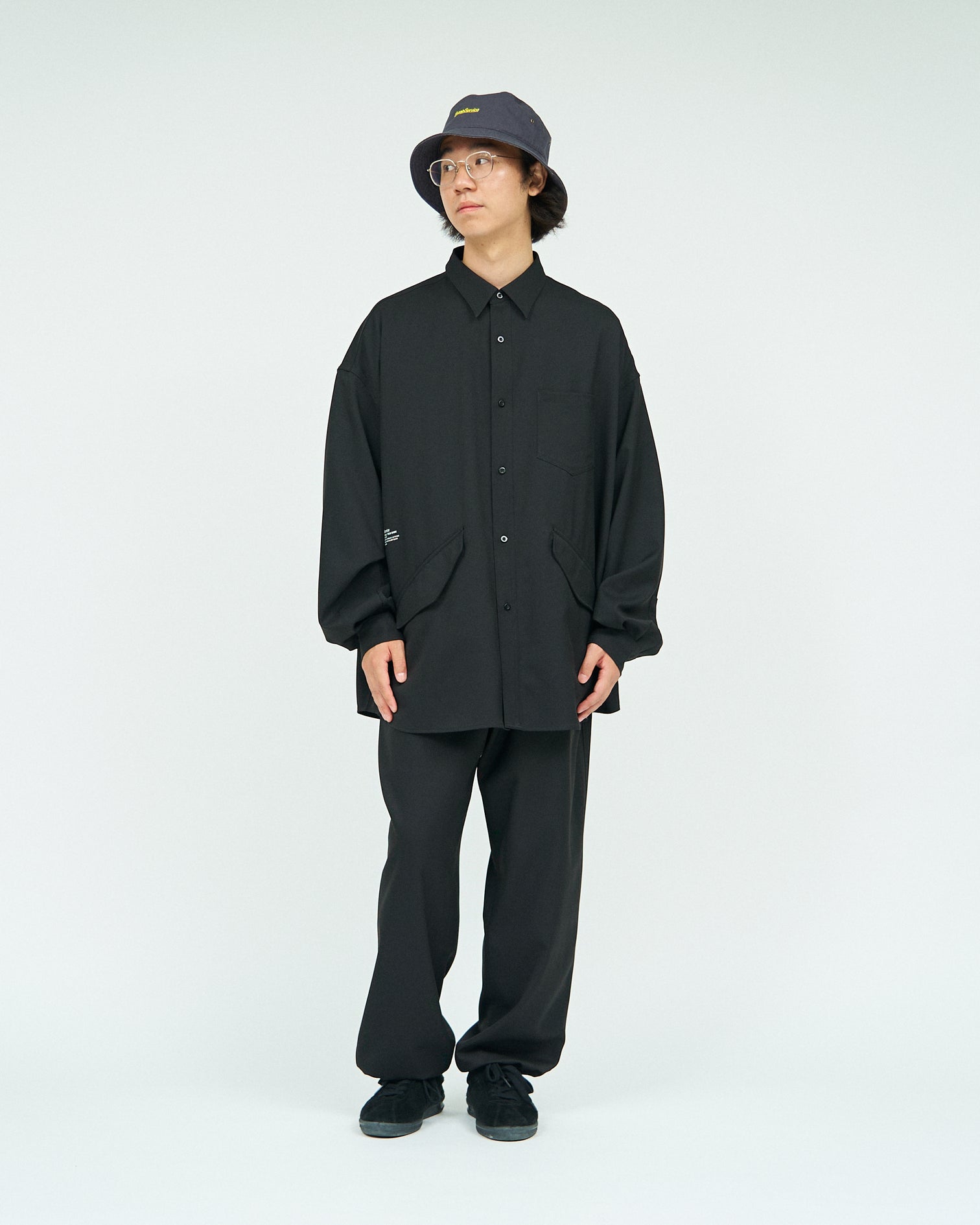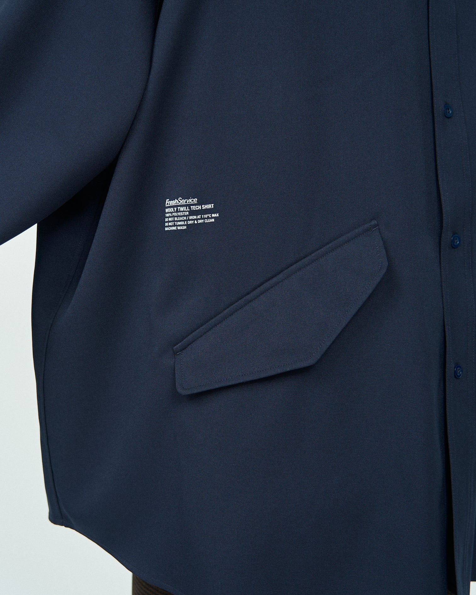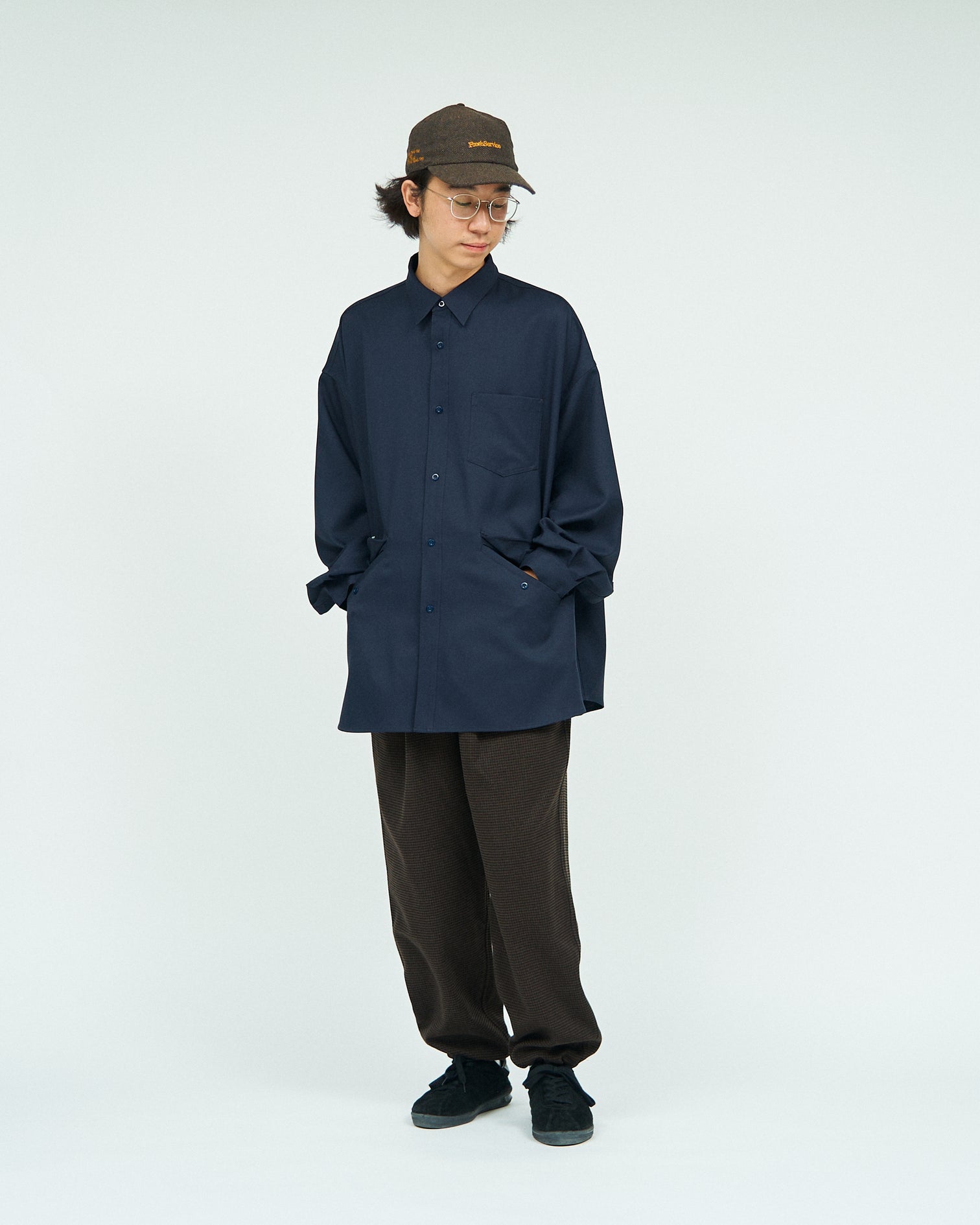 A military shirt with a smooth texture and an elegant sheen. It has a wool-like feel. but is made of functional material that is highly stretchable. resistant to pilling. and can be washed at home. The flap pockets. a detail of military pants. accent the design. making it easy to incorporate into any style. It can also be worn as a casual set with pants made of the same material.