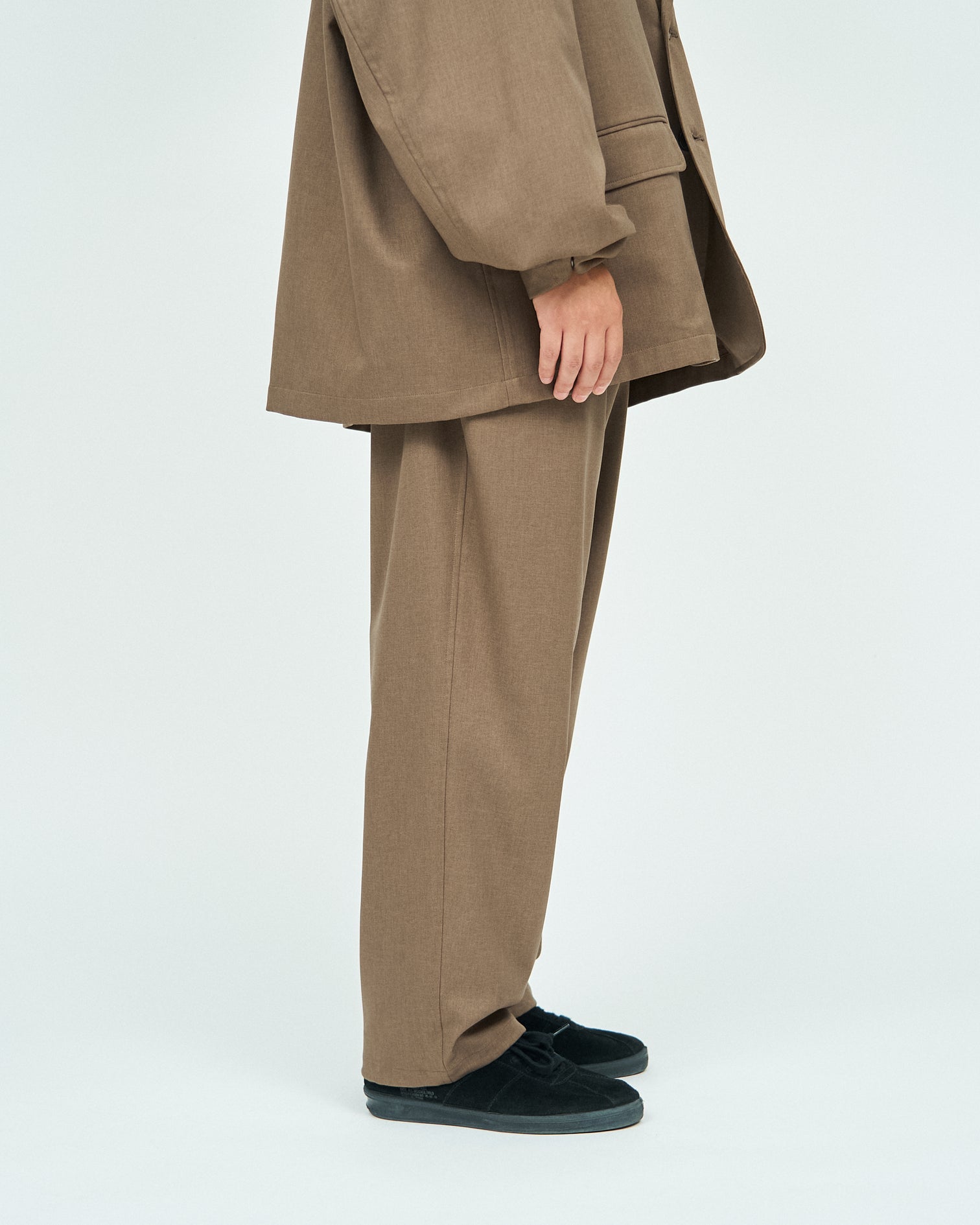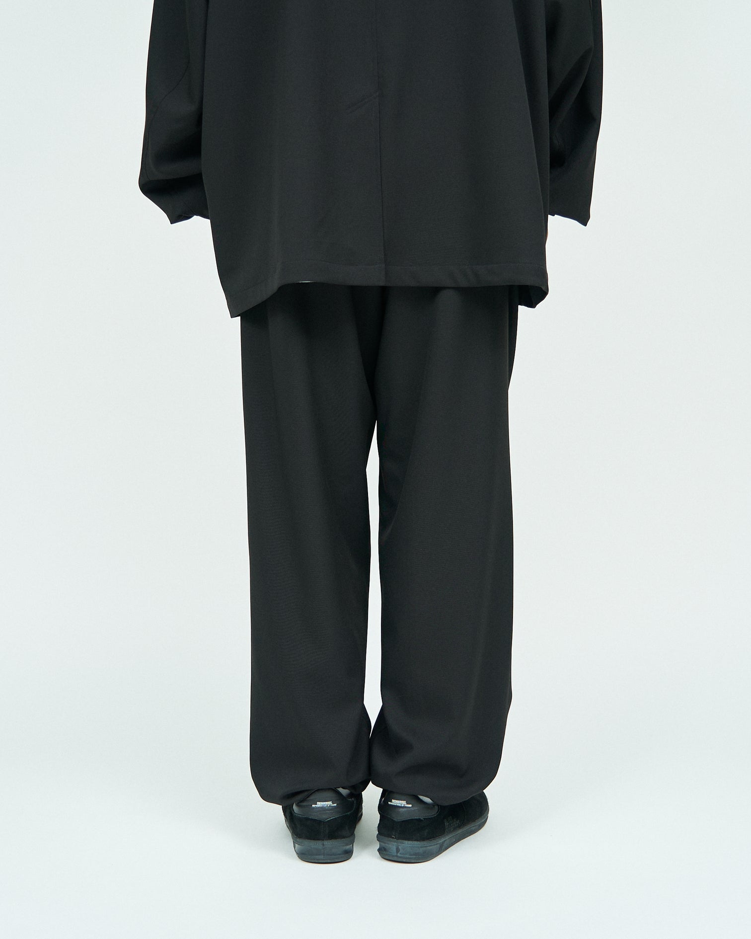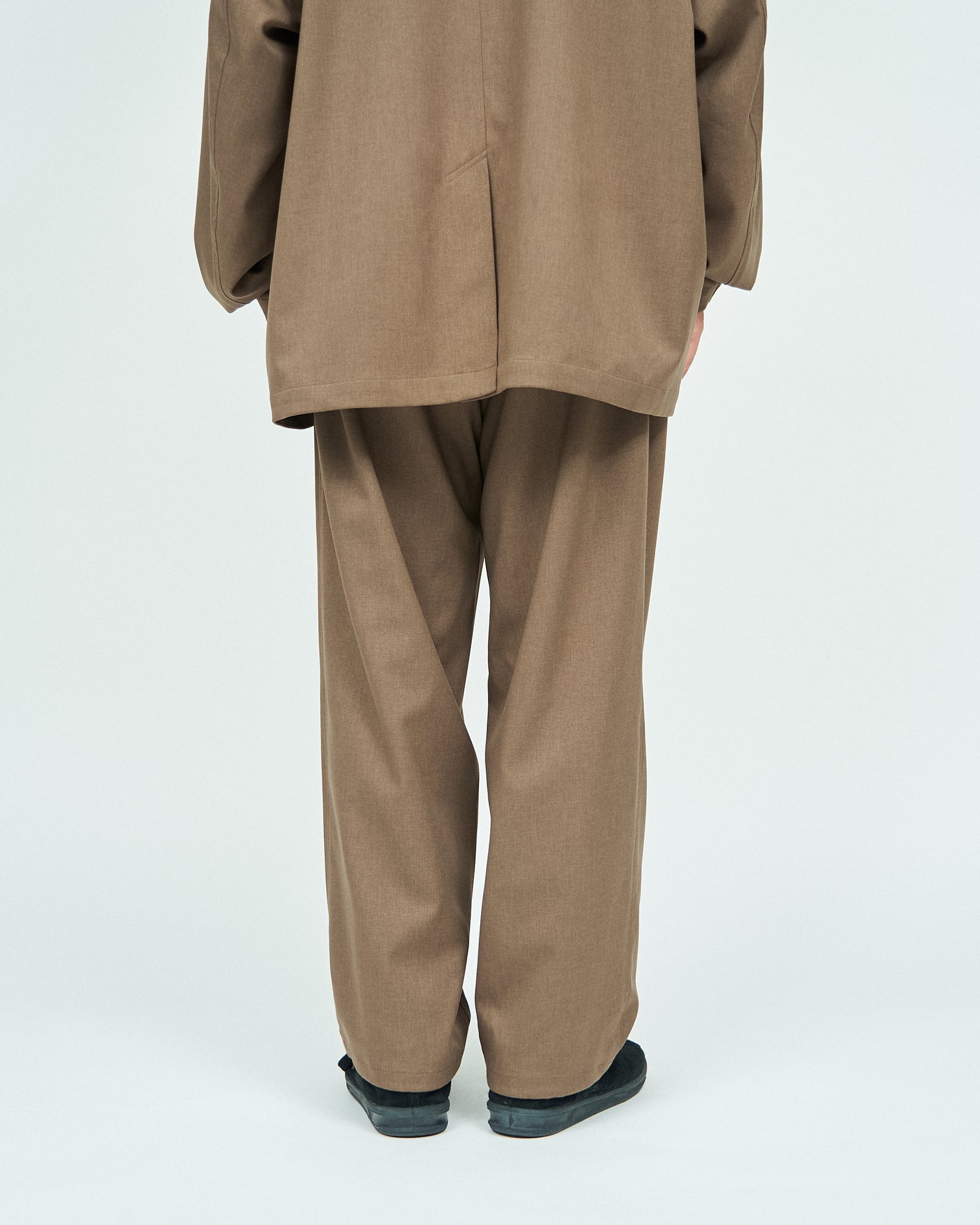 Tapered trousers with a smooth texture and elegant luster. They have a wool-like feel. but are made of functional material that is highly stretchable. resistant to pilling. and can be washed at home. They can be used as a casual set-up for both work and leisure. They can be worn alone or as part of a set with a tailored jacket made of the same material. The hem has a drawstring. so you can enjoy a silhouette that is perfect for pairing with sneakers.