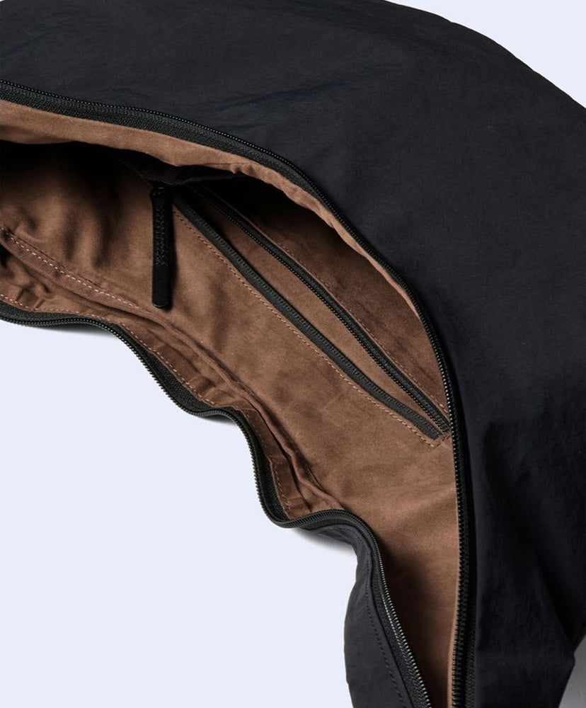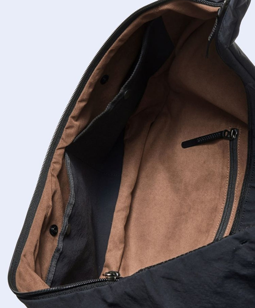 The Japanese-made nylon (56% recycled material) fabric is specially treated to increase its hardness. so it retains its shape and is resistant to deformation. while also being lightweight.
