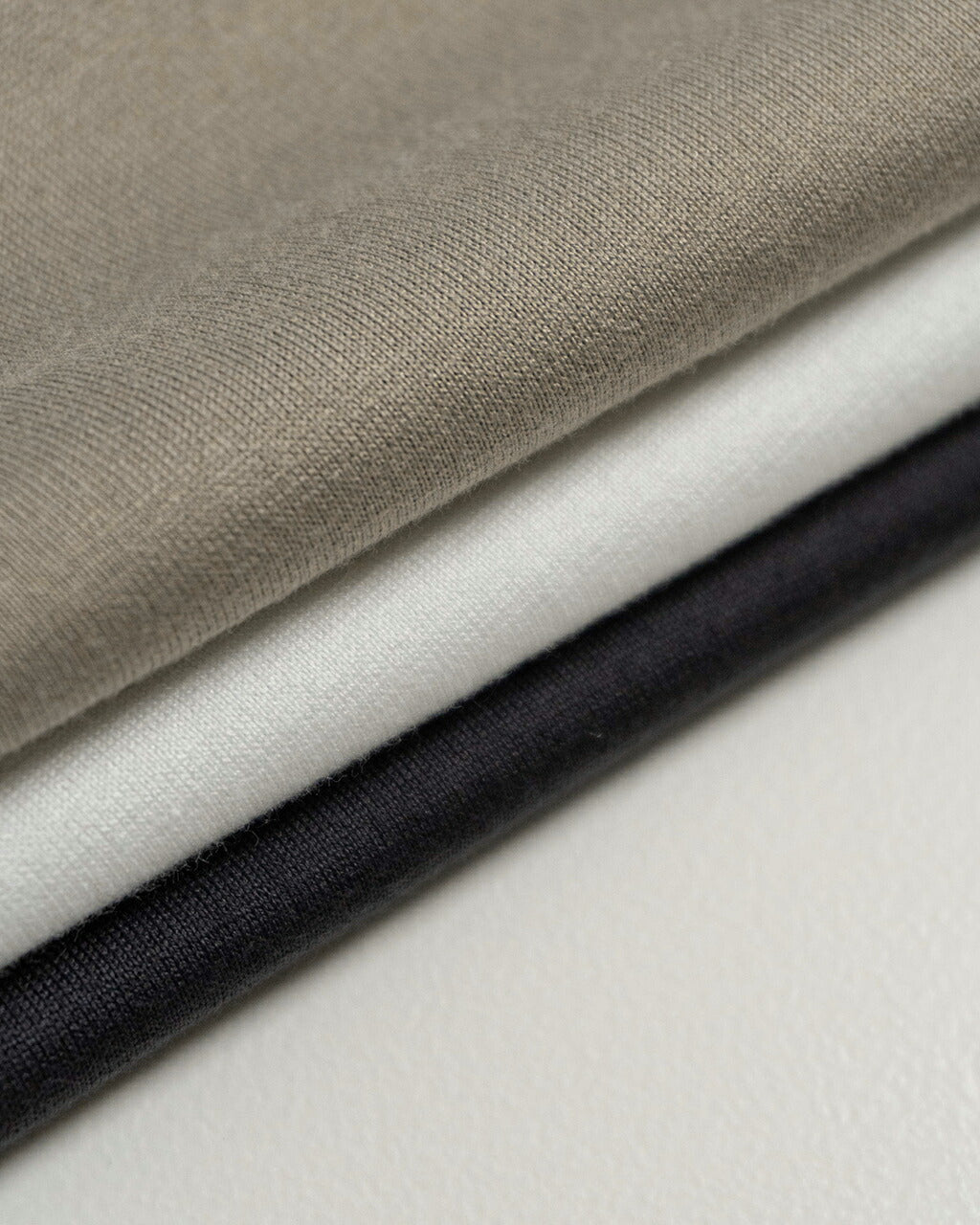 The surface is made of 100% organic extra-long cotton knitted in a high gauge to achieve an elegant luster and excellent drape.