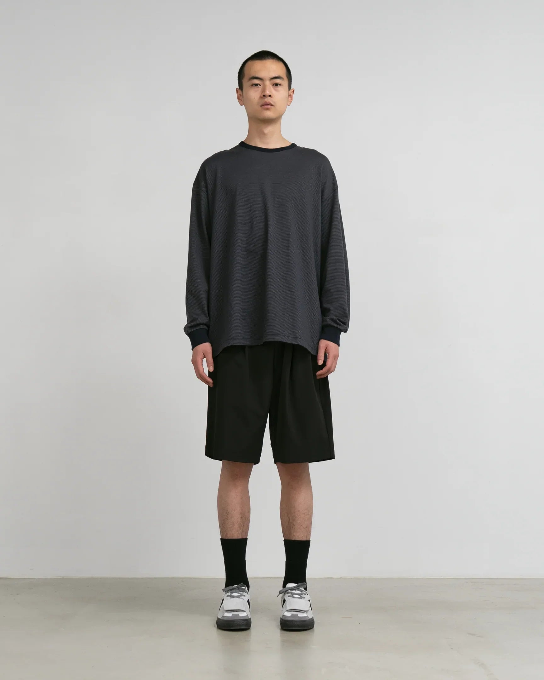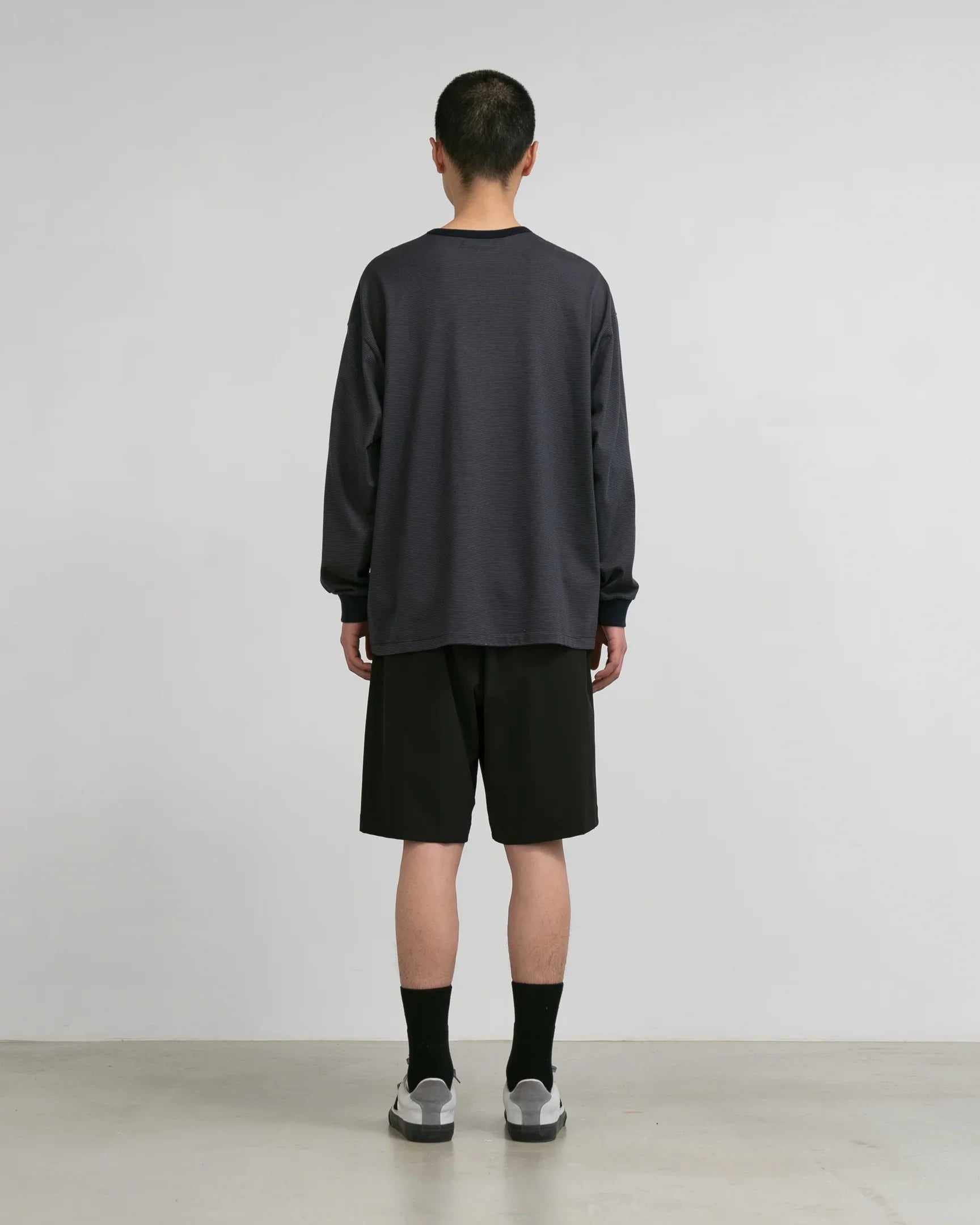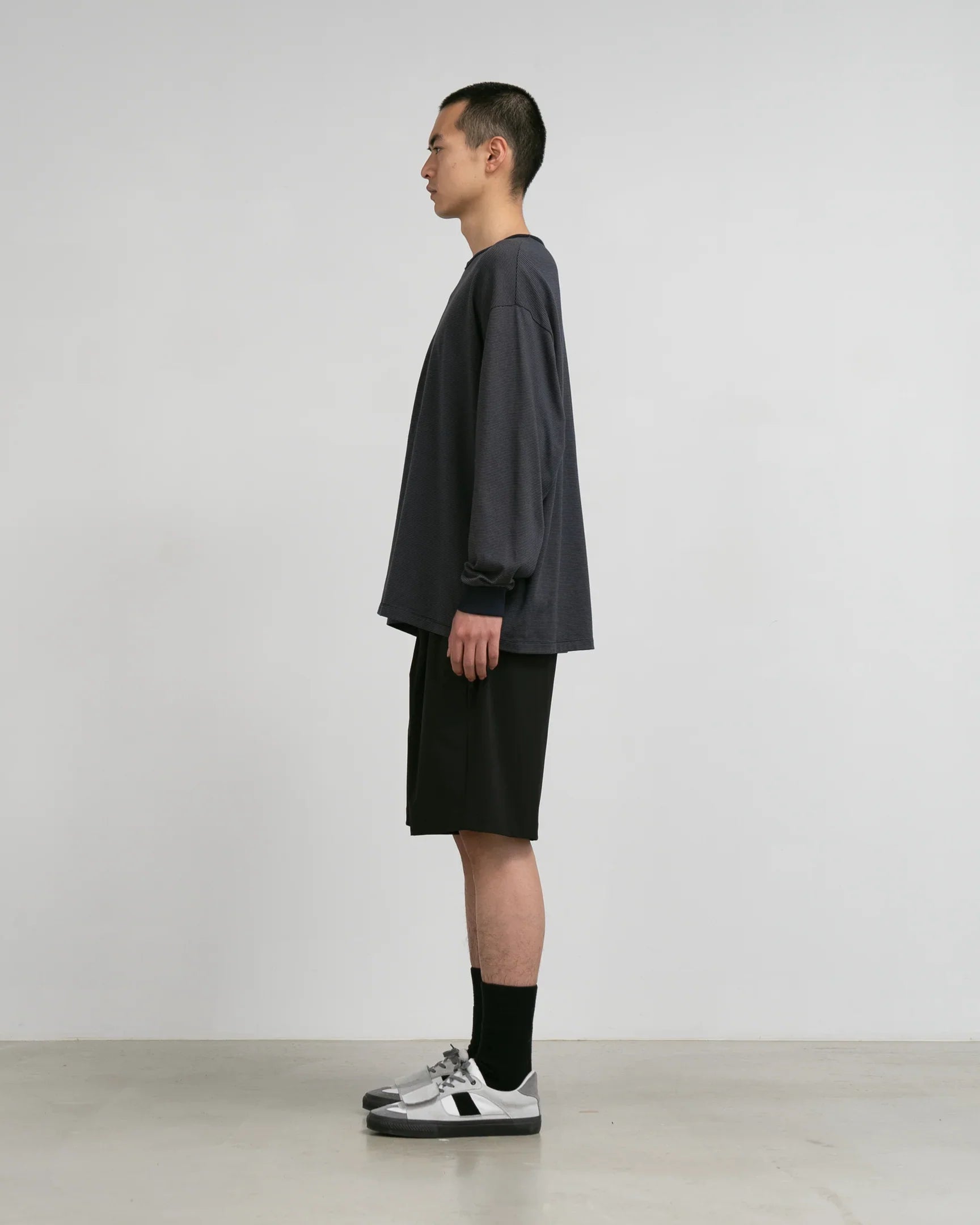 High gauge tricot made with delicate nylon thread. It has a clean look. smooth texture. and is comfortable to wear with a refreshing feel and stretch. A functional material that has been treated with a water-repellent finish to prevent some rain and dirt. These classic shorts allow you to easily adjust the waist size and customize the silhouette. A pattern with gussets on the inner thighs allows for excellent leg opening.