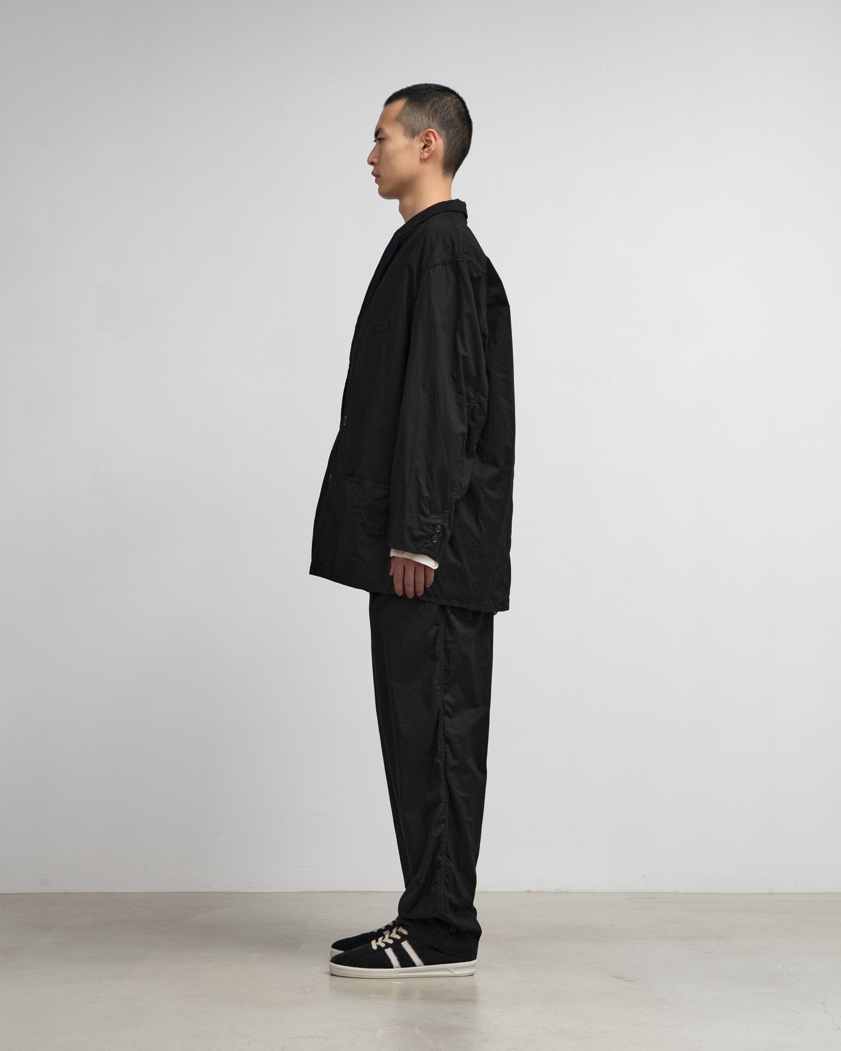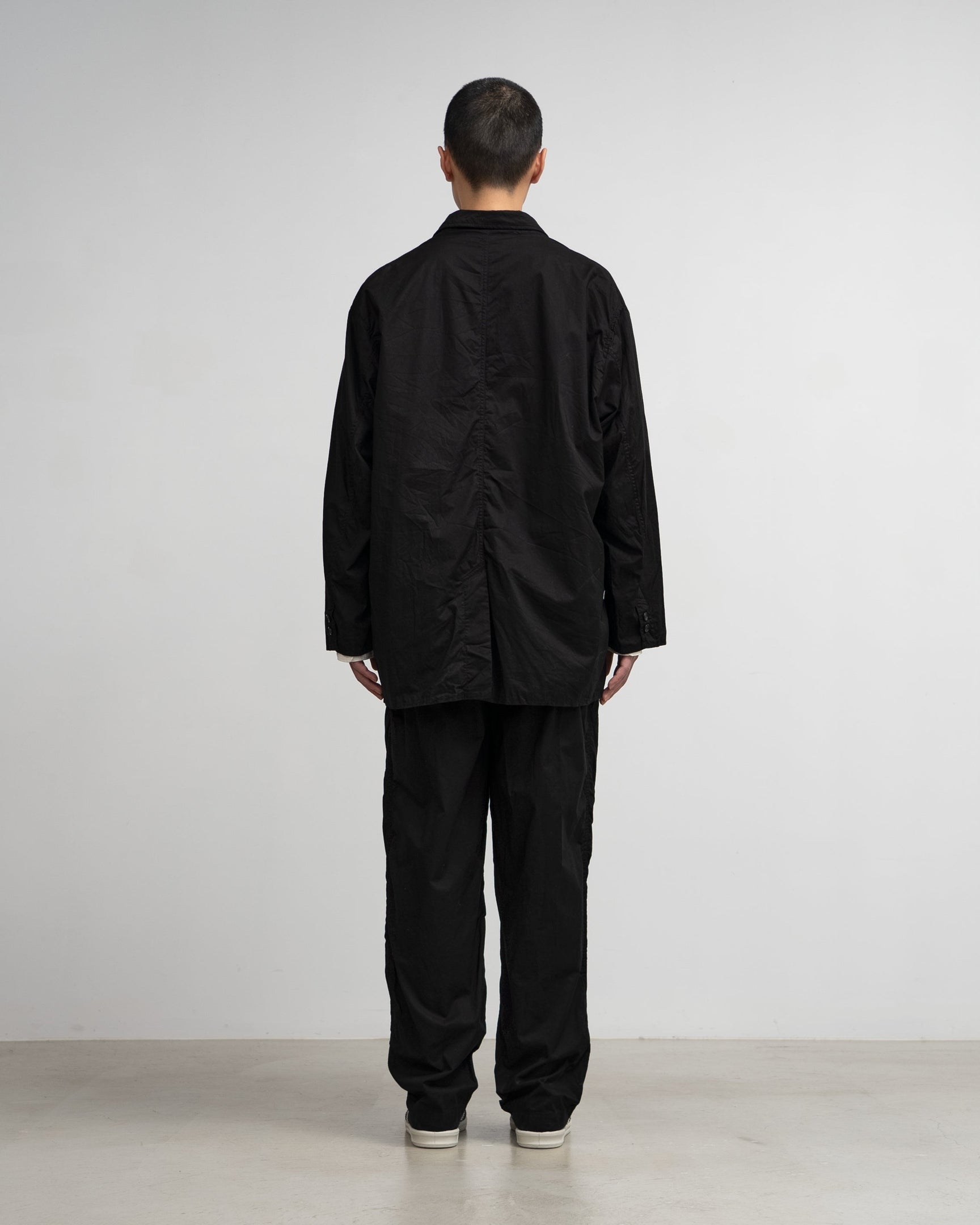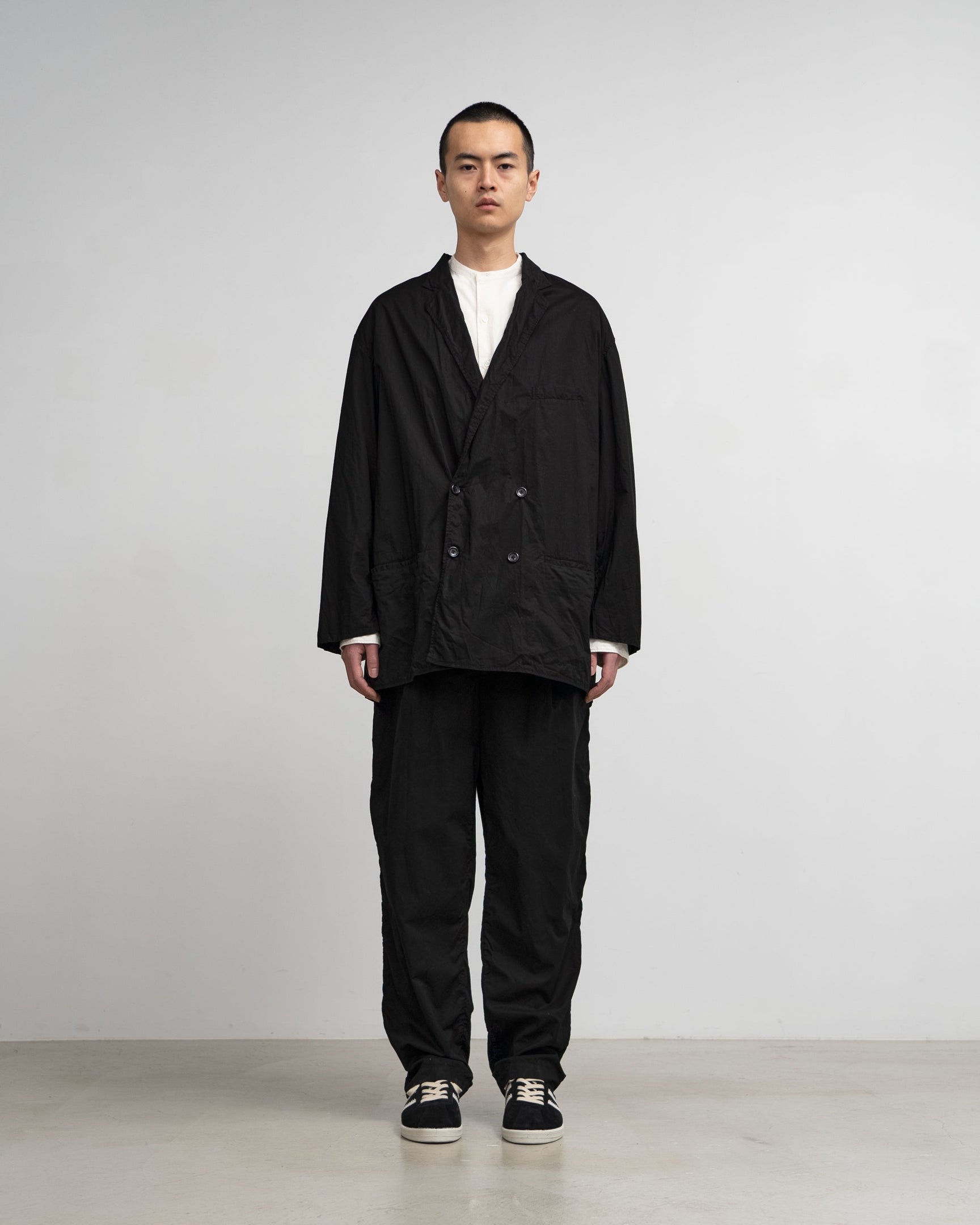 Cotton typewriter is a very delicate material that is densely woven. giving it a smooth texture and a moderate firmness. This double-breasted jacket is made with this fabric on both the front and back. It is wrapped and sewn with thick thread and dyed after production. giving it a unique texture and shrinkage. It has a voluminous boxy silhouette and is available in three sizes to suit your body type.