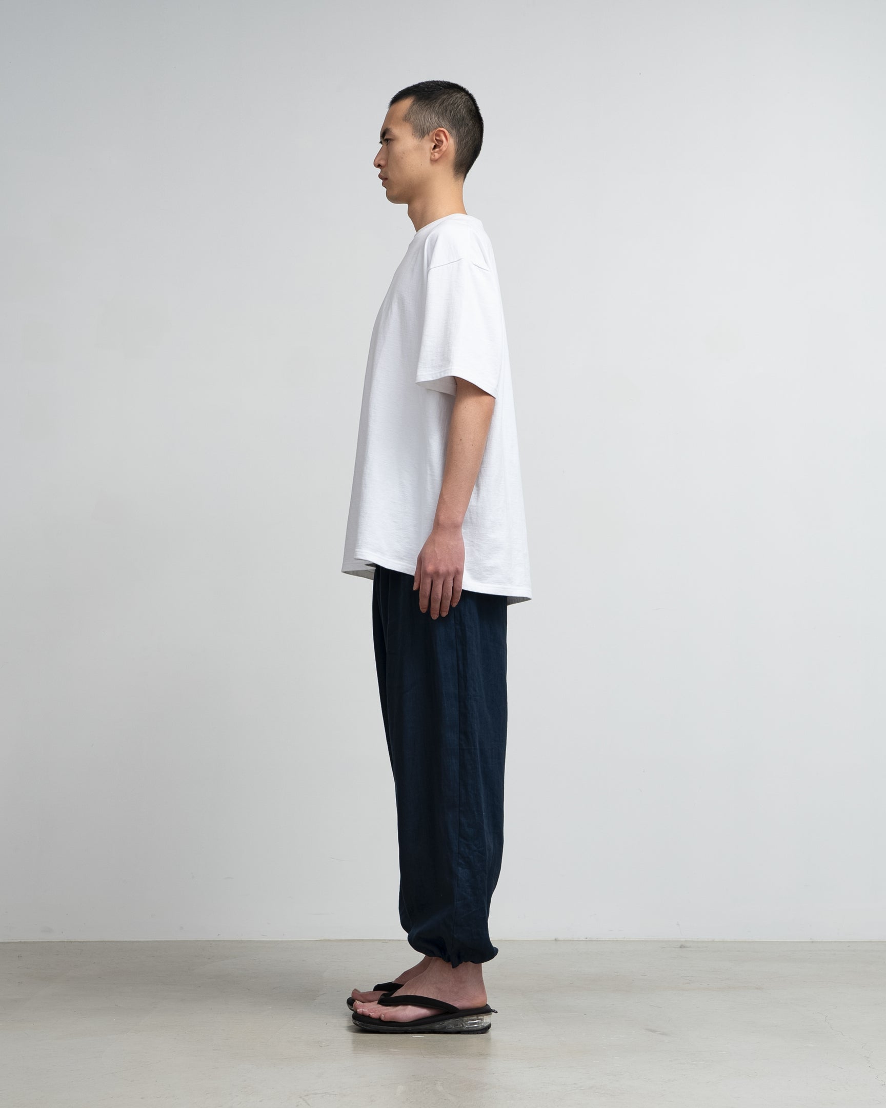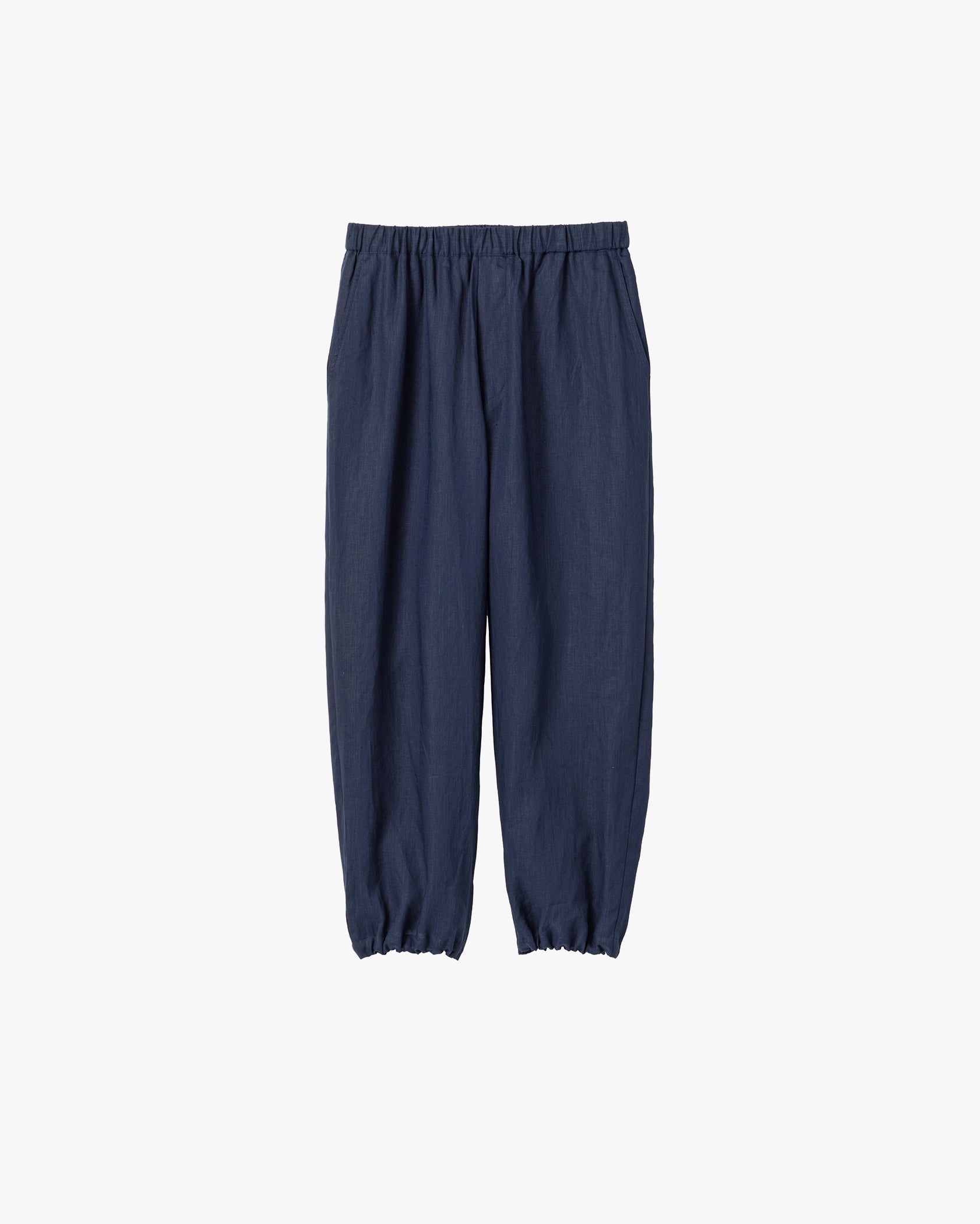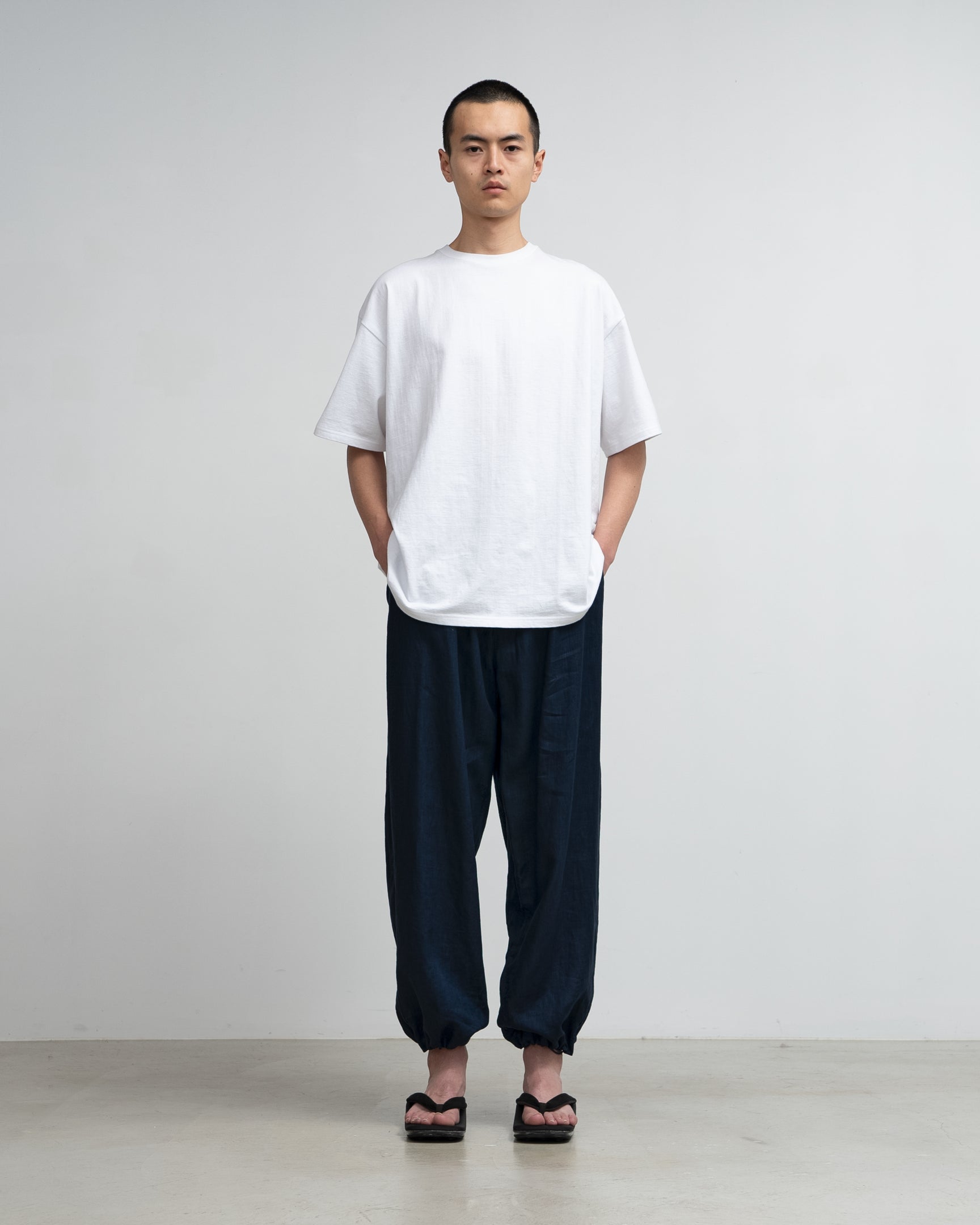 Track pants made from extremely fine linen yarn from France. Ultra-fine linen yarn with a count of 80 or higher is extremely rare and valuable. and is characterized by a smooth texture that feels nice to the touch. It has better water absorption and wicking properties than cotton. making it a refreshing and cool piece. It has a wide tapered silhouette with room around the waist and can be adjusted with a drawcord at the hem.