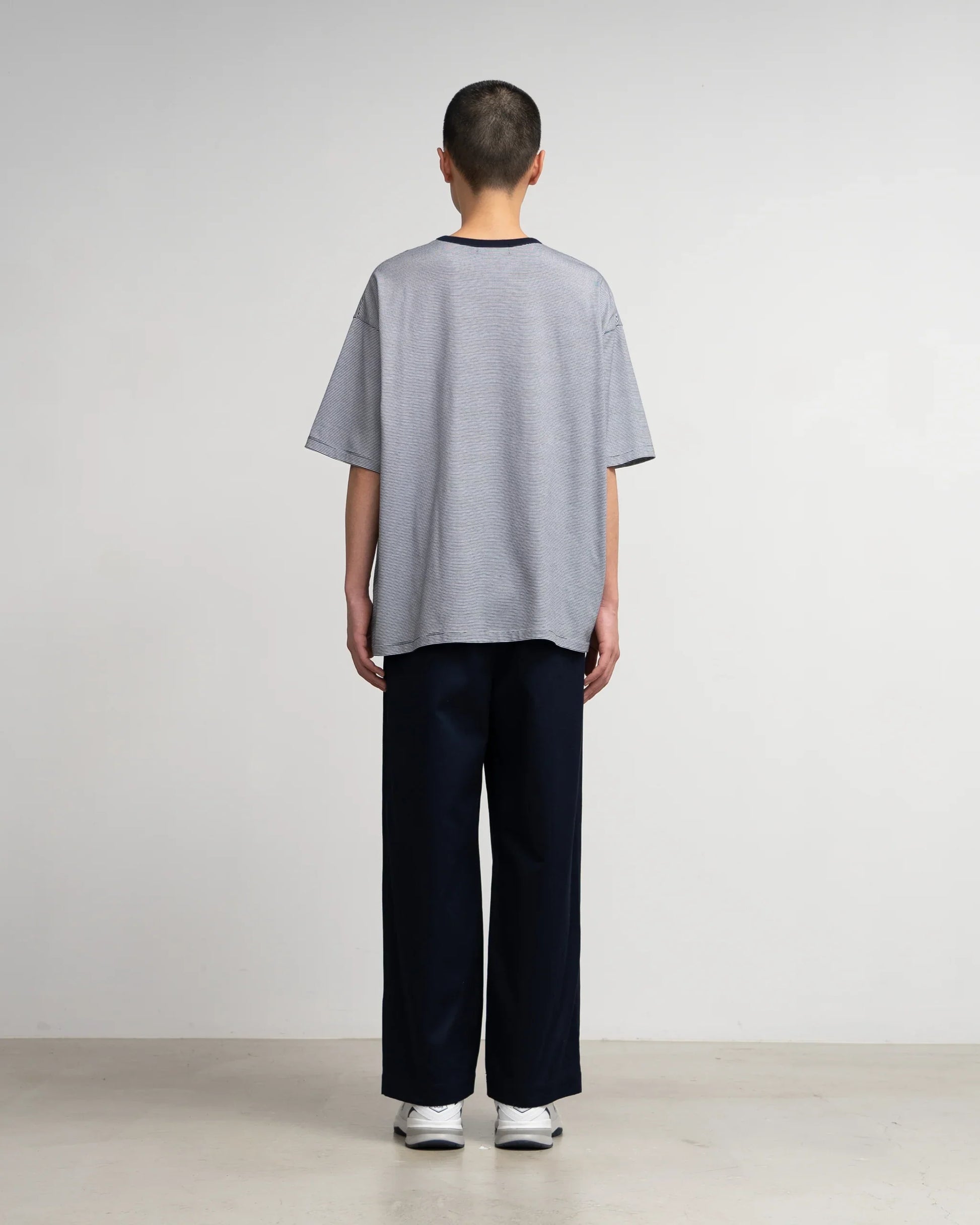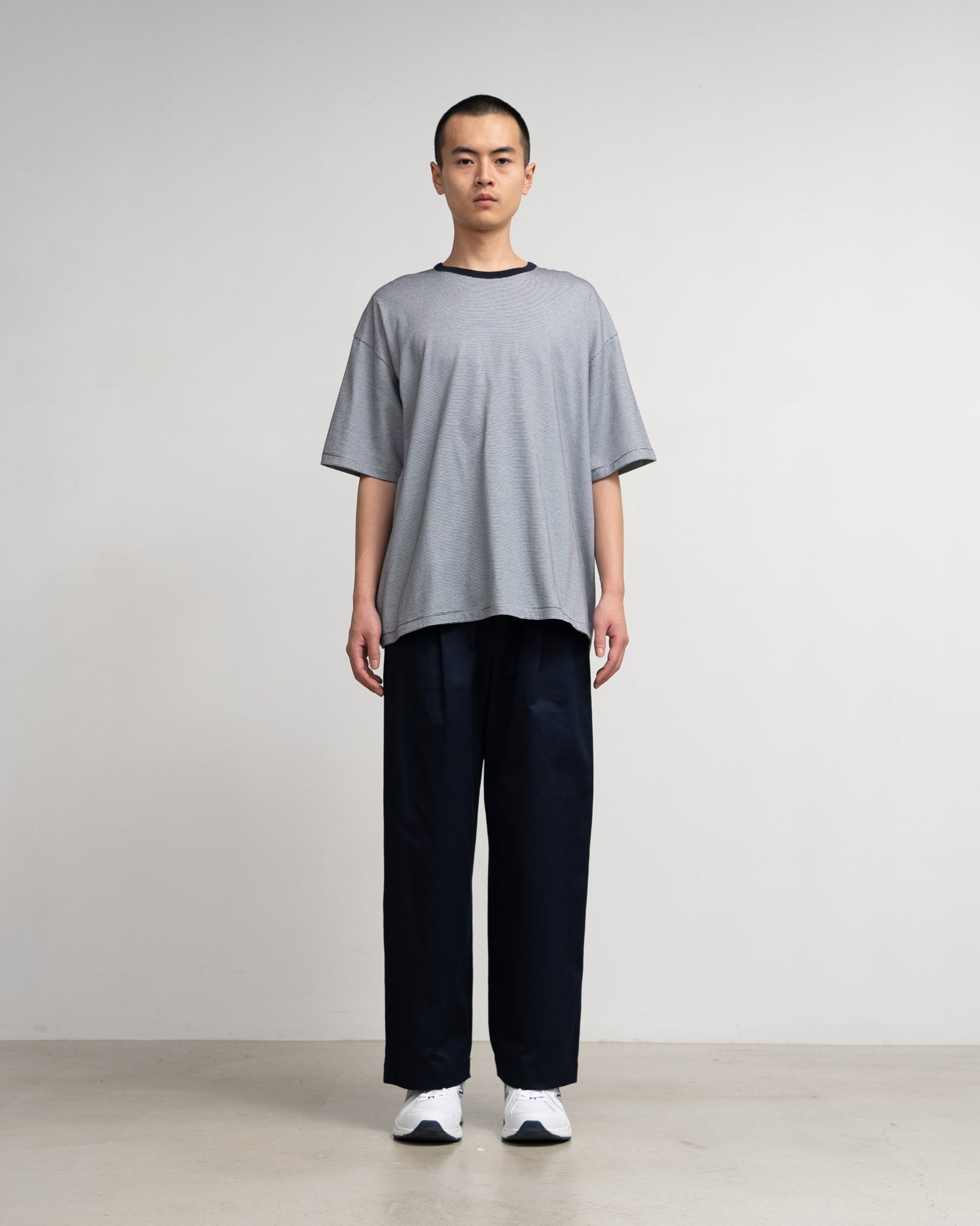 A short-sleeved T-shirt with a binder neck and a roomy. oversized silhouette. The jersey material is knitted with SUVIN cotton blend yarn. which has a smooth texture and elegant luster. The clear surface with little pilling makes the thin boat pattern stand out.