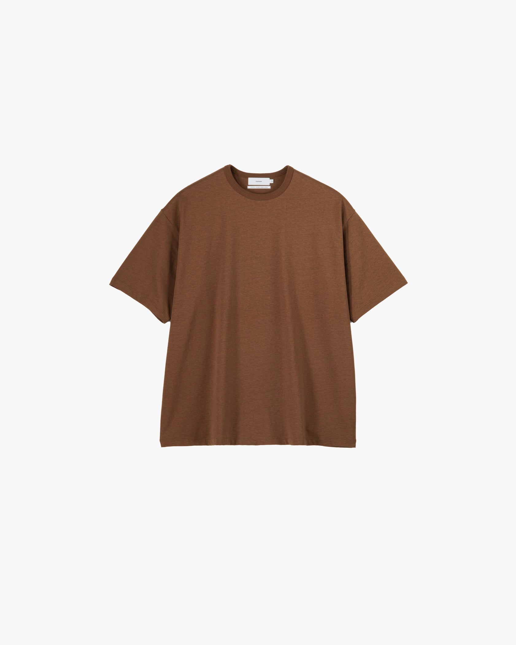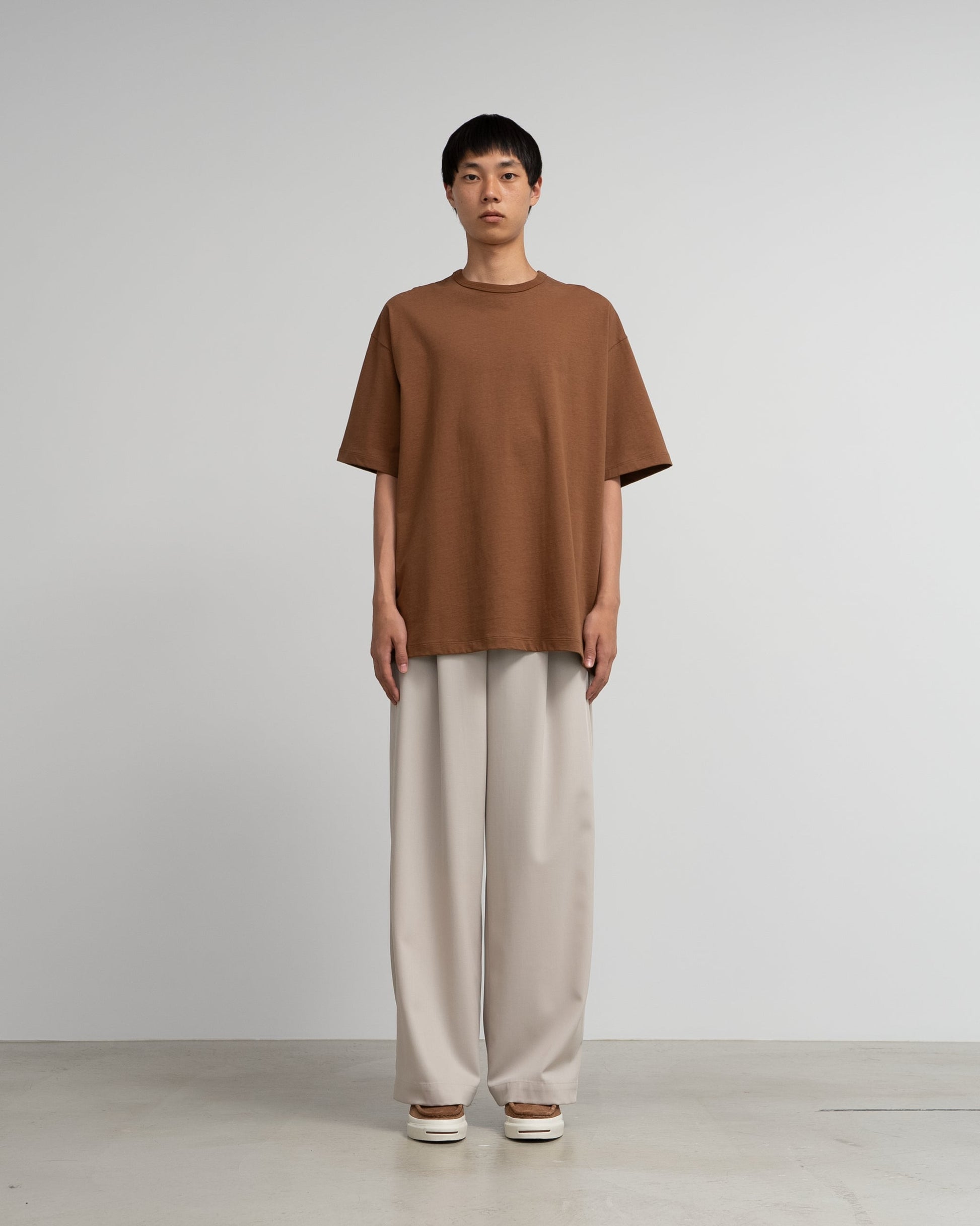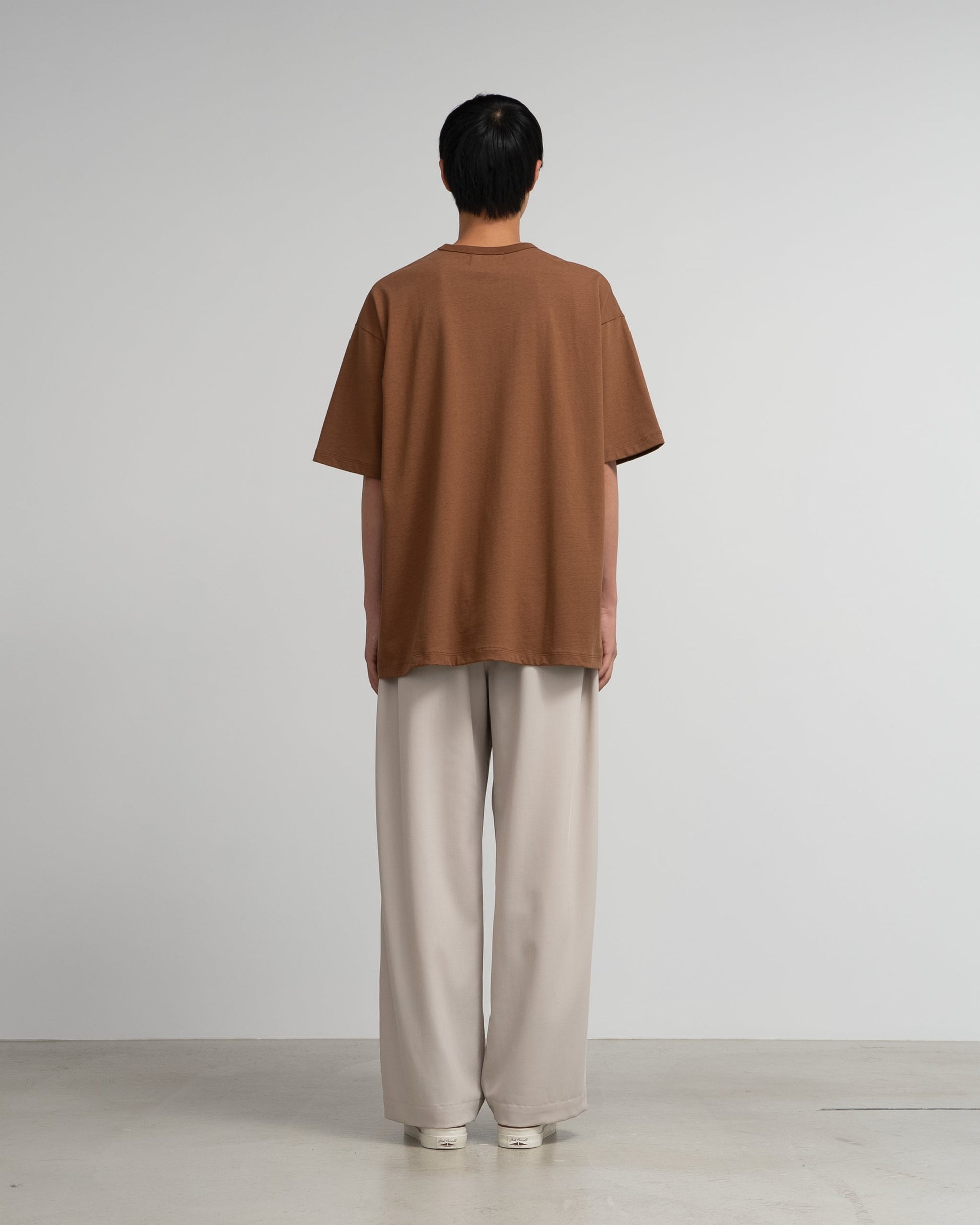 A short-sleeved T-shirt with a loose box silhouette and binder neck. The cotton waste. which has a unique uneven texture. is pulled together in a fine count yarn to the limit. creating a dense weave. giving the jersey material a rough yet delicate feel. In addition. the surface is given a special micro-brushing to give it a unique smooth feel and soft texture.