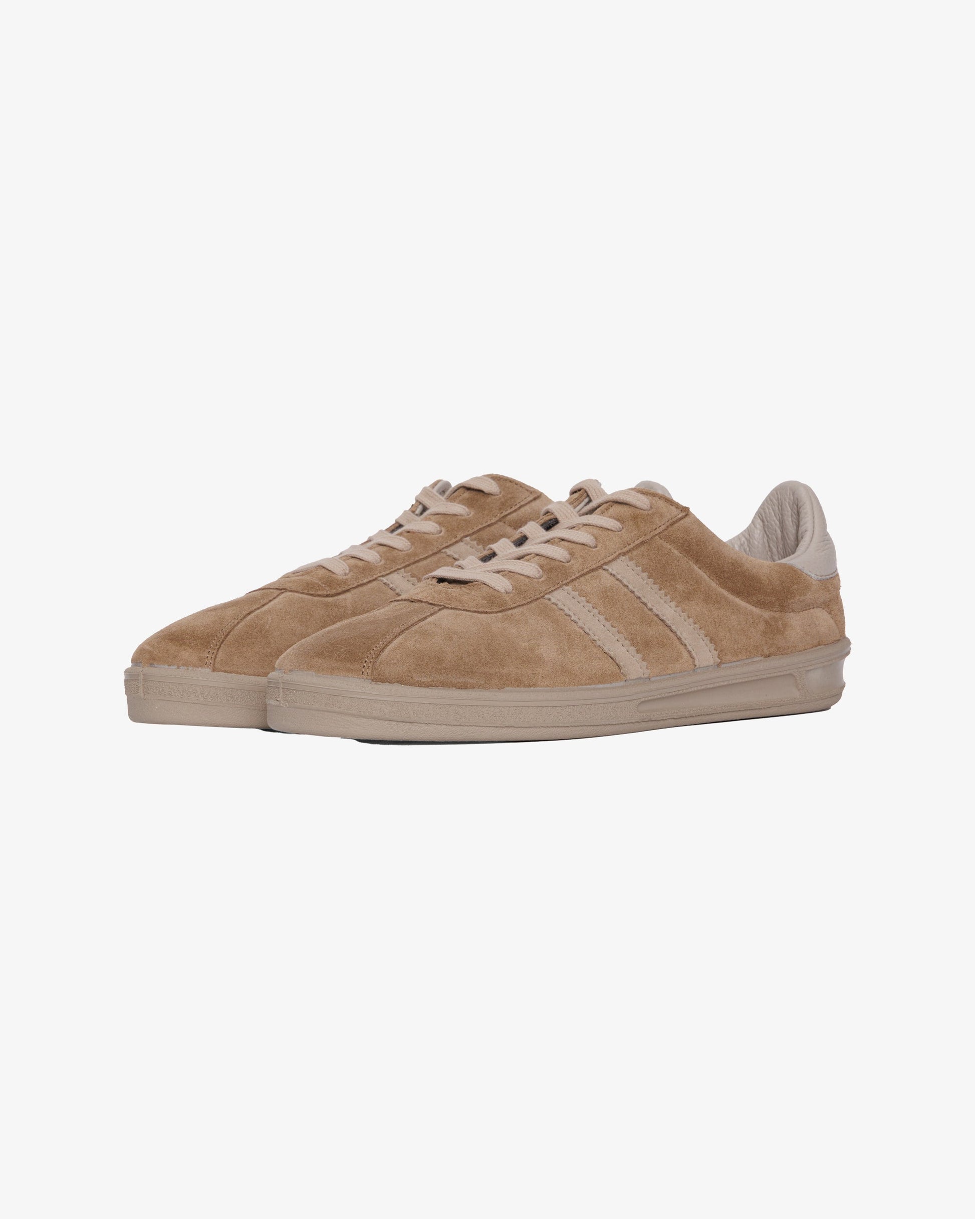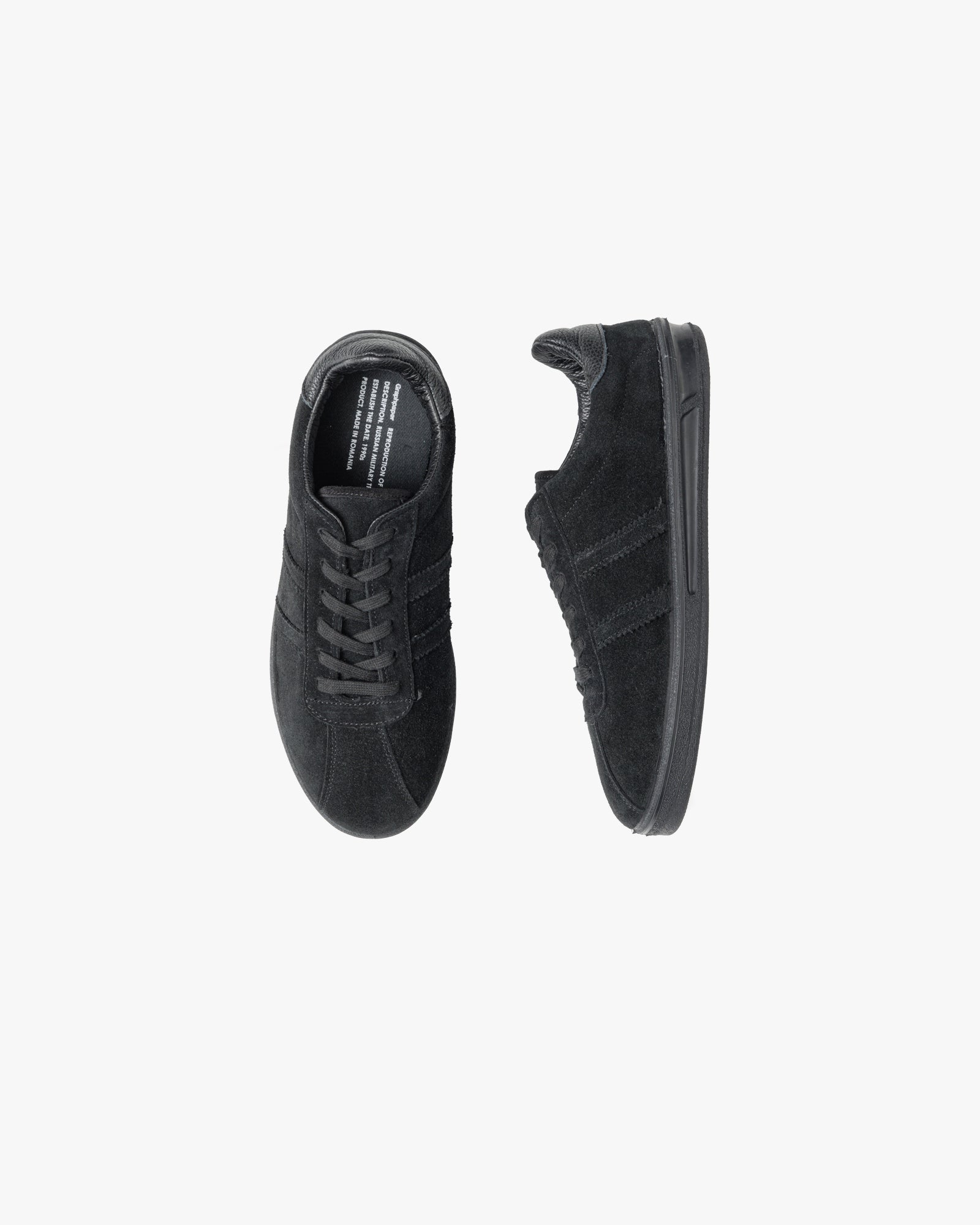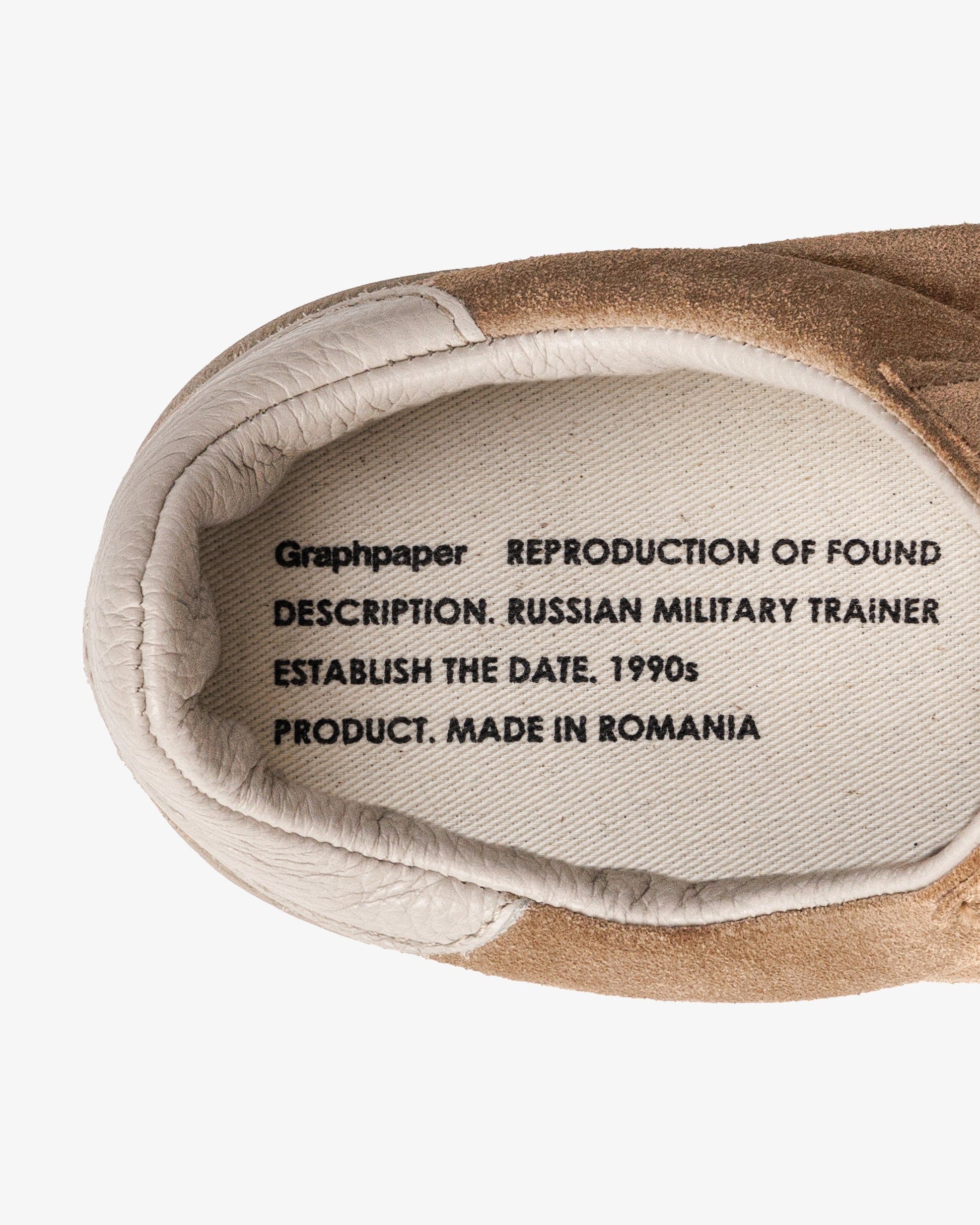 A collaboration sneaker with REPRODUCTION OF FOUND. The sneakers used as training shoes by the Russian military in the 1990s were commonly known as "Russian trainers". Based on these sneakers. a factory that produced military shoes was commissioned to recreate them in a modern style. The upper is made of high-quality Italian suede. the side lines. heel. and collar lining are made of high-quality Italian shrink leather. and the sole is made of a high-quality natural rubber EVA insole that is flexible. durable. and cushioned.