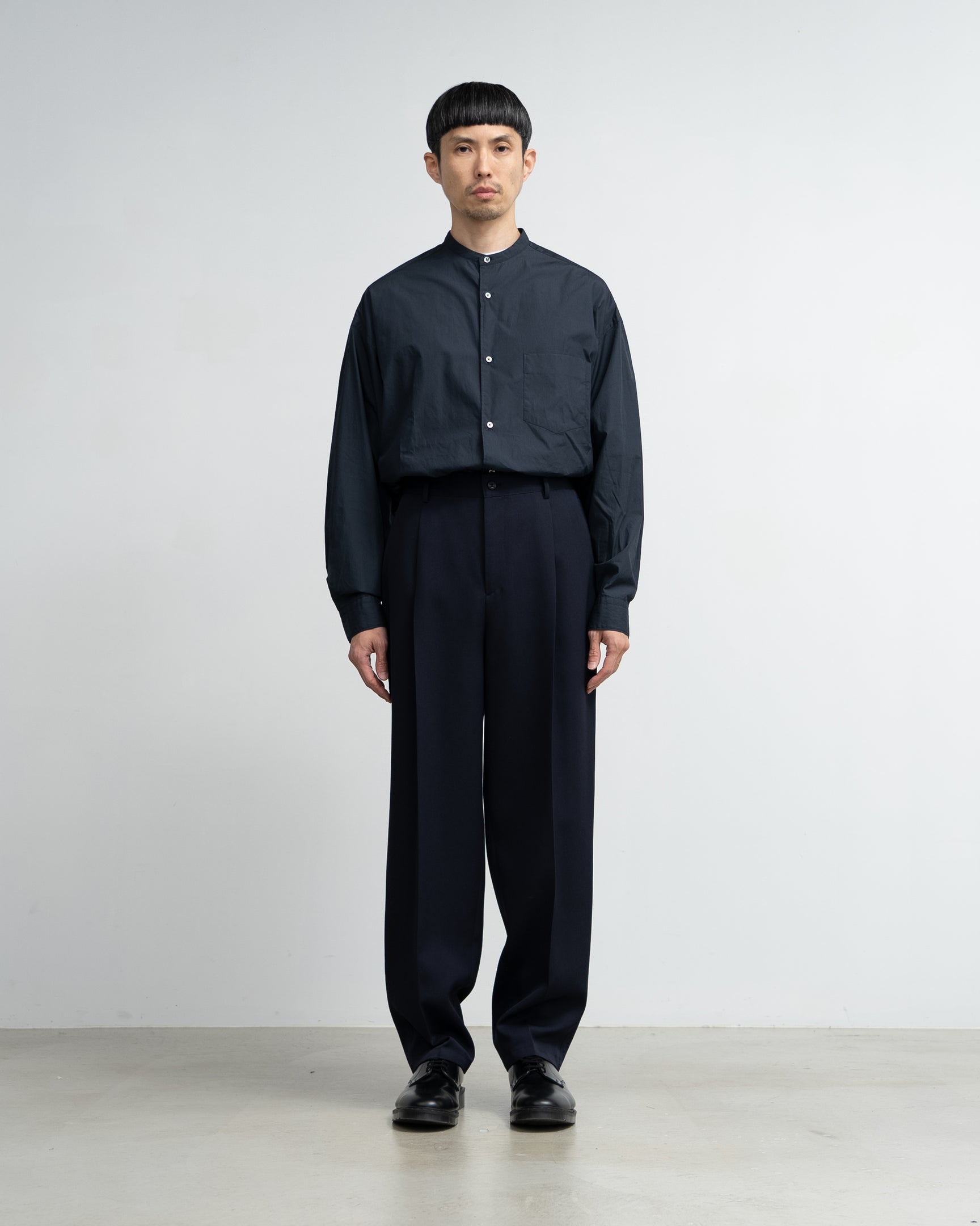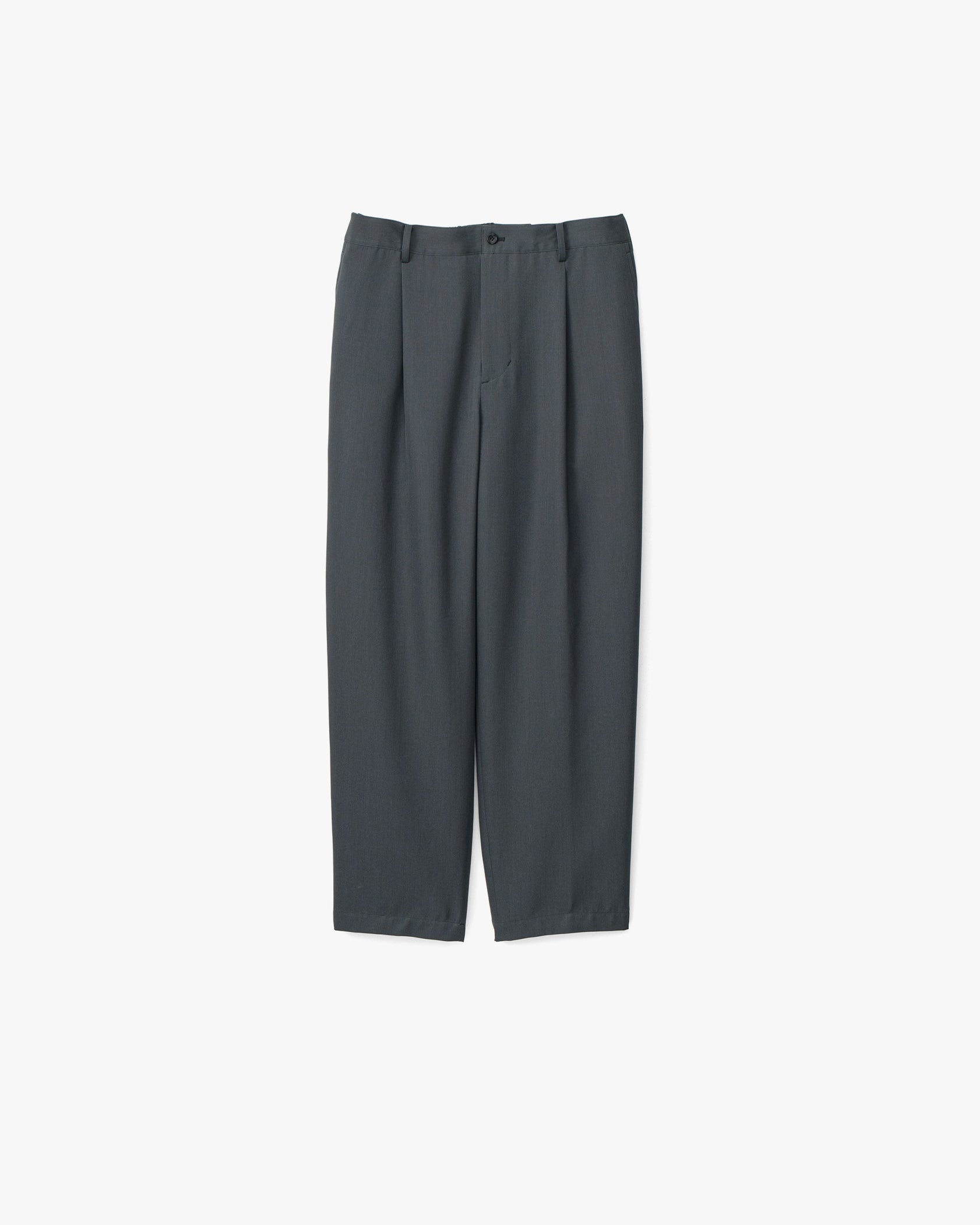 Wool gabardine with high warp density and weft threads woven to the limit to produce the most beautiful twill weave. A special resin is permeated into the wool fibers to create a filament-like luster and clear texture. Tapered slacks with elastic at the back of the waist for an easy fit. with tucks at the front for a classic look and a suiting style.