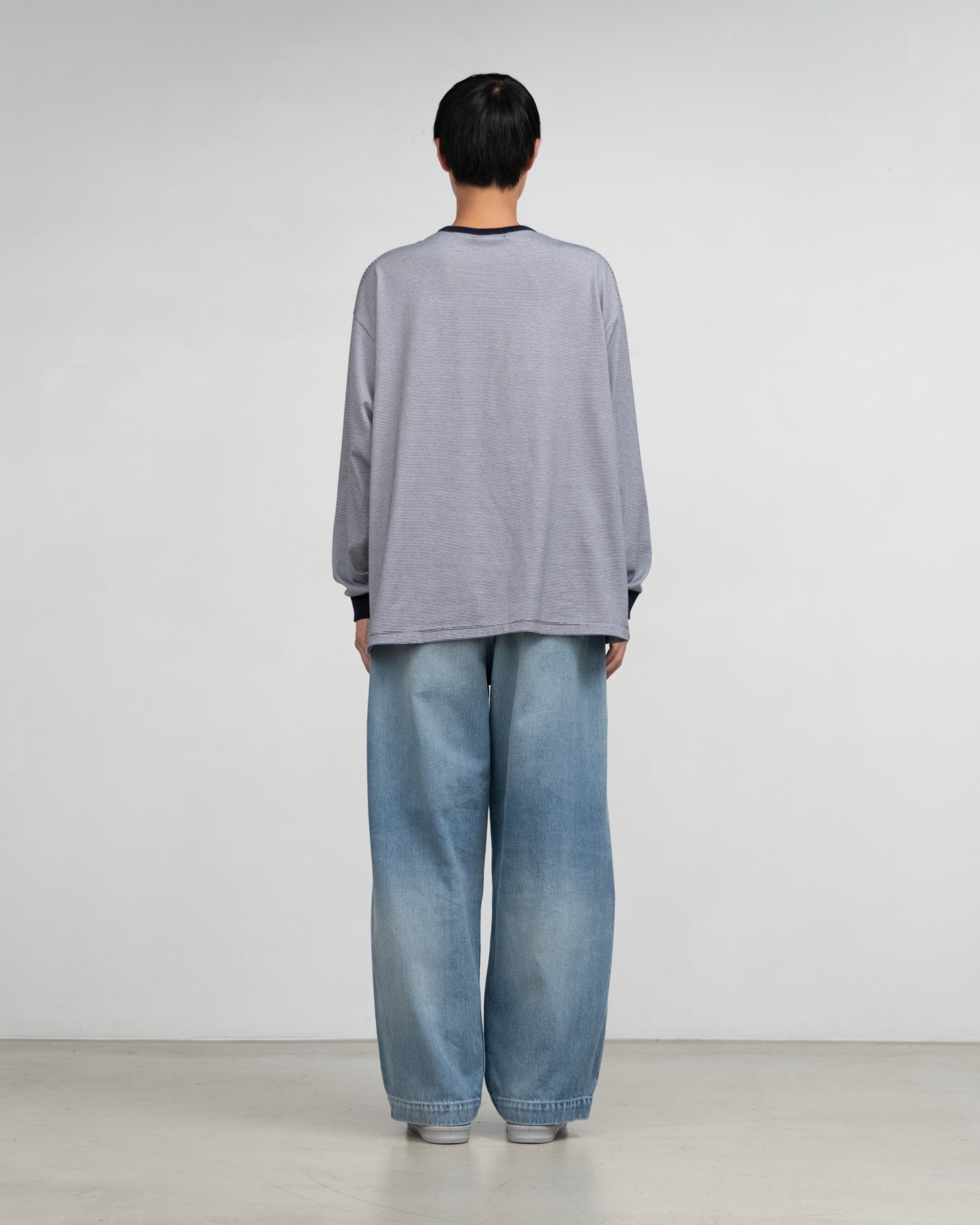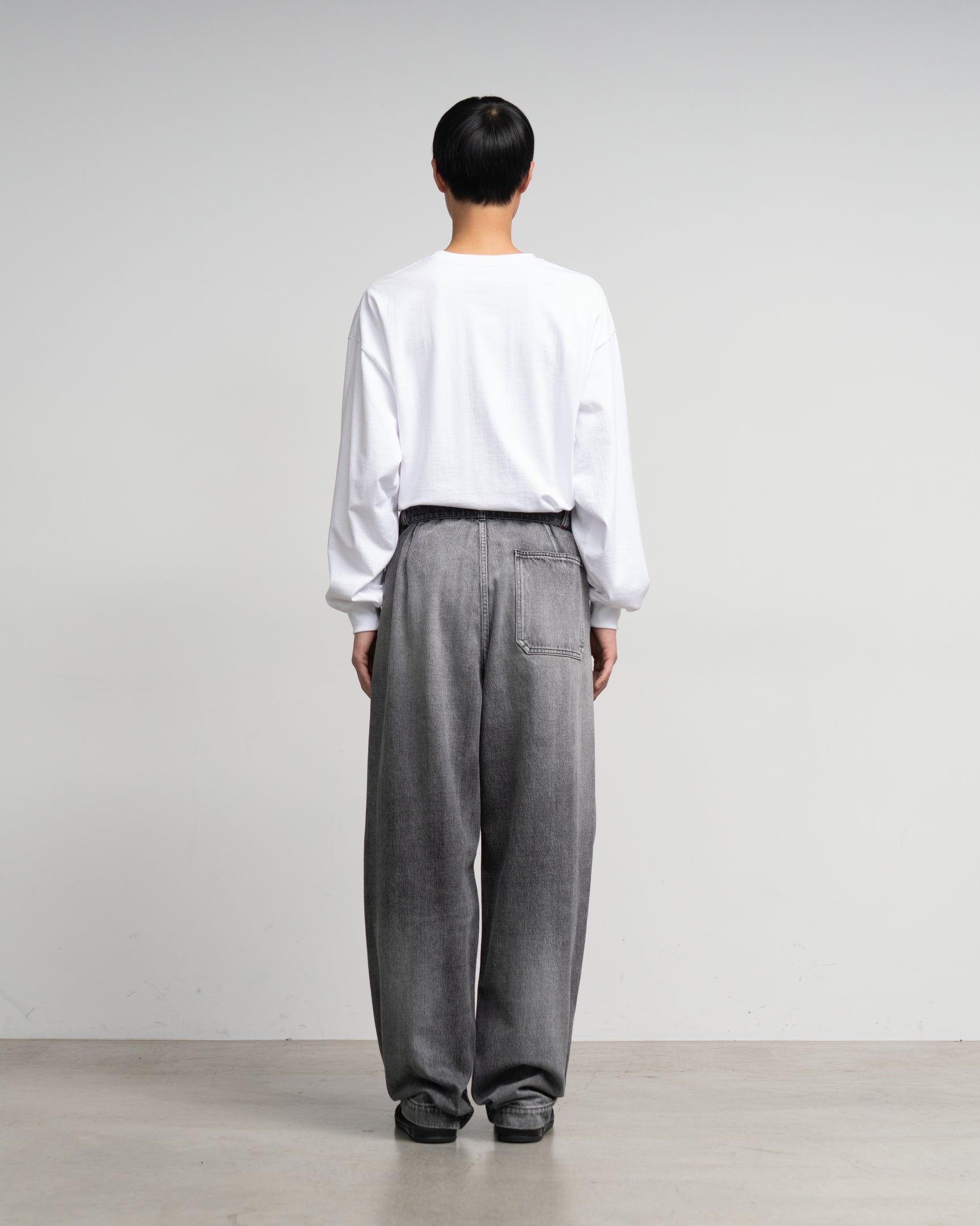 13.75 oz selvedge denim made by Cone Denim. an American company with 130 years of history. The most suitable raw cotton blend for denim fabric is spun with unique know-how. and the warp threads are dyed with dark pure indigo to create a vivid and natural vertical fade. The rough unevenness and irregularities on the surface of the fabric. created by slowly weaving it on an old-fashioned power loom. create an attractive material that gives the original texture of denim. High-waisted pants with one tuck at the front and a belt made of the same fabric. A wide silhouette with moderate room around the waist and a slight taper towards the hem. A rigid type that fades beautifully and tastefully with long wear.