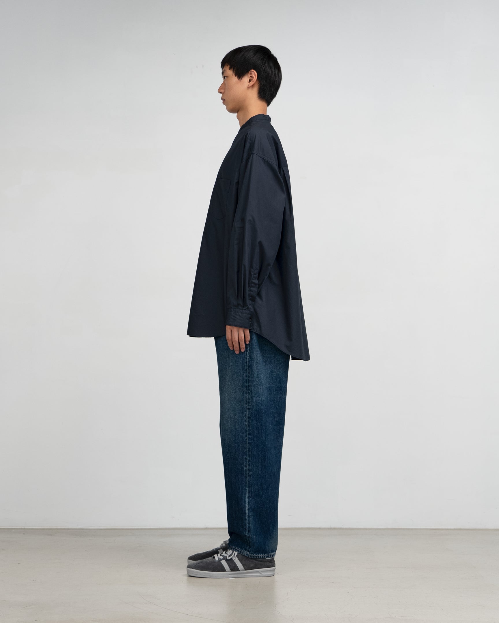 13.75 oz selvedge denim made by Cone Denim. a US company with 130 years of history. Black denim joins the lineup this season. The warp threads are made from a blend of raw cotton that is best suited for denim fabric. spun with unique know-how. and dyed with dark pure indigo to create a vivid and natural vertical fading. The rough unevenness and irregularities on the surface of the fabric. created by slowly weaving it on an old-fashioned power loom. give this attractive material a sense of the original texture of denim. Relaxed fit five-pocket pants with a loose fit around the thighs and a gentle taper to the hem. The tuck buttons are engraved with the logo. and the waist is decorated with a clean tanned leather patch. The rigid type will fade beautifully and become more tasteful with long wear.