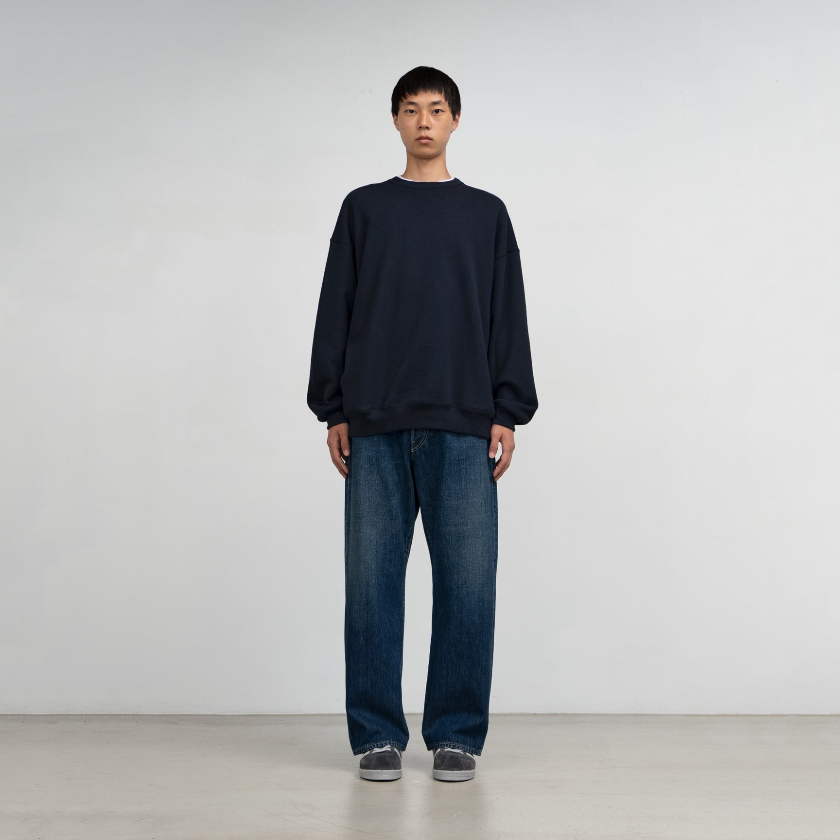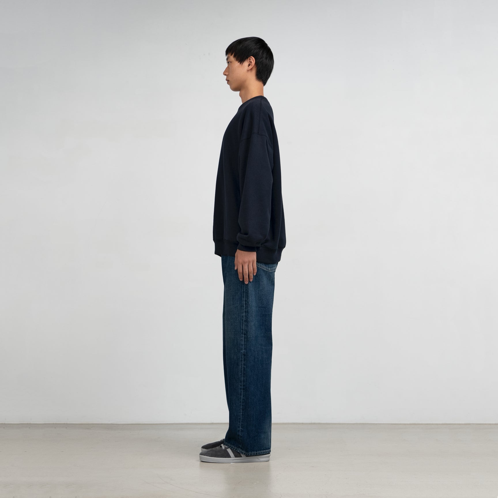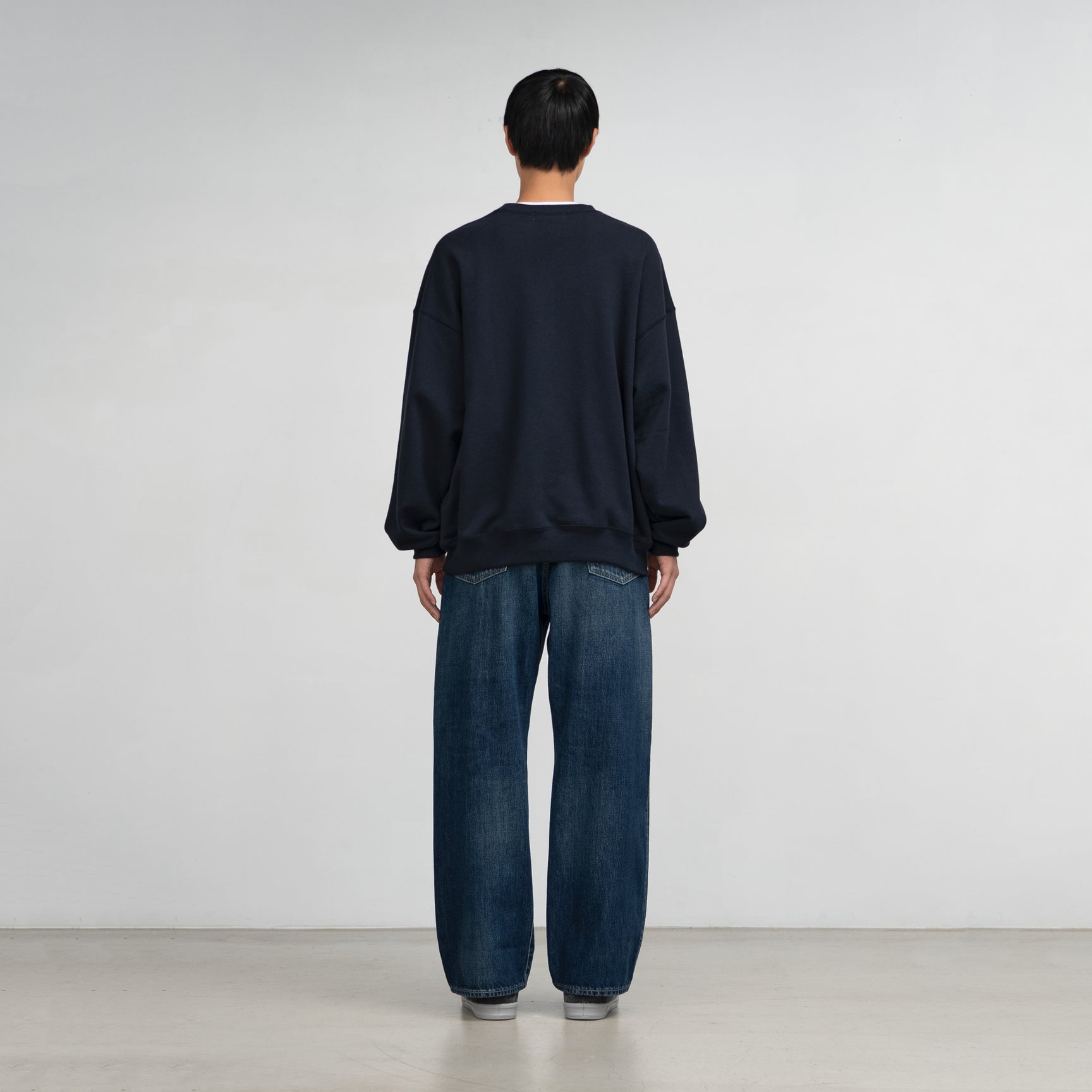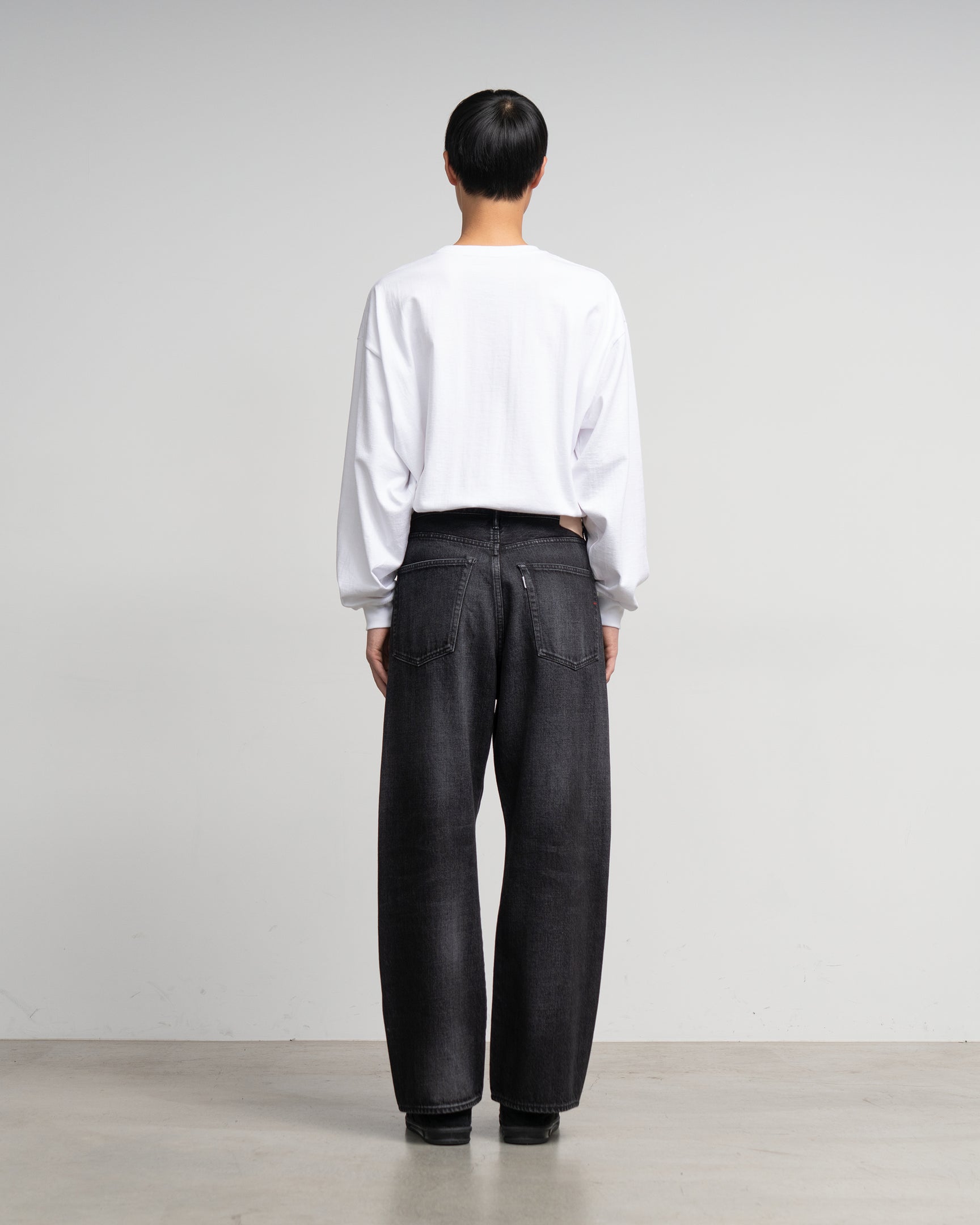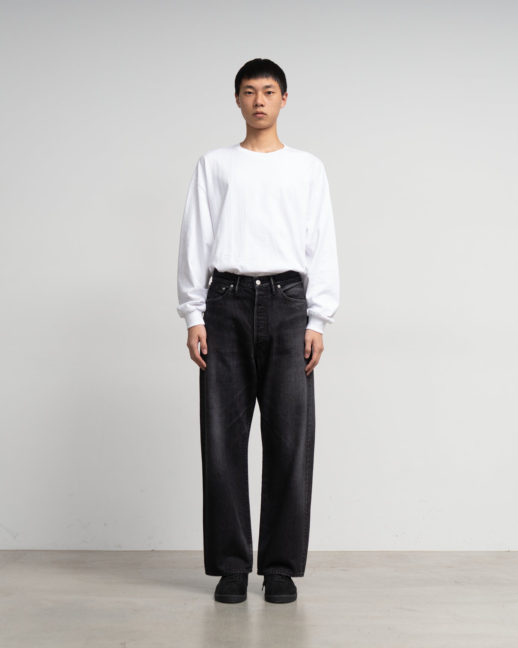 13.75 oz selvedge denim made by Cone Denim. a US company with 130 years of history. Black denim is now available this season. The warp threads are made from a blend of raw cotton that is best suited for denim fabric. spun with unique know-how. and dyed with dark pure indigo to create a vivid and natural vertical fading. The rough unevenness and irregularities on the surface of the fabric. which are created by slowly weaving it on an old-fashioned power loom. give this attractive material a sense of the original texture of denim. Relaxed fit five-pocket pants with a loose fit around the thighs and a gentle taper to the hem. The tuck buttons are engraved with the logo. and the waist is decorated with a clean tanned leather patch. The dark faded color features a sharp contrast of light and dark.