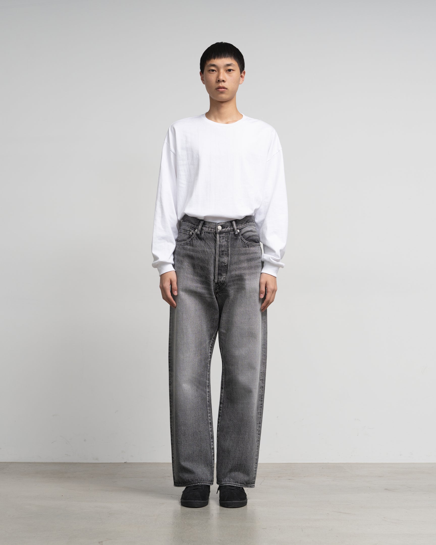 13.75 oz selvedge denim made by Cone Denim. a US company with 130 years of history. Black denim is now available this season. The warp threads are made from a blend of raw cotton that is best suited for denim fabric. spun with unique know-how. and dyed with dark pure indigo to create a vivid and natural vertical fading. The rough unevenness and unevenness on the surface of the fabric. created by slowly weaving it on an old-fashioned power loom. give this attractive material a sense of the original texture of denim. Relaxed fit five-pocket pants with a loose fit around the thighs and a gentle taper to the hem. The tuck buttons are engraved with the logo. and the waist is decorated with a clean tanned leather patch. The light fade color is characterized by a pale color that looks like it has been used for a long time.