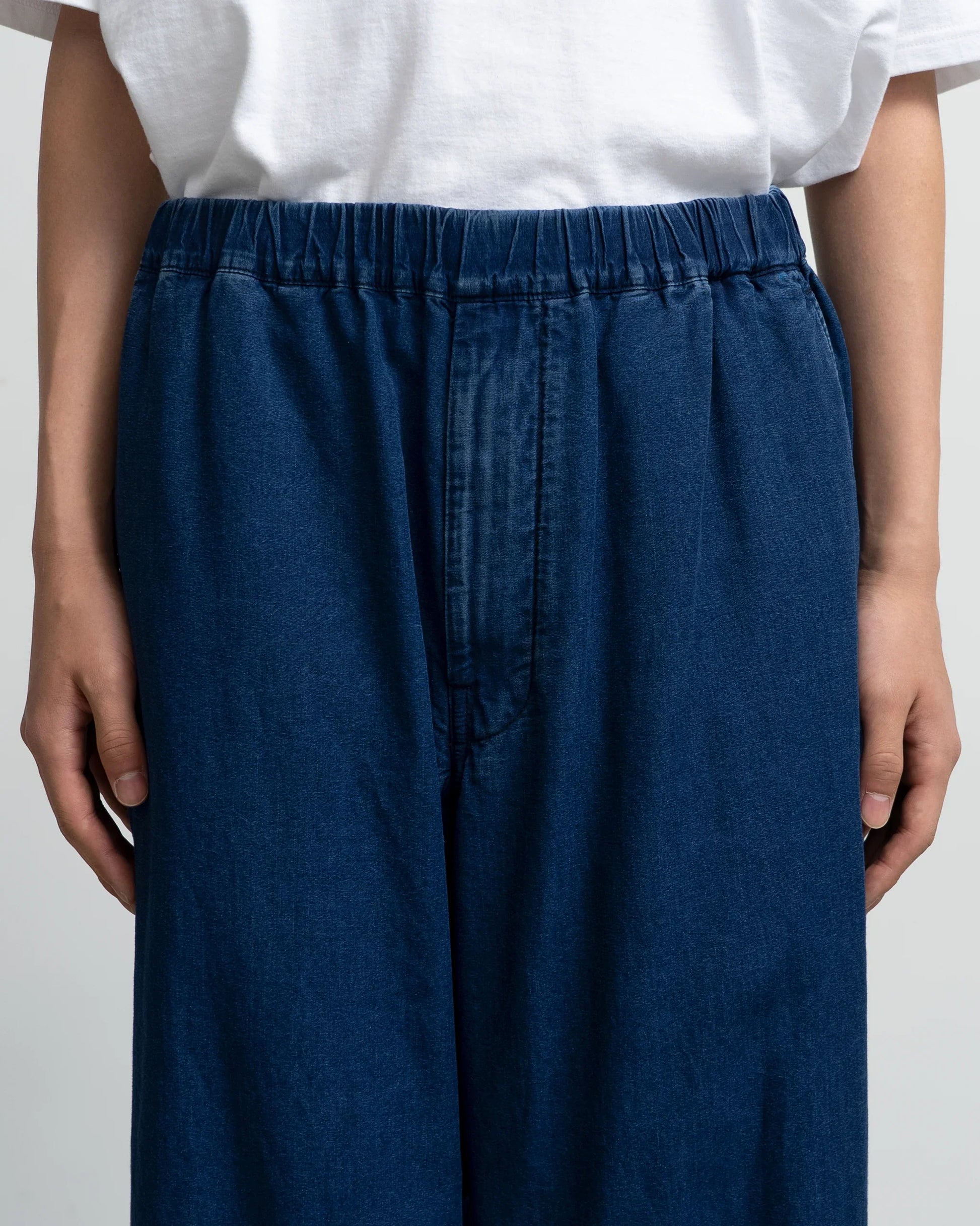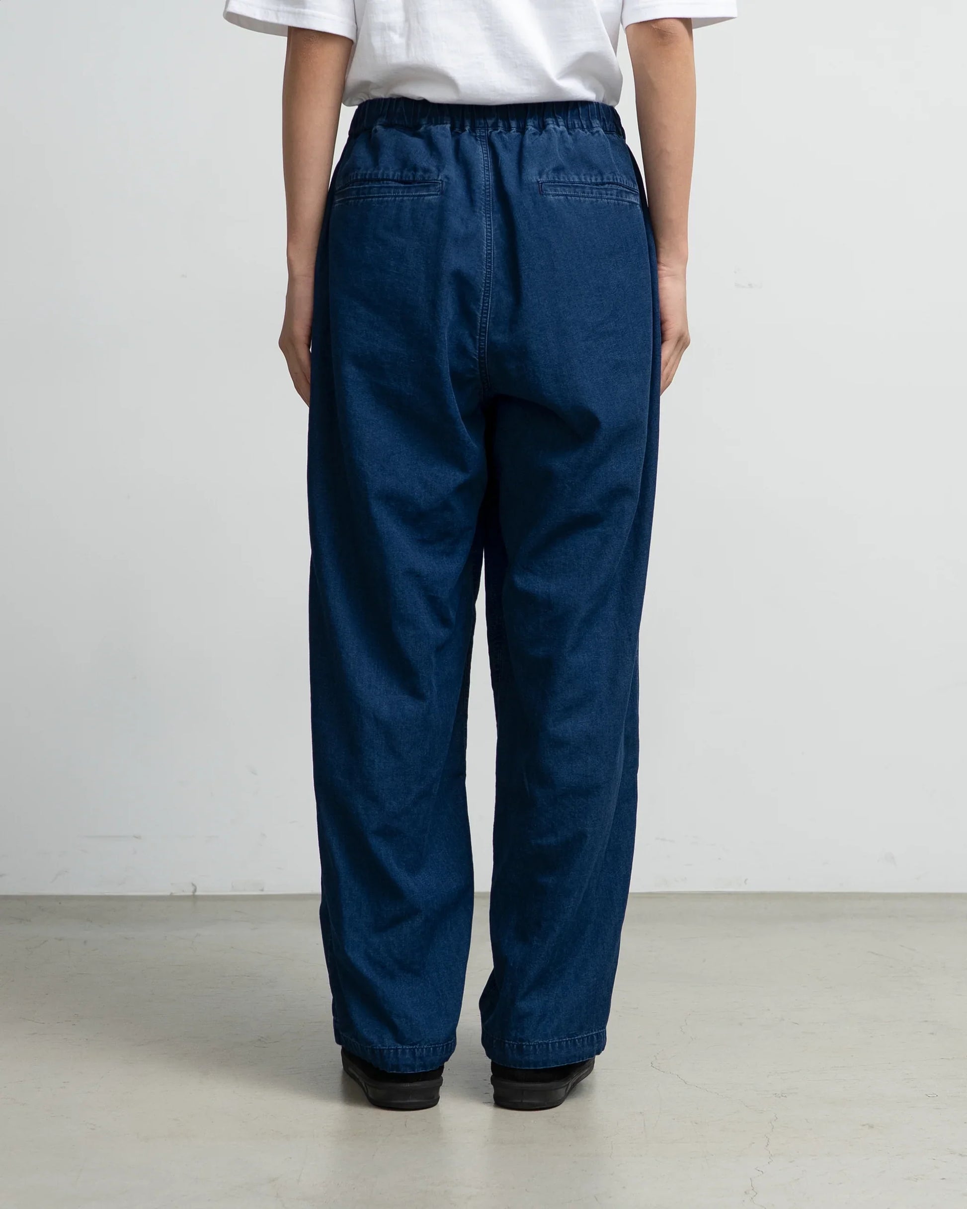These indigo-dyed cotton poplin are made with thick yarns woven at high density. resulting in a cool. refreshing feel on the fingertips thanks to the increased density of the warp threads. A post-wash finish gives them a denim-like faded look and a worn-in feel. These track pants feature a spindle at the hem that lets you change the silhouette.