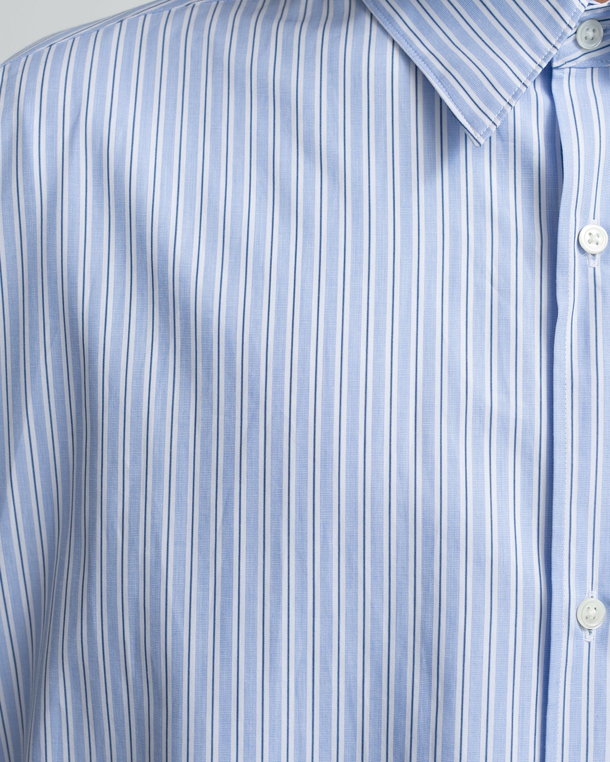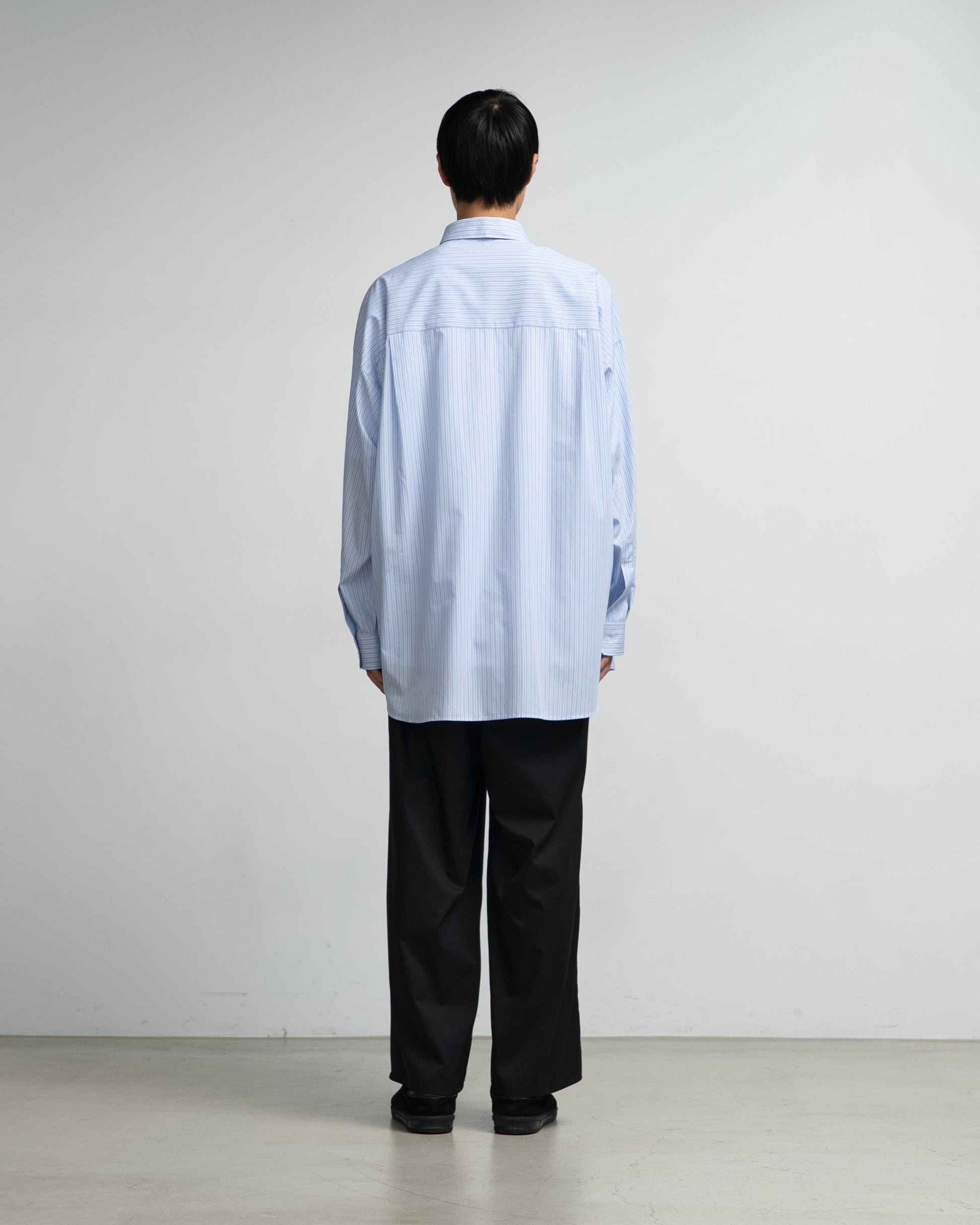 An oversized shirt made of broadcloth using fine. delicate cotton from SIDOGRAS. a company based in Barcelona. Spain. The vibrant dyeing. the sheen of the material itself. the moderate firmness. and the soft feel are also attractive. It has a voluminous box silhouette with dropped shoulders and an authentic regular collar. The big silhouette is finished with a unique balance of small details such as the slope of the shoulders. the low yoke position. and the wide armholes.