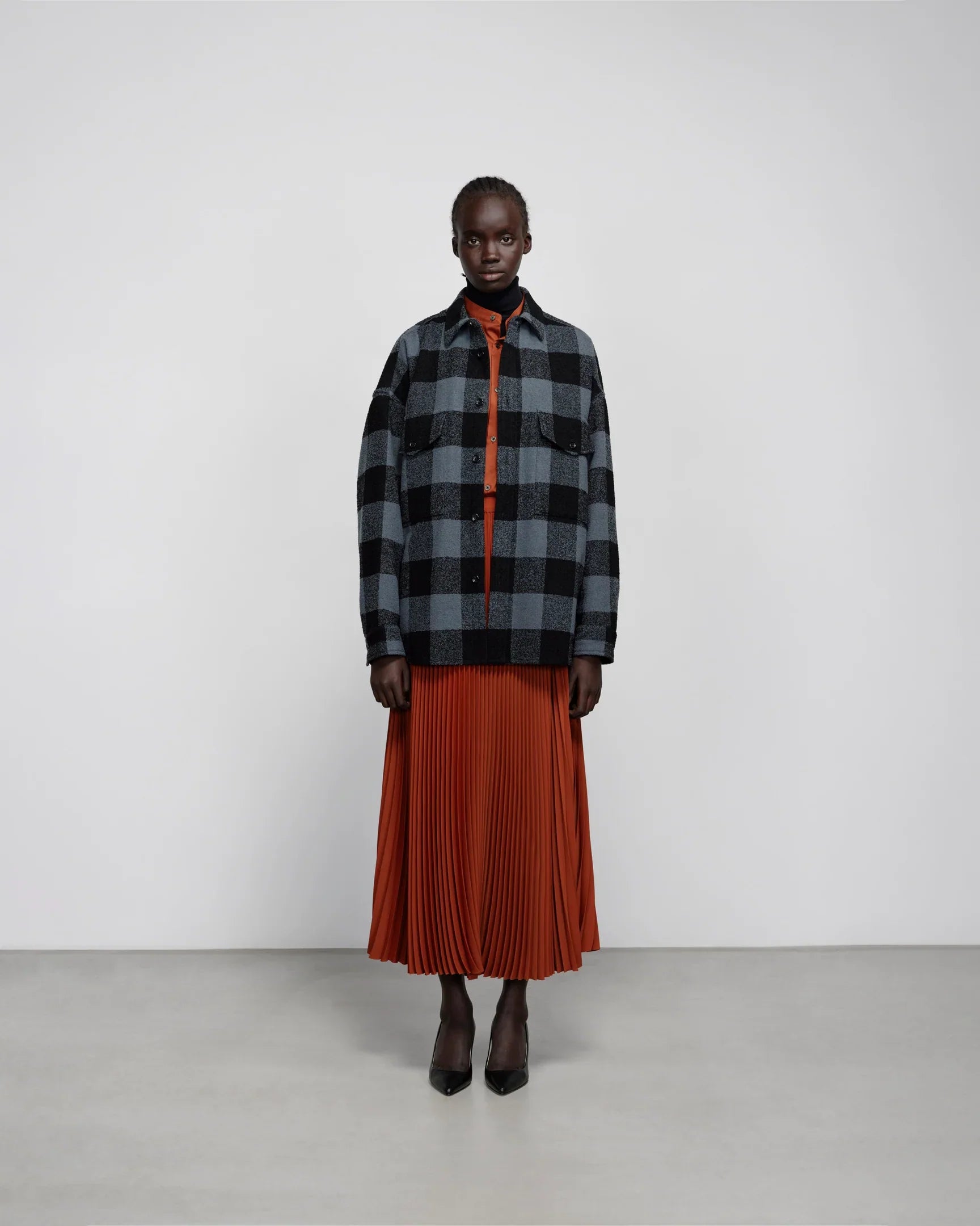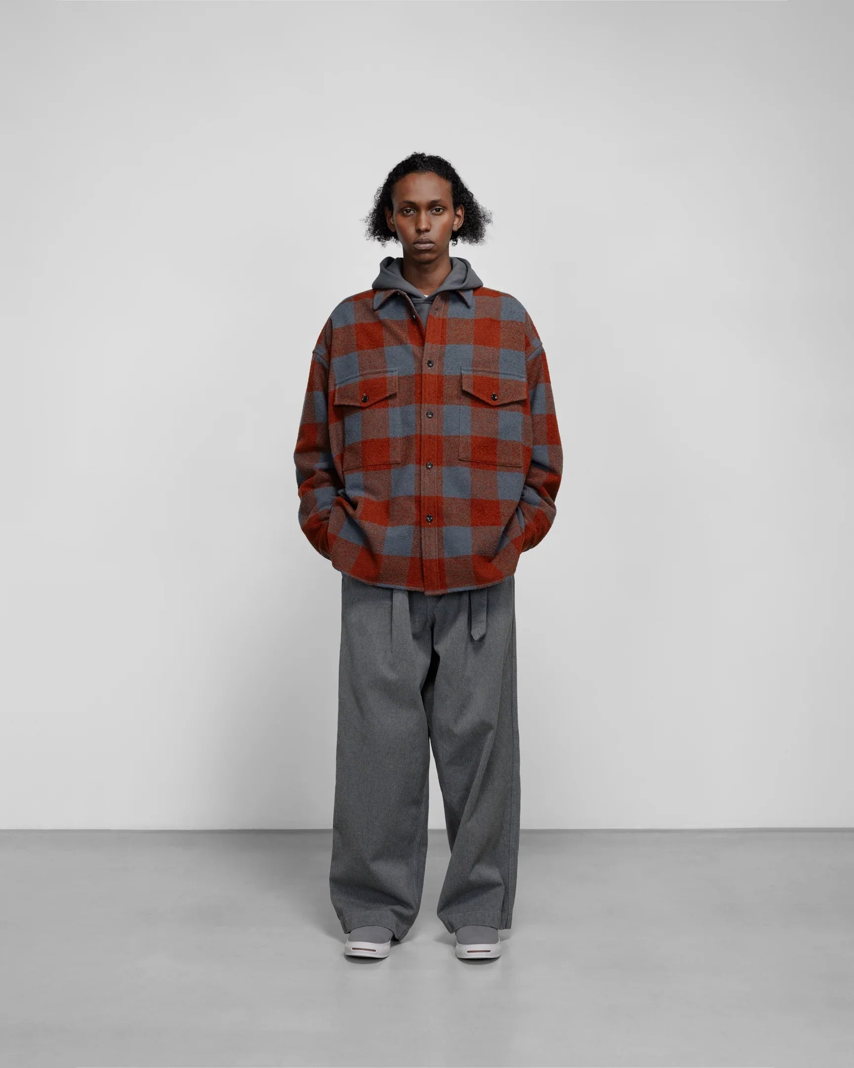 The material features the softness and volume of the raw material. achieved by using untwisted wool yarn as loops. The warm texture gives it a soft feel. and the warp and weft threads are alternately made of loop yarn and cotton yarn. giving it just the right amount of firmness. The CPO shirt design features a double pocket on the chest. with roots in the US Navy. Checks are also available in this season's color palette.