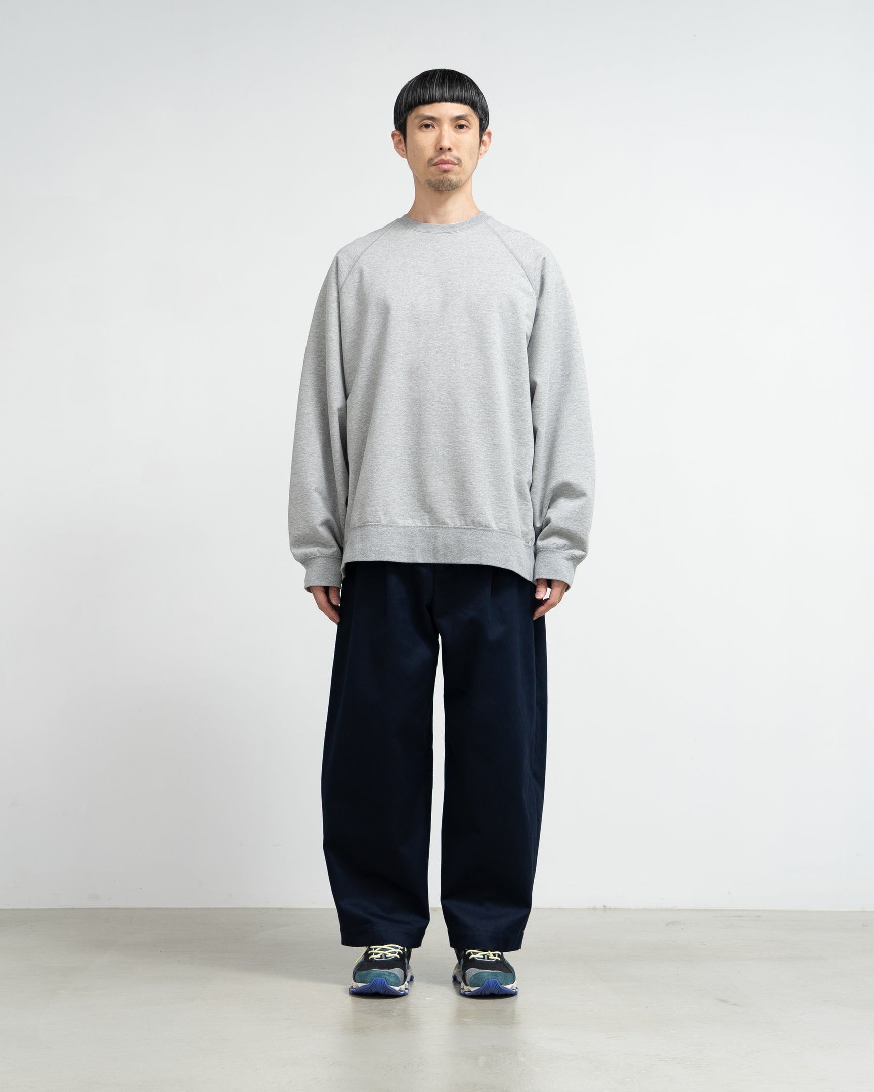 Compact terry with a tightly woven. flat look. This season. the gauge has been increased to the maximum to maintain the original firmness while pursuing a more beautiful texture and loop feel. In order to take advantage of the material and knitting machine. no post-processing is done and the garment is left natural. The oversized body width and arms combine with the firmness of the fabric to create a fuller silhouette. Flat seam stitching creates a flat finish.