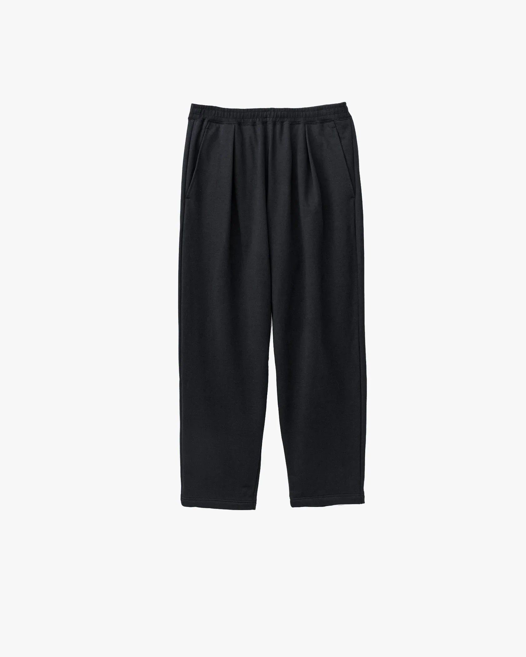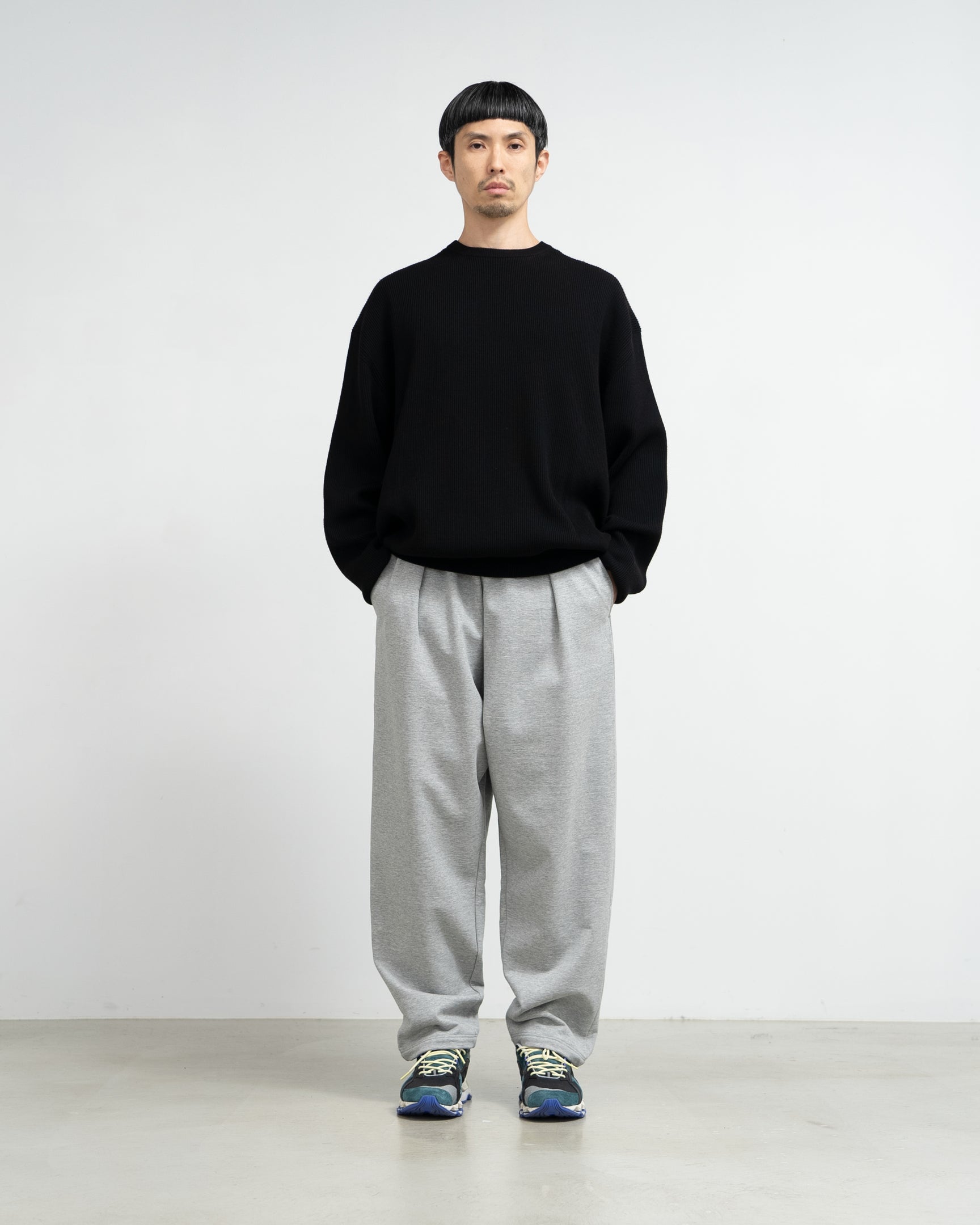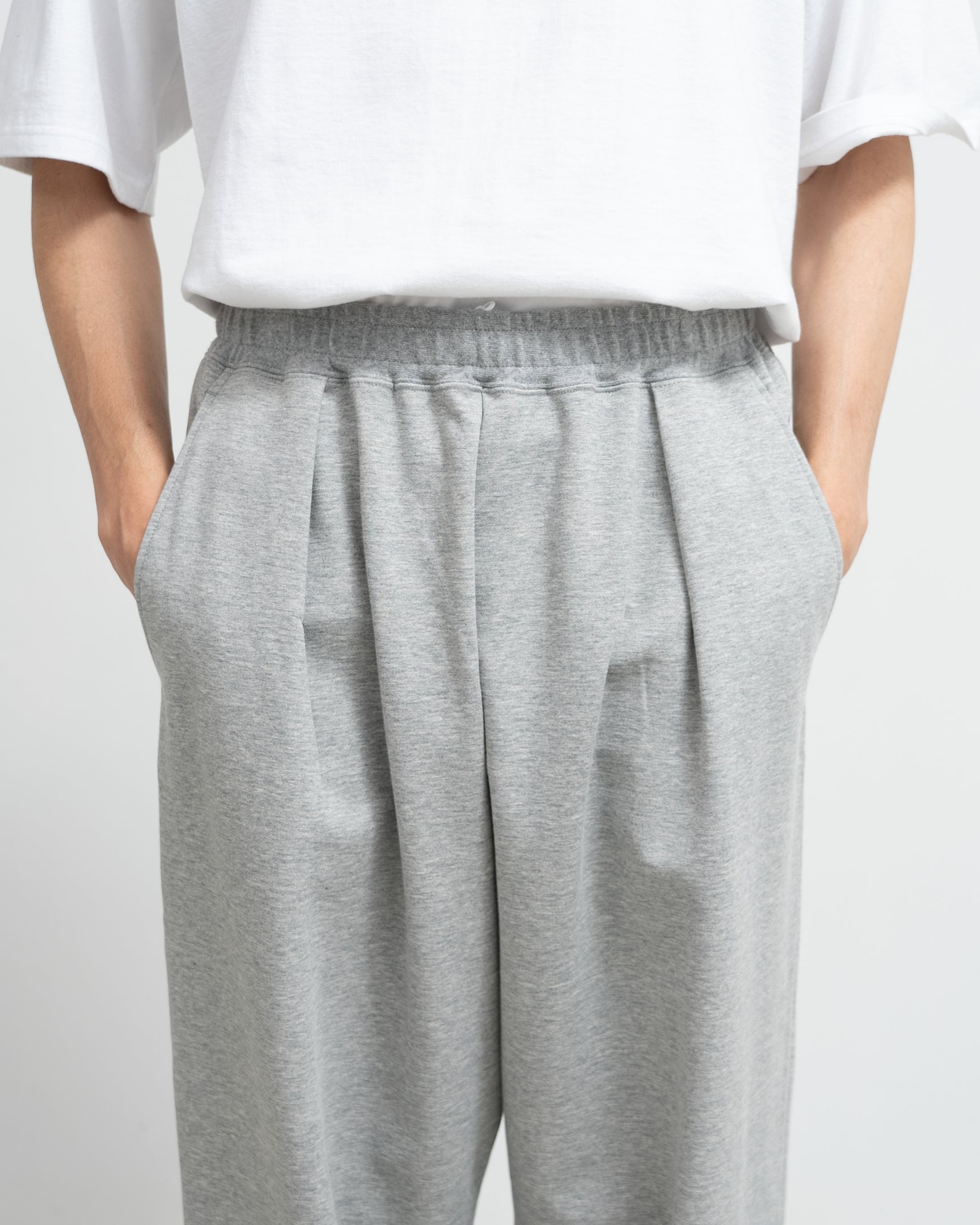 Compact terry features a tightly woven. flat look. This season. the gauge has been increased to the maximum. while maintaining the original firmness. in pursuit of a more beautiful texture and loop feel. In order to take advantage of the material and knitting machine. no post-processing is done. leaving it in a natural finish. The sweatpants have a loose elastic waist and drawstring. but have tucks in the front. adopting the patterning of gently tapered slacks. The beautiful heathered look gives it an elegant finish.