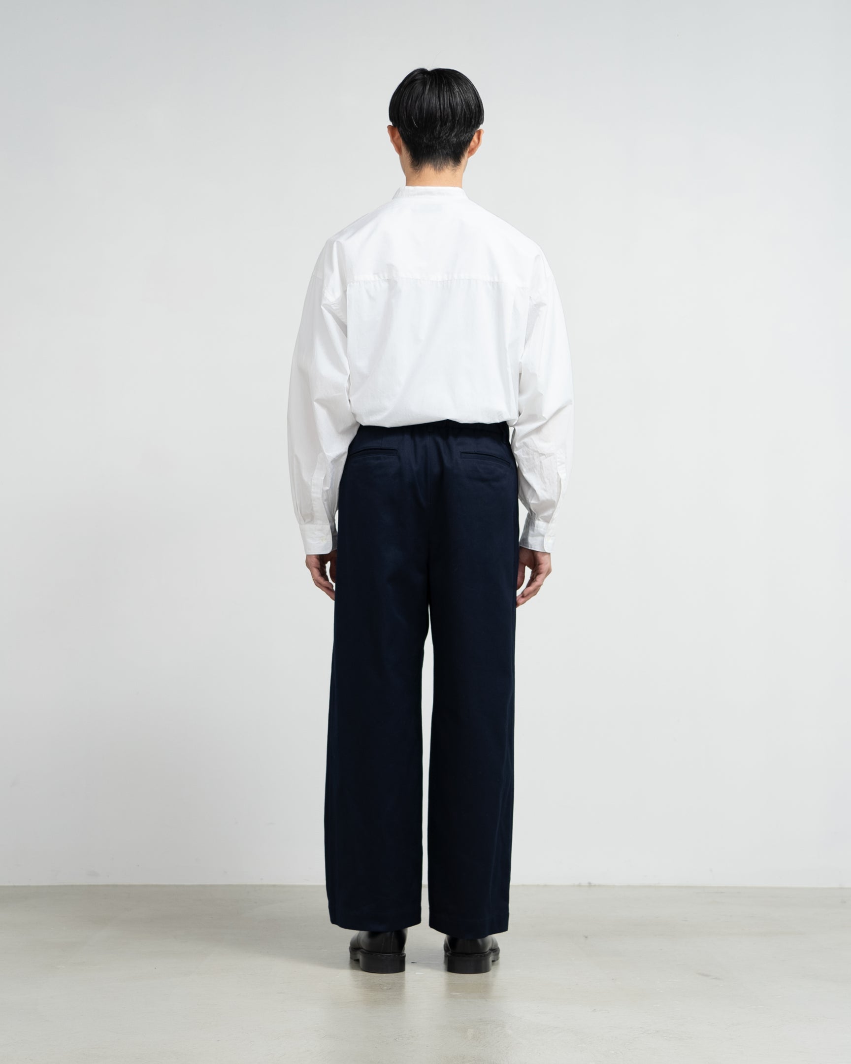 The raw material is a blend of cotton with uniform fiber length from the United States and Australia. woven into West Point fabric. The material features a soft luster. moderate thickness. and an elegant appearance. Chino trousers with a loose. straight silhouette.