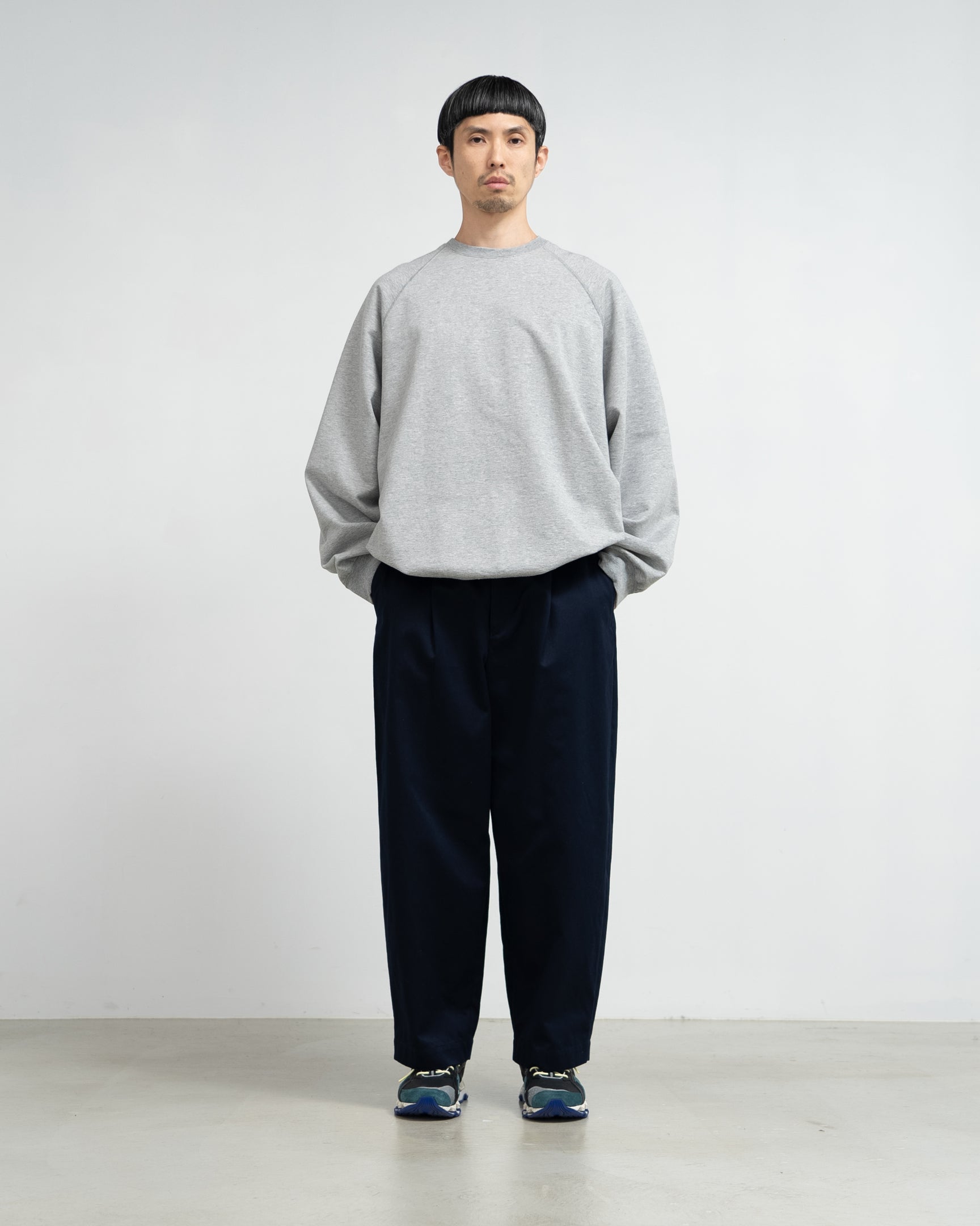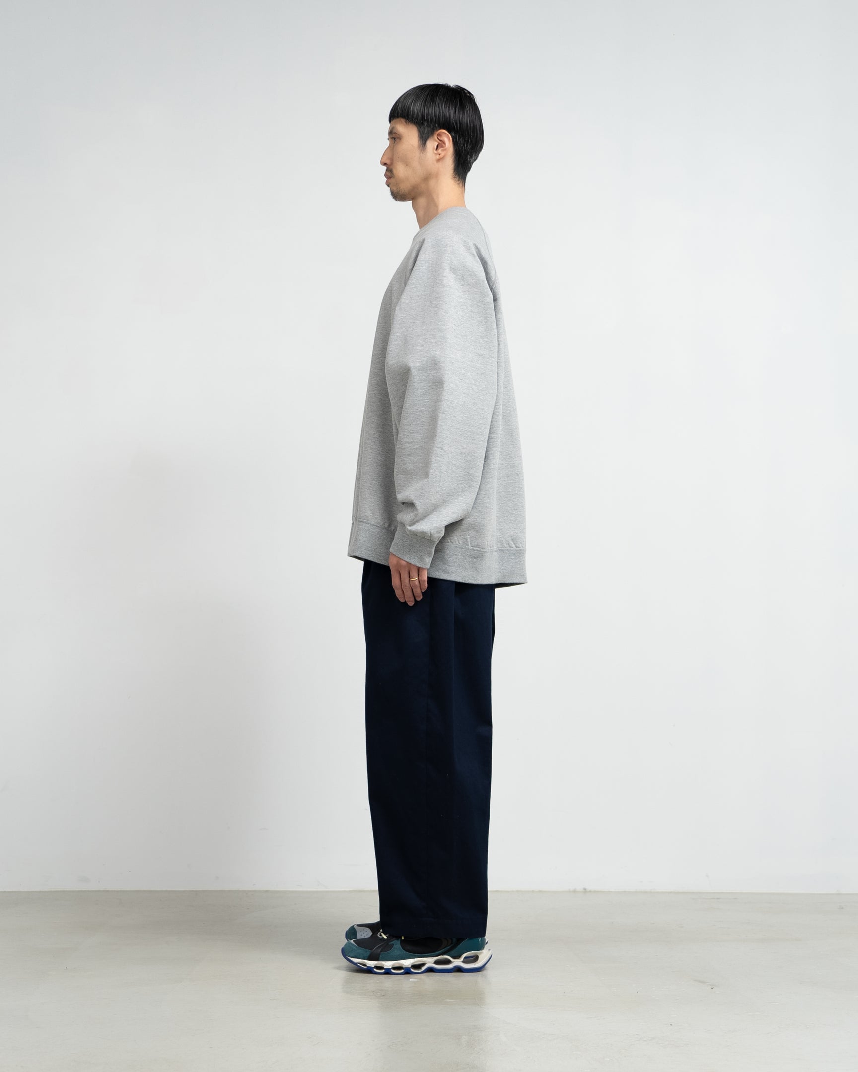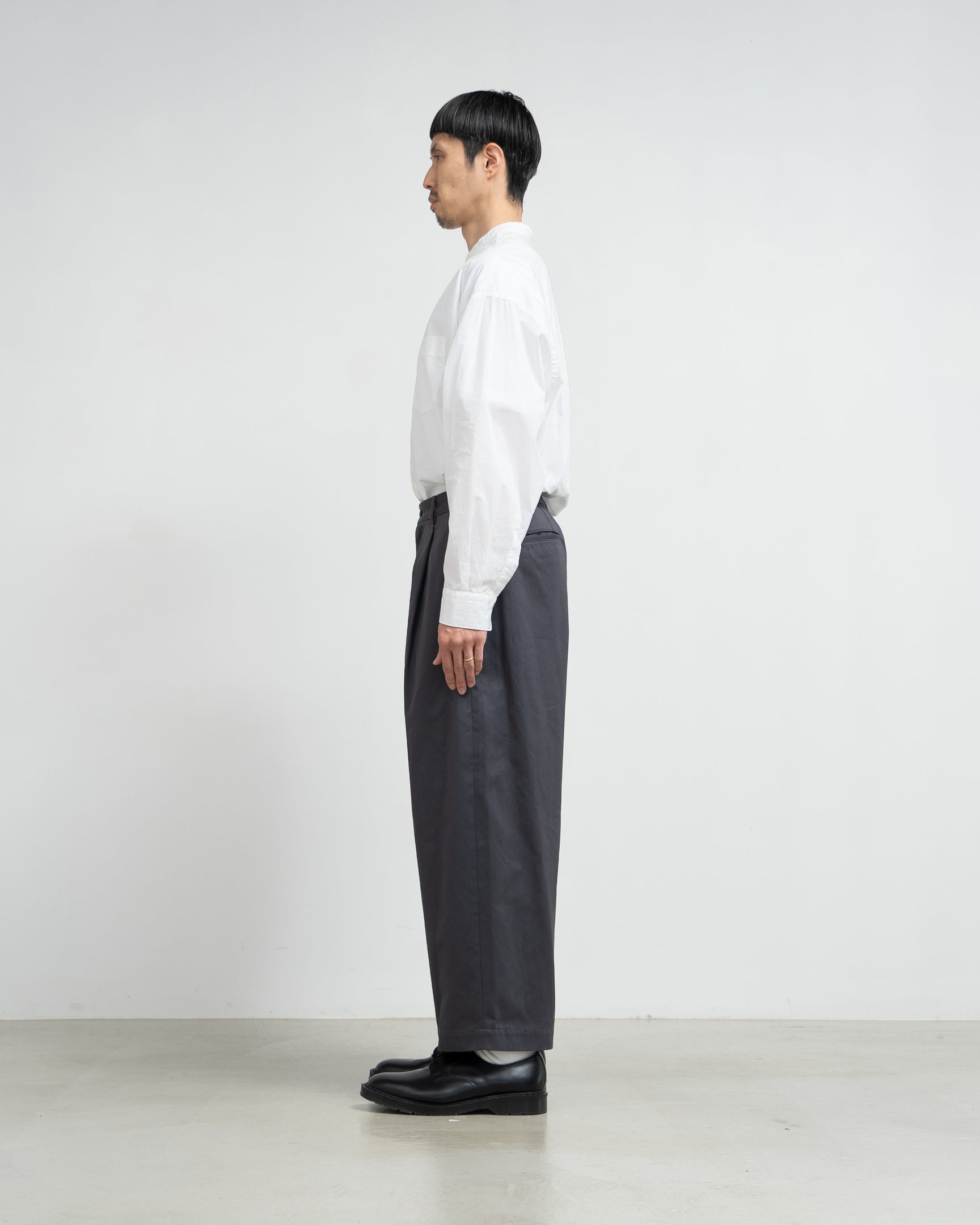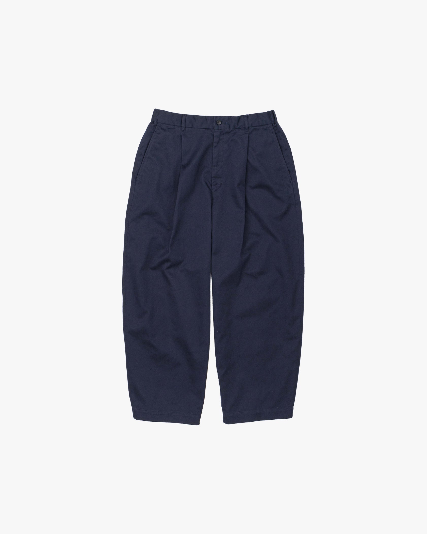 The raw material is a blend of cotton with uniform fiber length from the United States and Australia. woven into West Point fabric. The material features a soft luster. moderate thickness. and an elegant look. Chino trousers with a loose tapered silhouette.