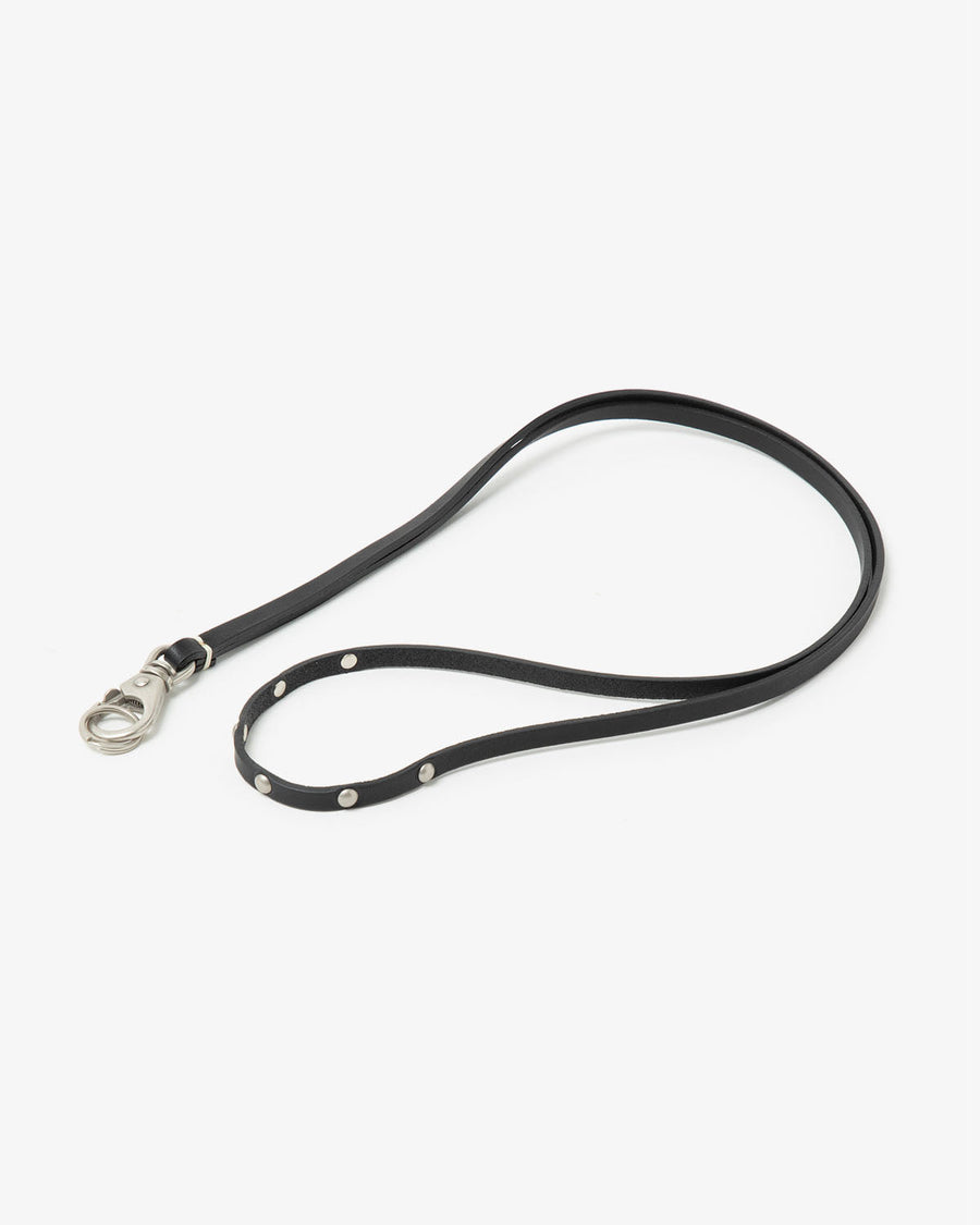This long leather strap key ring is made of thick. tanned leather and features studs.