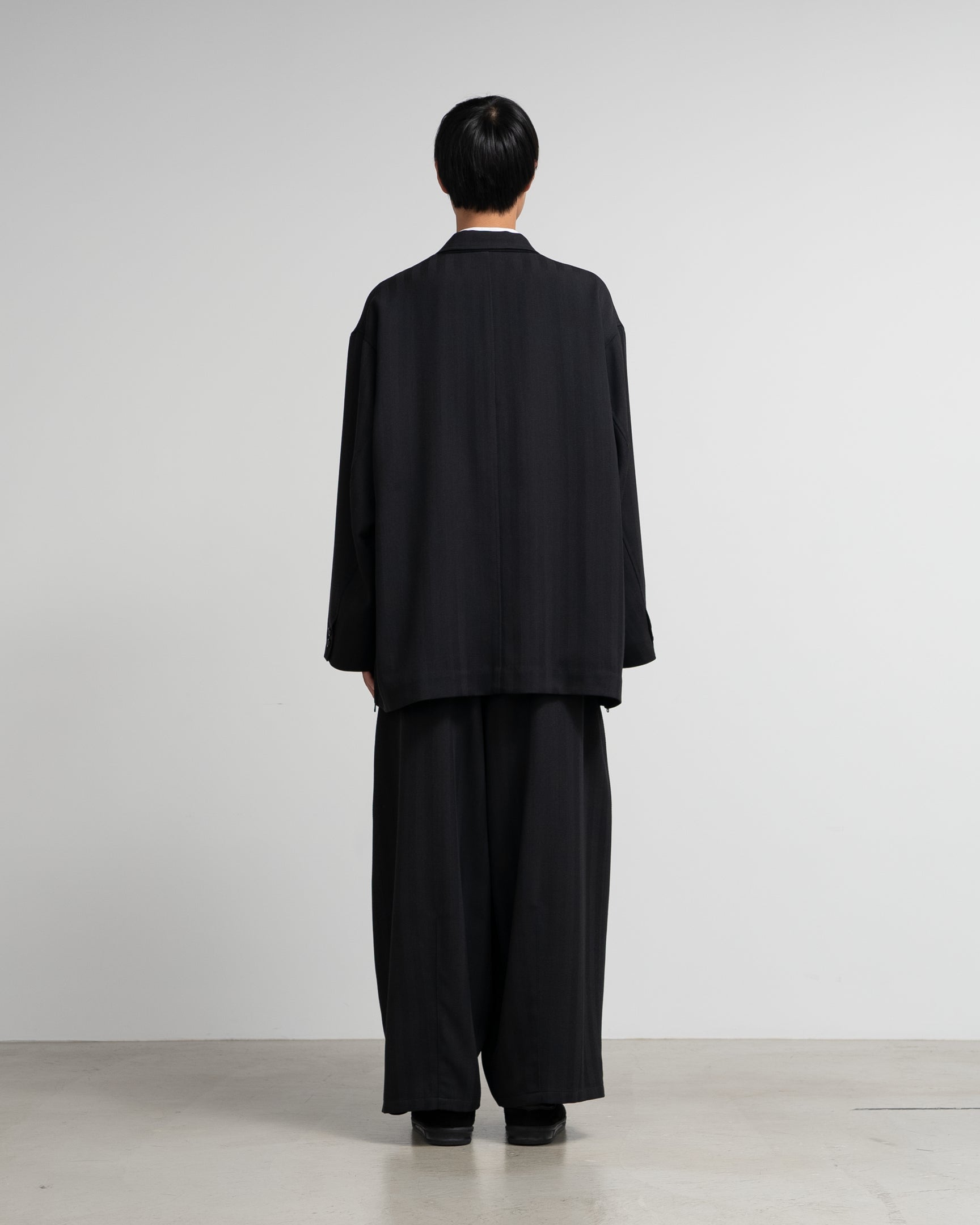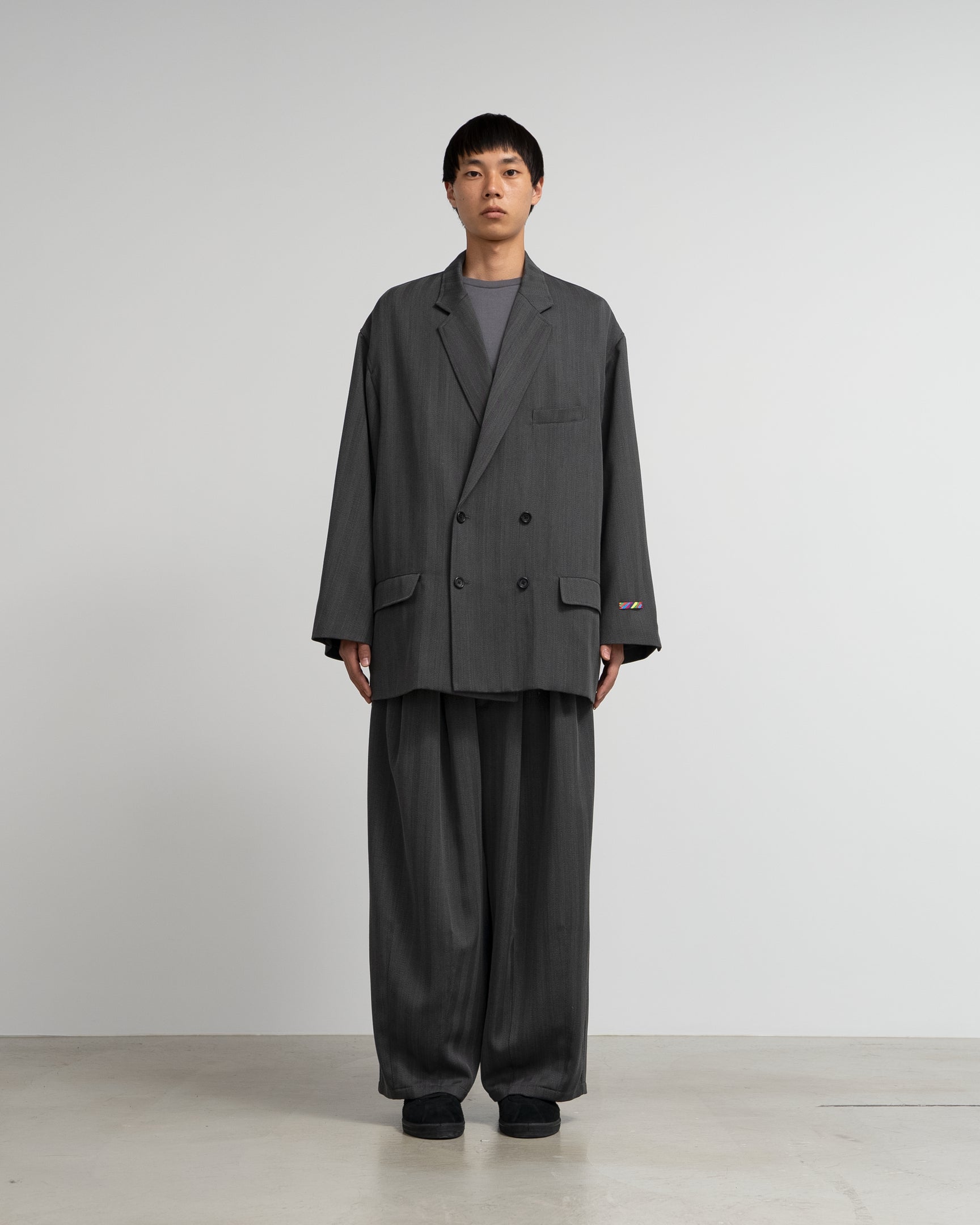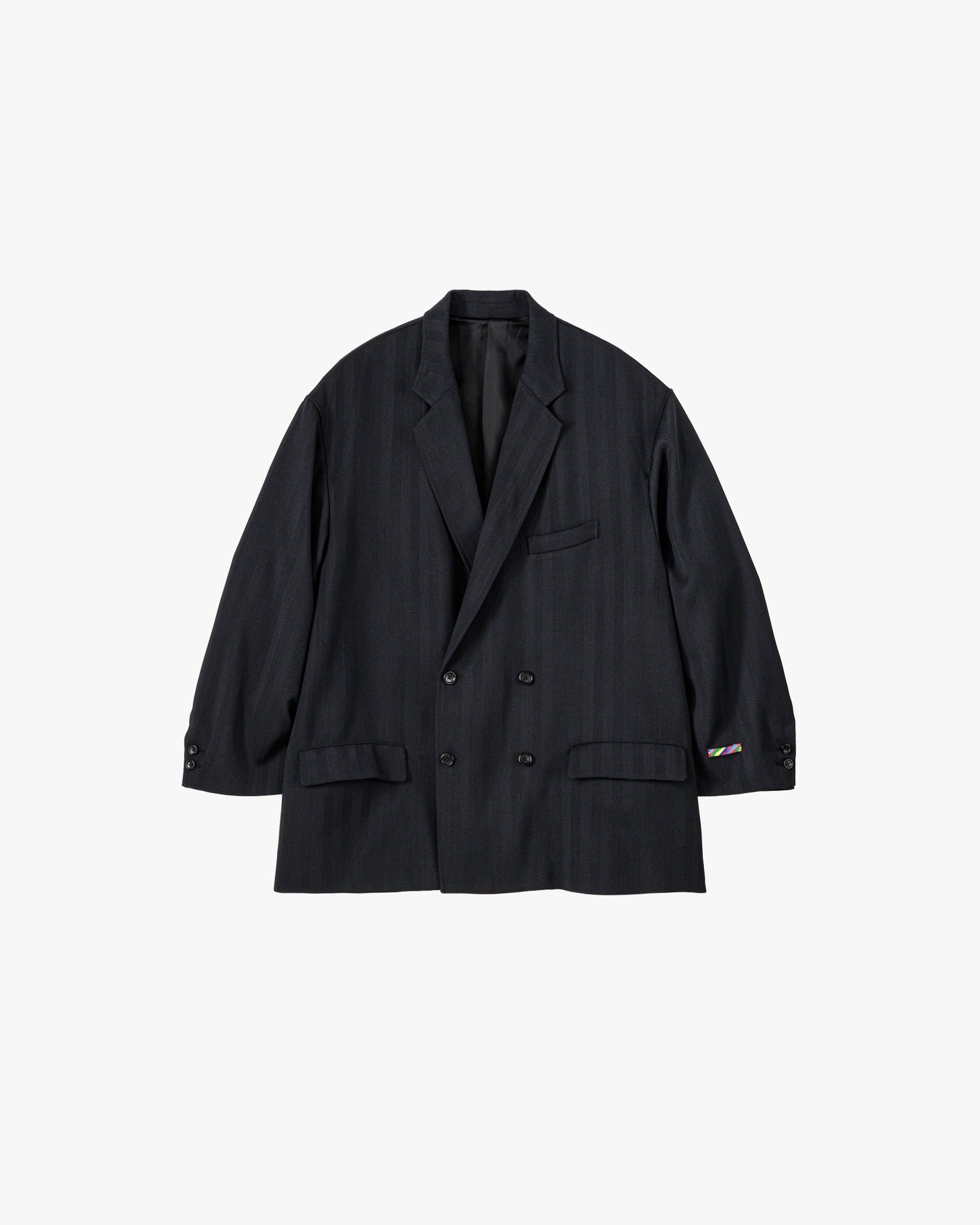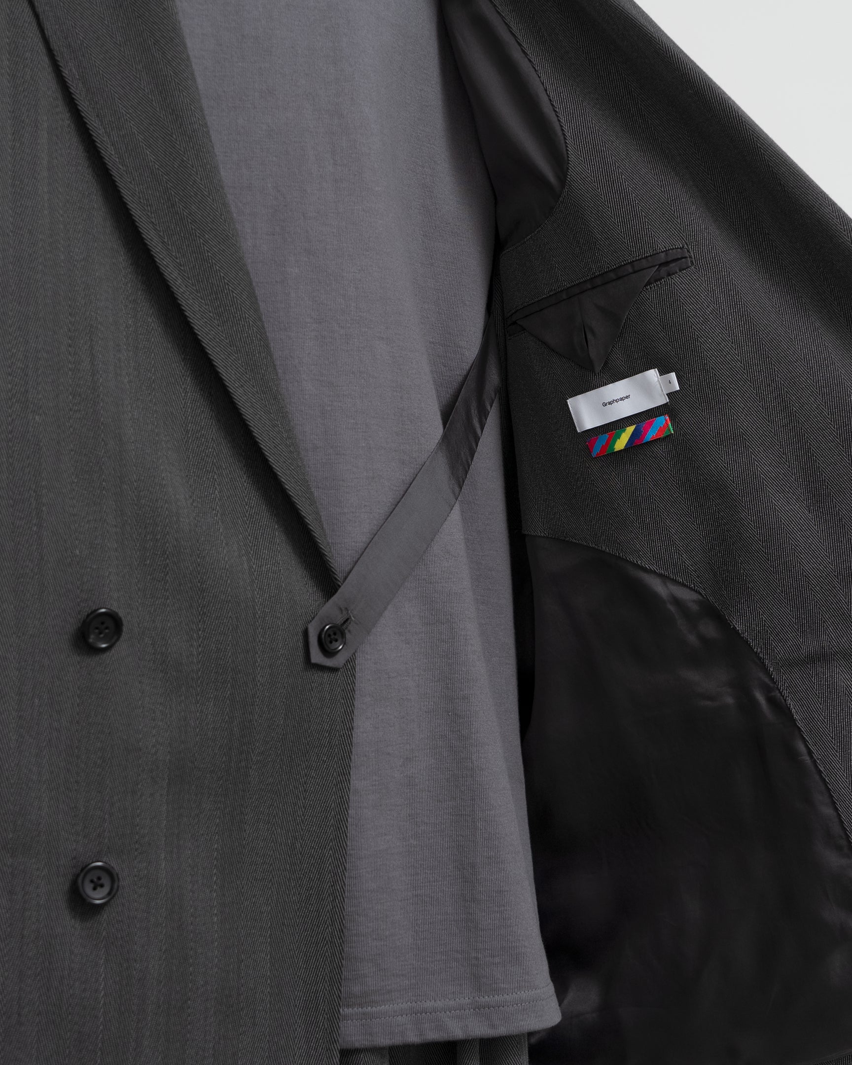 A special collaboration between Graphpaper and is-ness. where items from both brands are edited from a new perspective. Textured melange wool herringbone with an 80s vibe. To express the three-dimensional effect seen in the archive jacquard. fluffy wool yarn and polyester are twisted together to create a crisp twill texture that feels good to the fingers. Based on Graphpaper's double-breasted jacket. the design features ventilation zippers on the sides. a detail that is symbolic of is-ness. The jacket is finished without the shoulder pads. core. and other materials that create the shape. and the unique drape created by the smooth polyester blend gives it a relaxed appearance and elegance reminiscent of the unconstructed jackets that were all the rage in the 80s.