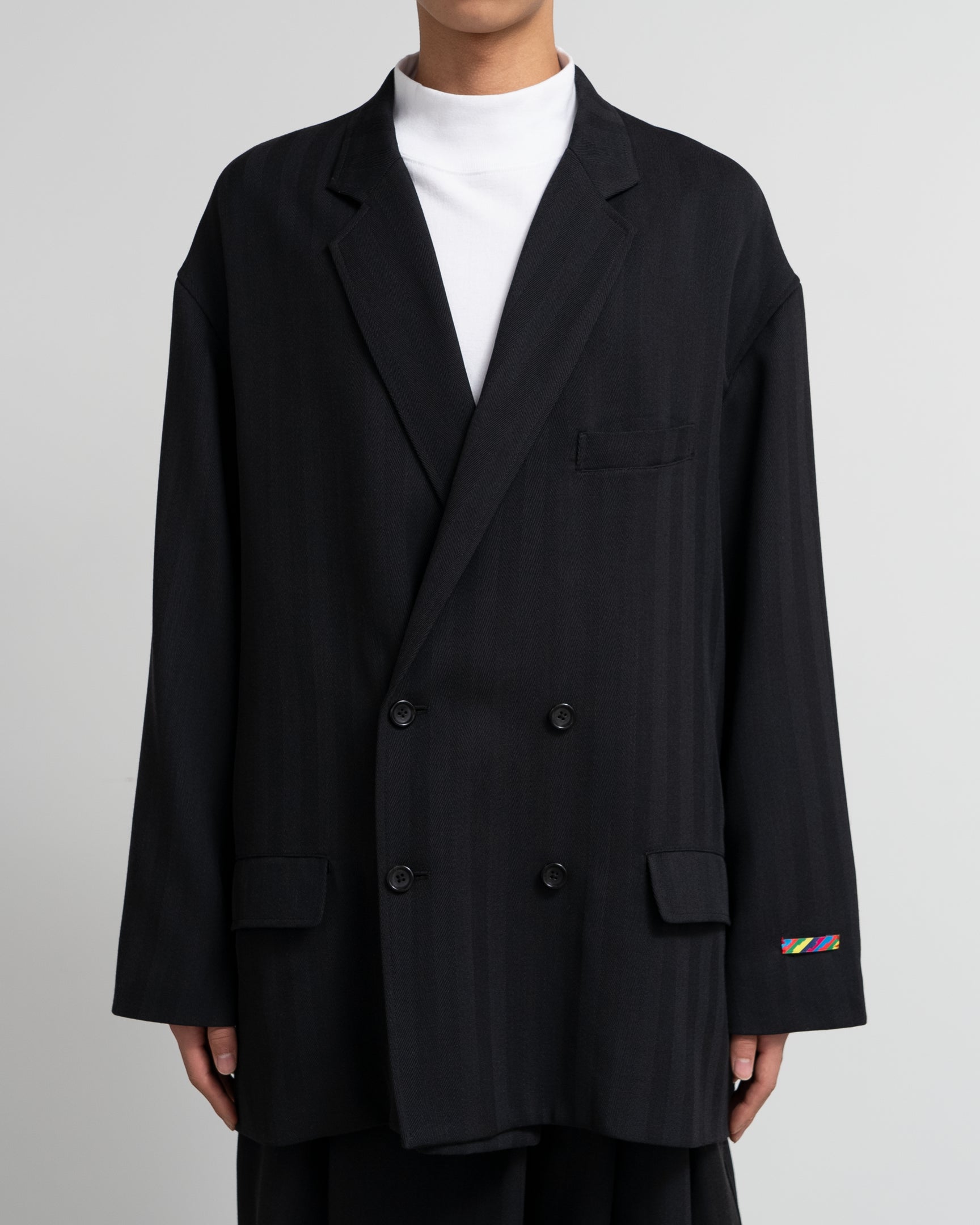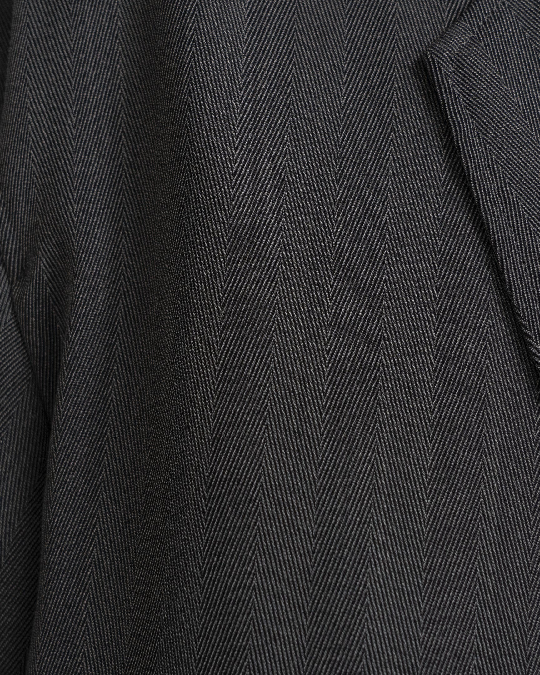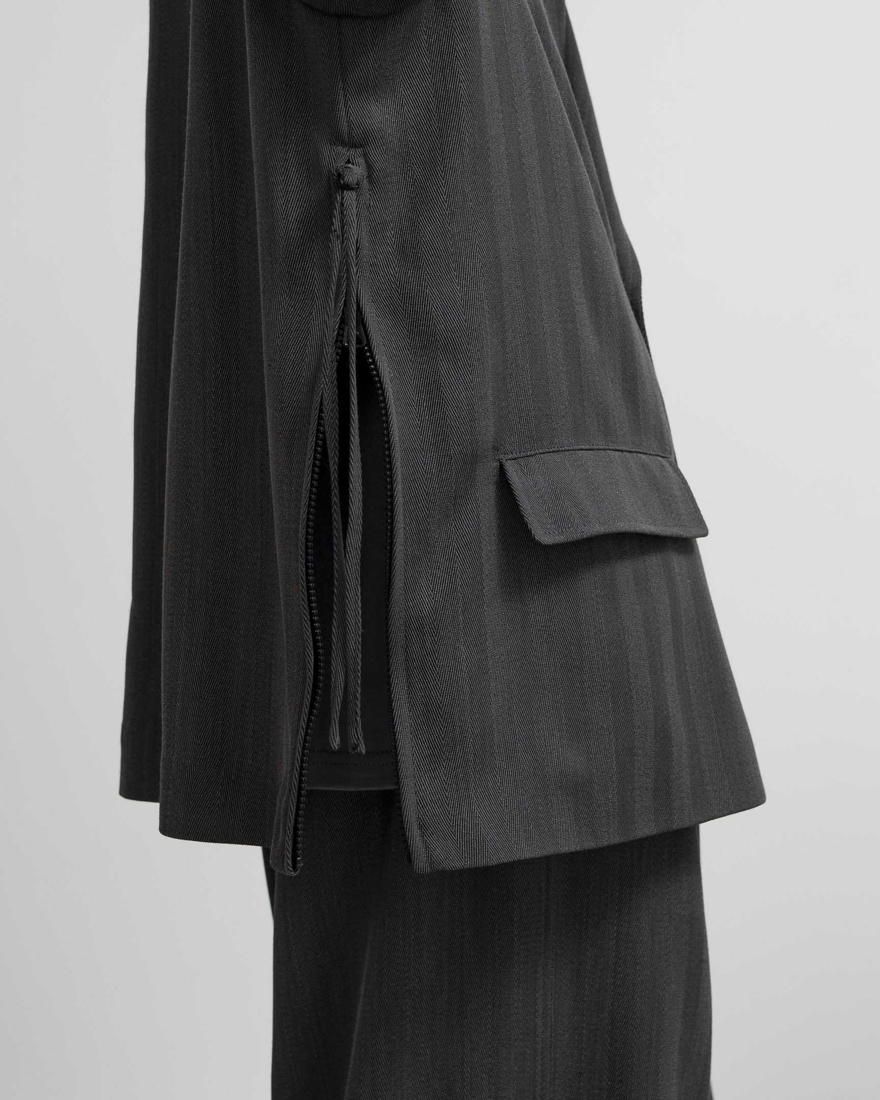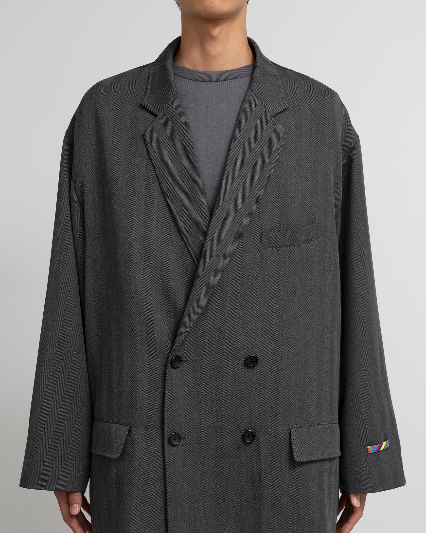 A special collaboration between Graphpaper and is-ness. where items from both brands are edited from a new perspective. Textured melange wool herringbone with an 80s vibe. To express the three-dimensional effect seen in the archive jacquard. fluffy wool yarn and polyester are twisted together to create a crisp twill texture that feels good to the fingers. Based on Graphpaper's double-breasted jacket. the design features ventilation zippers on the sides. a detail that is symbolic of is-ness. The jacket is finished without the shoulder pads. core. and other materials that create the shape. and the unique drape created by the smooth polyester blend gives it a relaxed appearance and elegance reminiscent of the unconstructed jackets that were all the rage in the 80s.