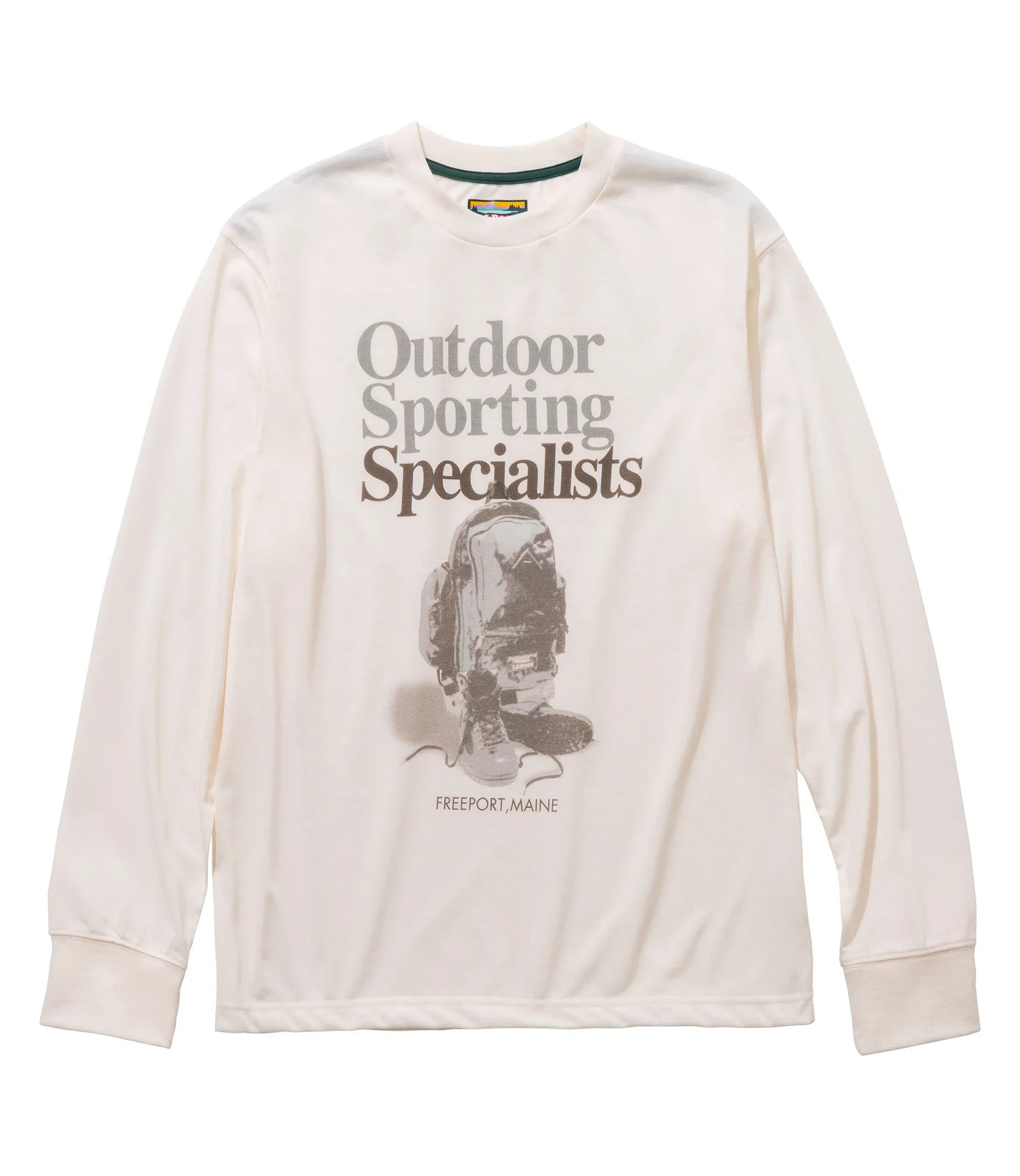 This JAPAN EDITION collection was developed by a Japanese design team to suit the climate and trends of Japan. This long-sleeved T-shirt features a graphic of our archived Mount Katahdin Pack and Cresta Hiker on the front. along with bold logo prints of Outdoor Sporting Specialists and FREEPORT. MAINE. The fabric is made of functional jersey. with a hexagonal cross-section for moisture absorption. quick-drying properties. and colorfastness. It is 100% polyester but has a matte texture like cotton. resulting in a piece that combines comfort and style.