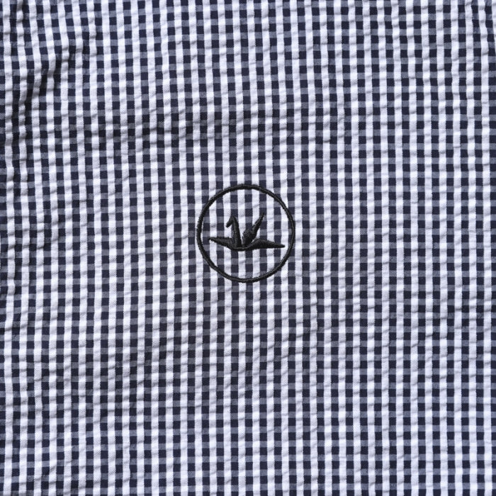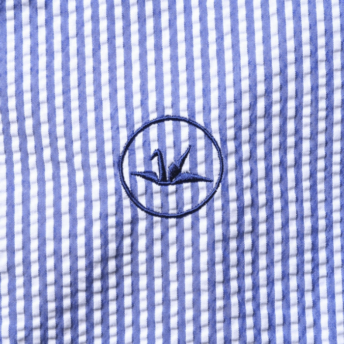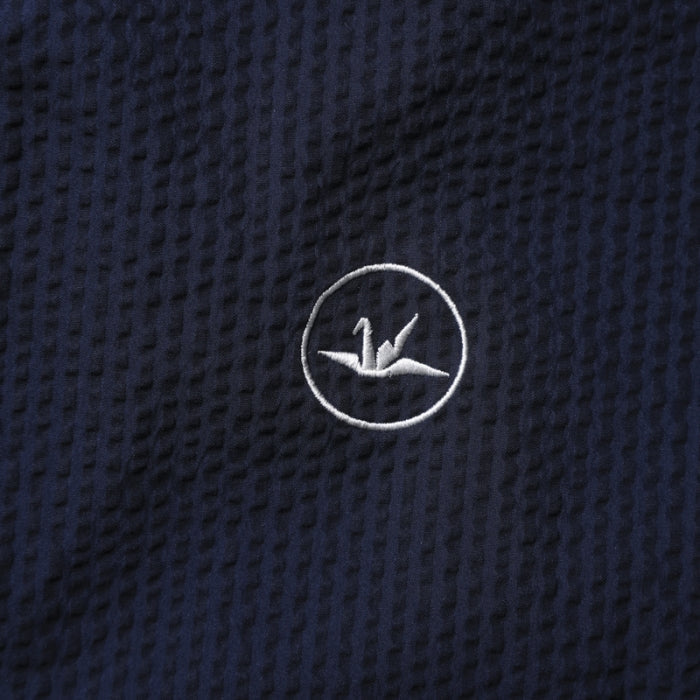 It has an origami crane logo on the left chest and a triangular label on the back.