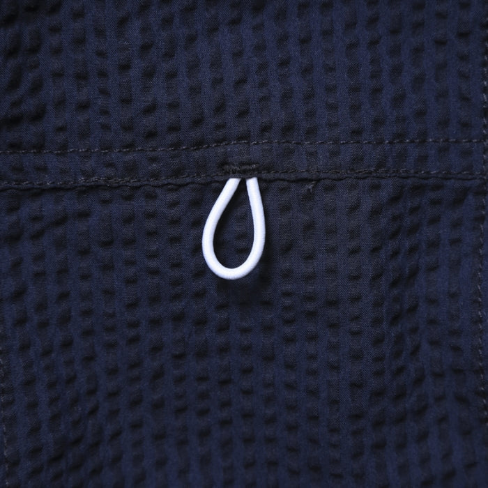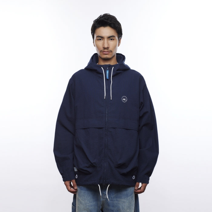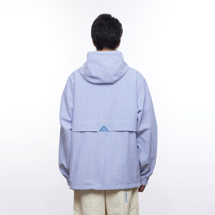 A mountain parka made from COOLMAX® striped fabric. It has a utility specification with a large capacity pocket on the front.