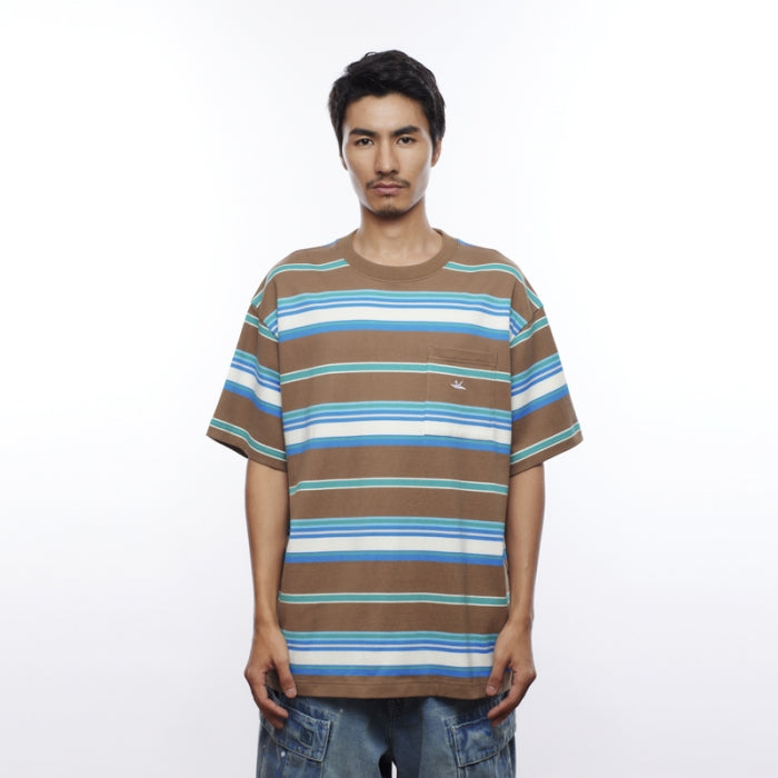 A pocket T-shirt made with striped jersey fabric in a color scheme that is reminiscent of the 90s.