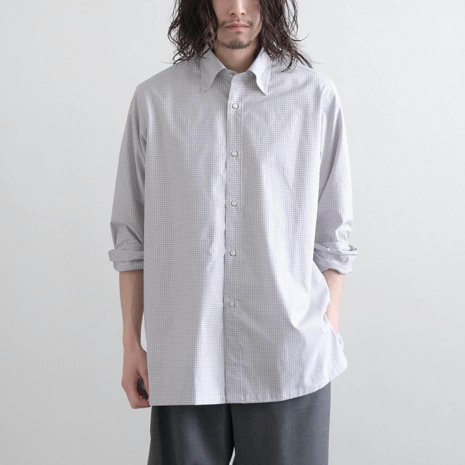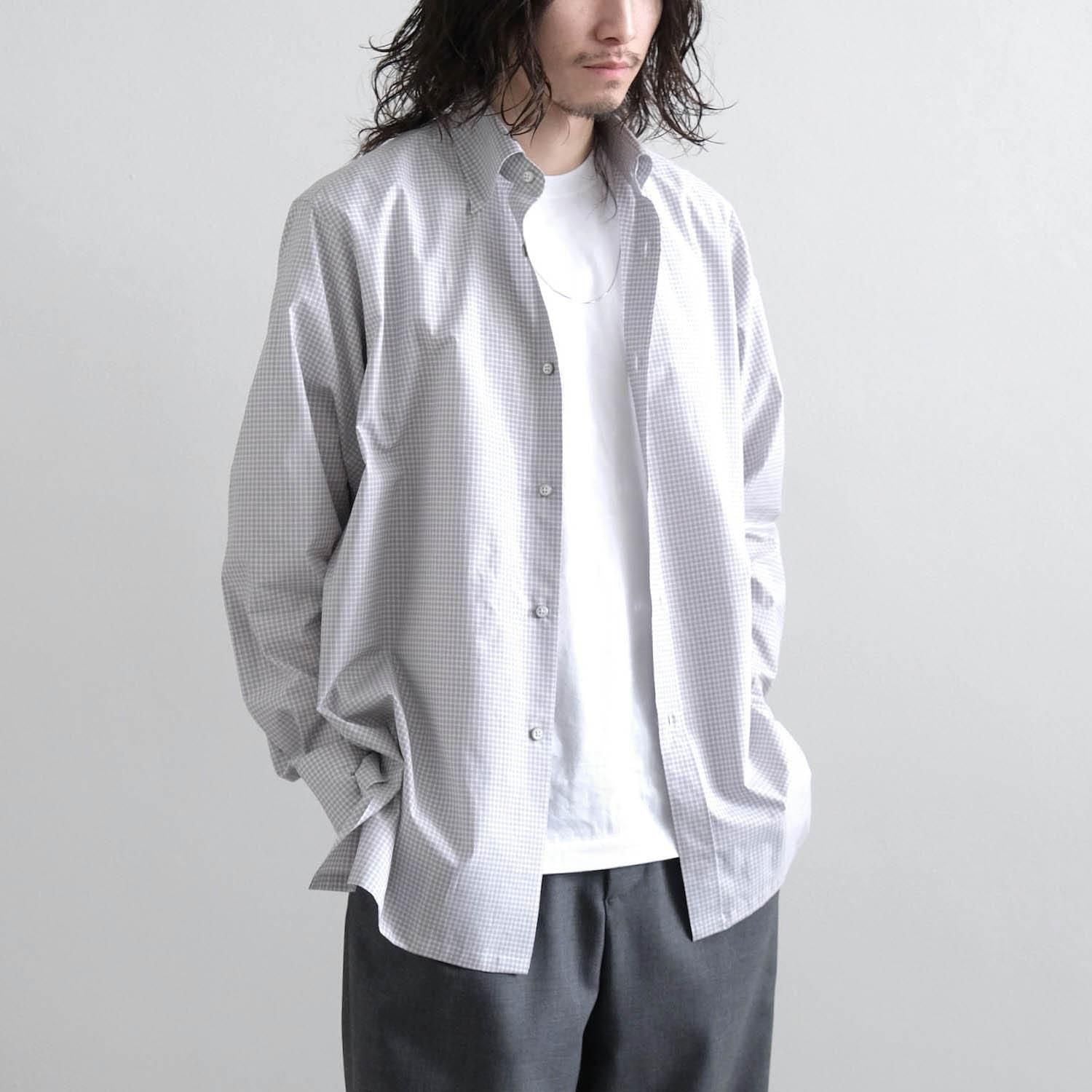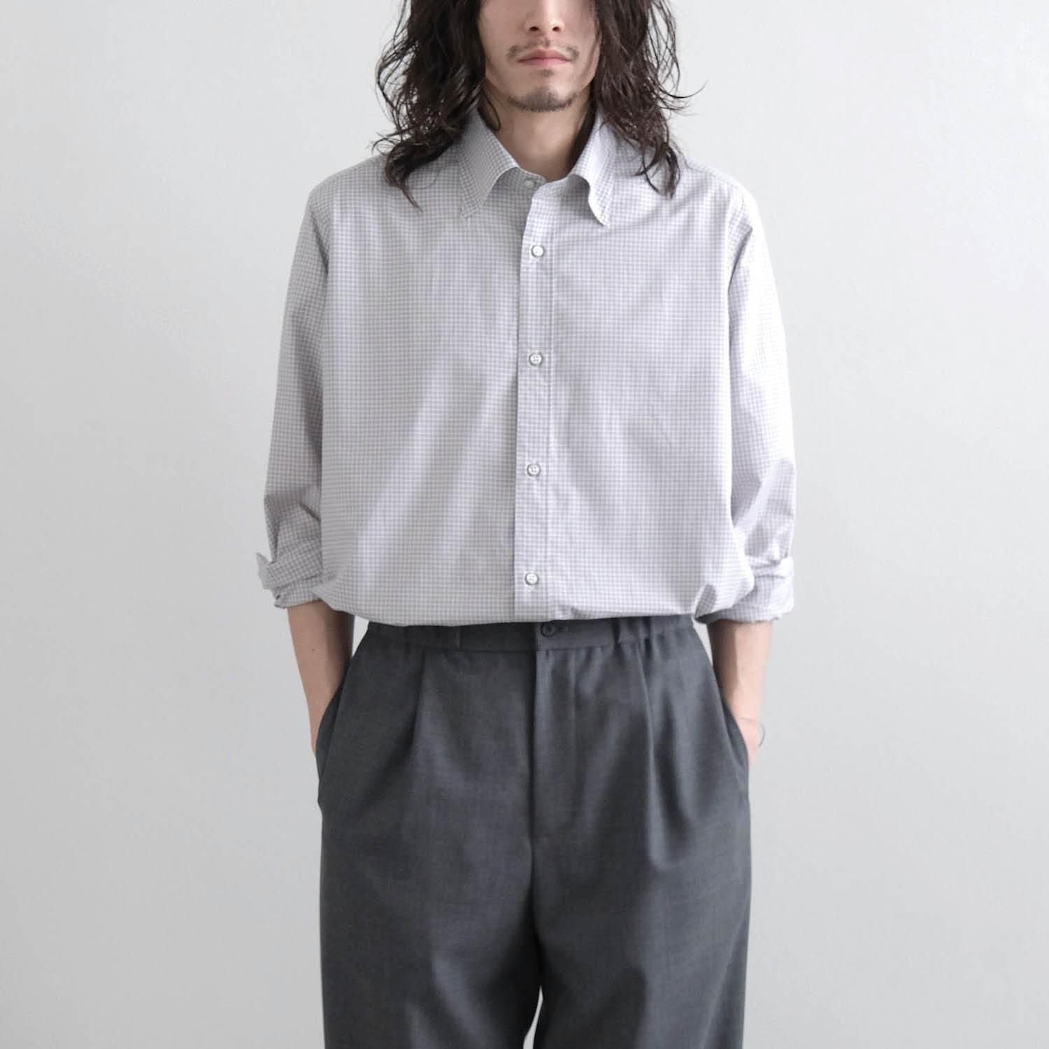 "Saint Gelman" is a regular collar shirt with a hidden button-down design. It has a tough look. using cotton fabric with moderate stiffness and firmness. It is also fun to watch it change over time to a more mature look with repeated wearing and washing. The silhouette has a relaxed feel with careful tailoring reminiscent of a certain long-established French custom-made shirt manufacturer. The square-cut hem and side slits are nice accents to the classic check pattern with fine and deep gray and brown crosses. It is a casual adult piece that you can wear casually with attention to detail such as the hidden snap button button-down design. hanger loop. and front button.