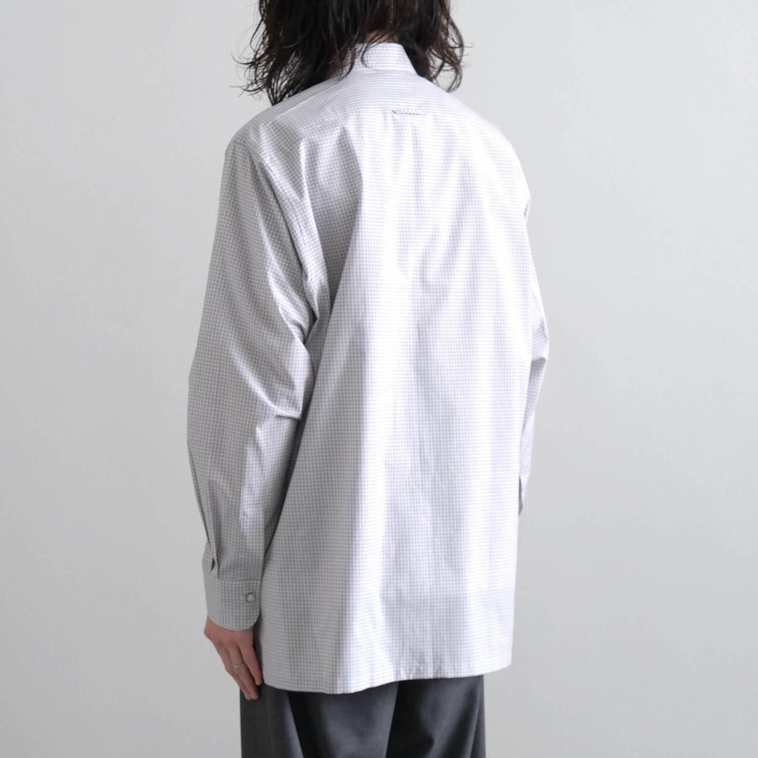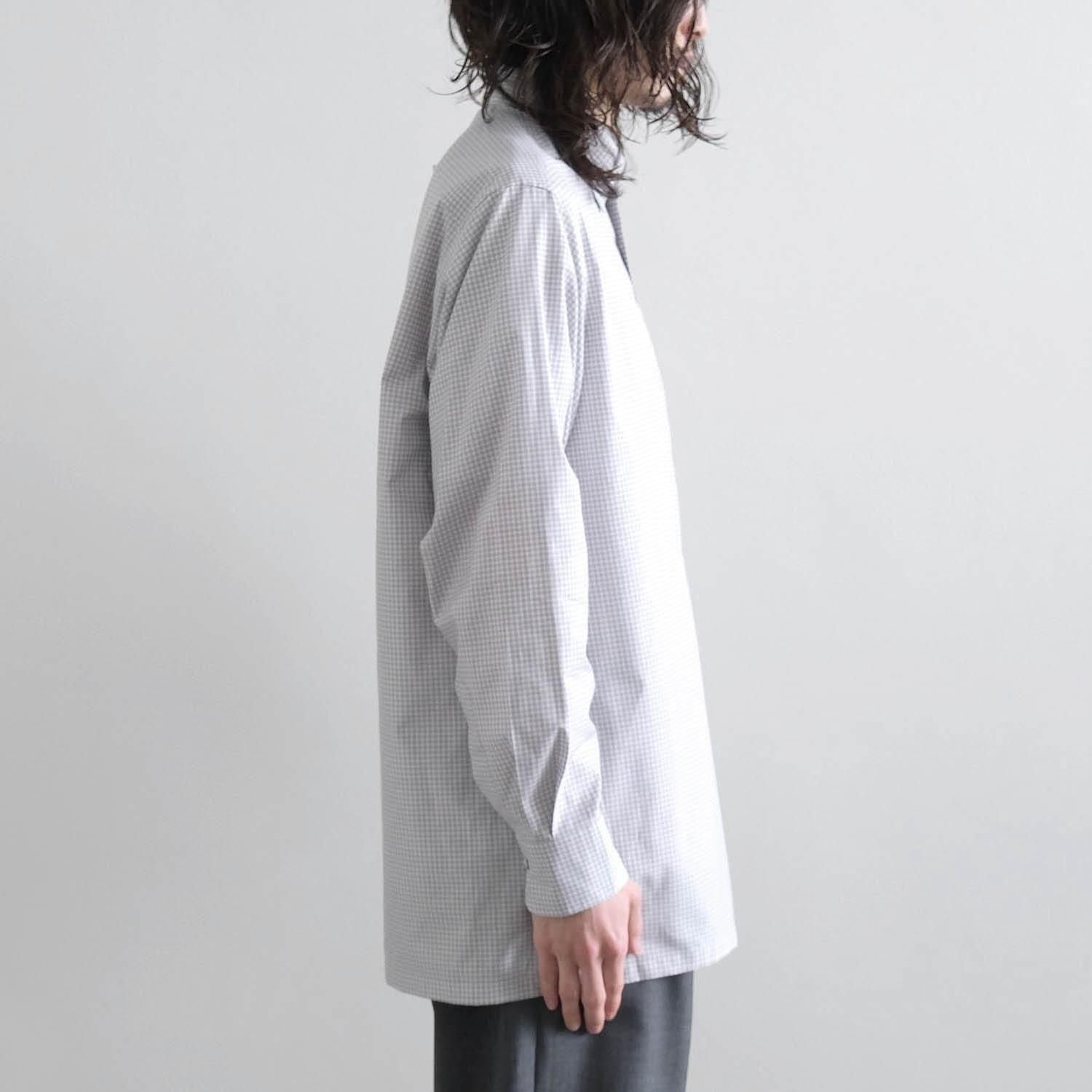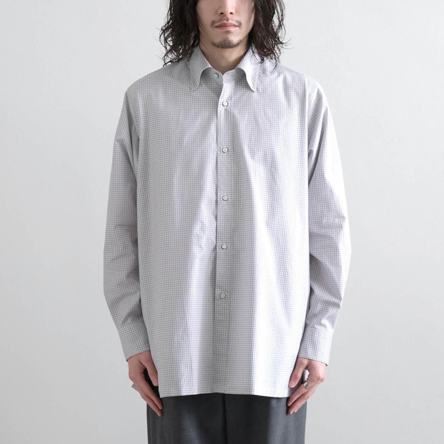 "Saint Gelman" is a regular collar shirt with a hidden button-down design. It has a tough look. using cotton fabric with moderate stiffness and firmness. It is also fun to watch it change over time to a more mature look with repeated wearing and washing. The silhouette has a relaxed feel with careful tailoring reminiscent of a certain long-established French custom-made shirt manufacturer. The square-cut hem and side slits are nice accents to the classic check pattern with fine and deep gray and brown crosses. It is a casual adult piece that you can wear casually with attention to detail such as the hidden snap button button-down design. hanger loop. and front button.